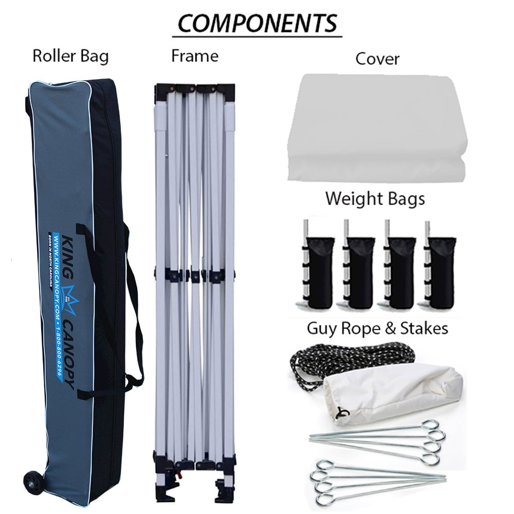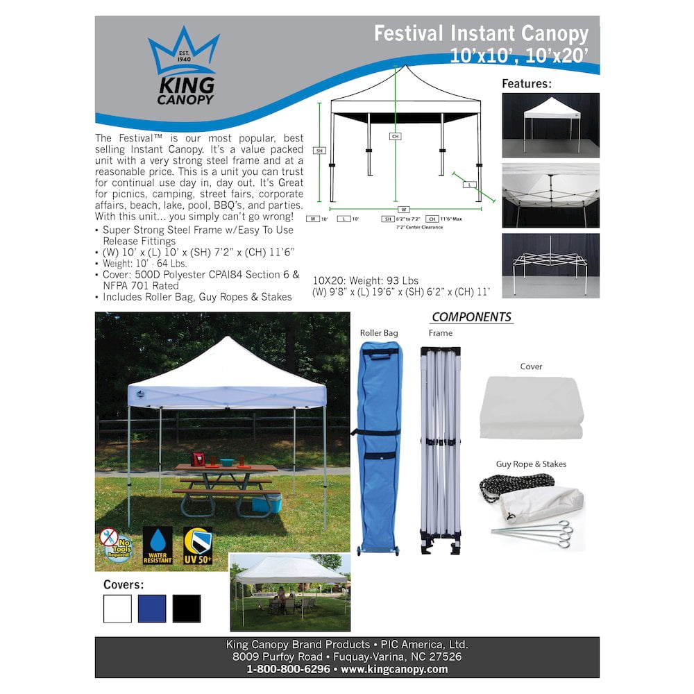 Multi-purpose: 10′ x 10′ canopy footprint with 100 square feet of shade. Perfect for outdoor fun like camping, children’s parties, or birthdays on any surface from the parking lot outside the stadium to the grass at the park. Overall Dimensions: 116 x 116 x 132 Frame and Cover: The all-aluminum commercial grade frame is perfect for any outdoor vendor or trade show. Features a heavy-duty center truss design to provide more roof strength and an upgraded locking system to prevent pinched fingers. The cover is great for providing shade to keep you cool during warm sunny days. This cover is made of 500d Polyester and conveniently folds compact and stores well. Roller Bag: A heavy duty rolling bag is included with all festival pop up canopies. This heavy-duty bag makes transportation of the canopy extremely easy and convenient and is small enough to fit in the trunk of most cars. Warranty: All our canopy components feature a 1-year limited warranty and are warranted to be free from defects in material and workmanship during this time frame. Damages from improper anchoring, strong winds, snow, ice, or rain are not considered defects. Nor does it apply to damage directly related to abuse or neglect whether accidental or deliberate. Since 1940, King Canopy has grown from a small family business to be a Leader in the Manufacturing of Shade and Shelter products all over the world. We are a dedicated team operating with traditional values and respect for the quality and integrity of each of our products. Our mission is to manufacture great products that will provide the highest level of protection from the elements. We Cover the World with Quality, Commitment, and Innovation!