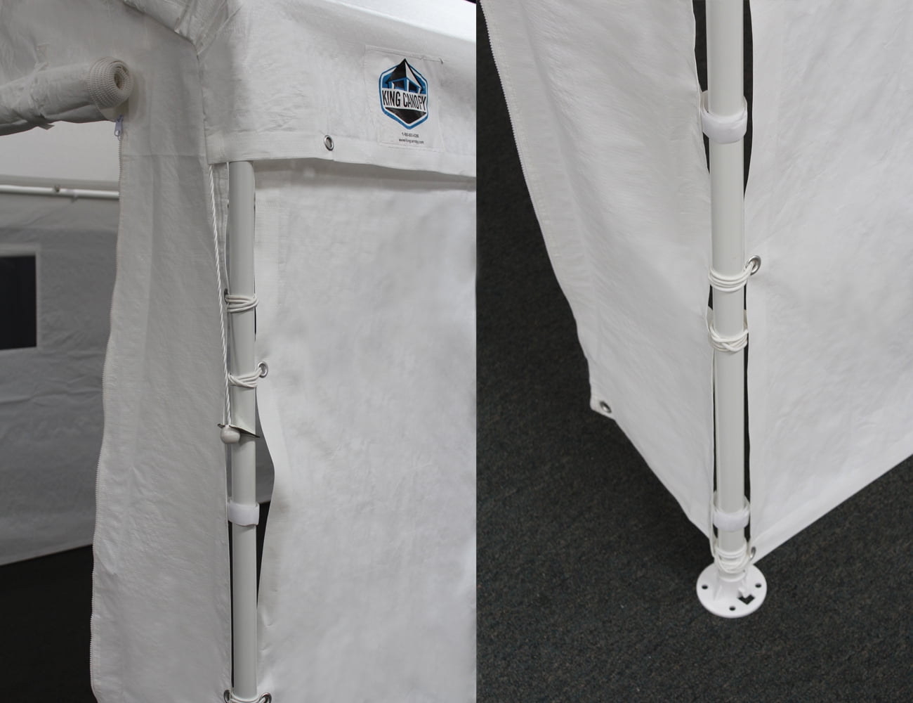 King Canopy Side Wall Kit 10’8″ x 20′ x 0′ White Carport Multi-use design for enclosing your canopy, providing protection from sun, rain, and wind Constructed from durable 180gsm Polyethylene Fits frames measuring 10-Feet 8-Inches by 20-Feet Includes (2) 20-feet long side walls with plastic windows Features (2) 10-feet 8-inch-wide zippered end walls with roll-up doors Comes with 50 ball bungees for secure attachment Replacement parts available for convenience