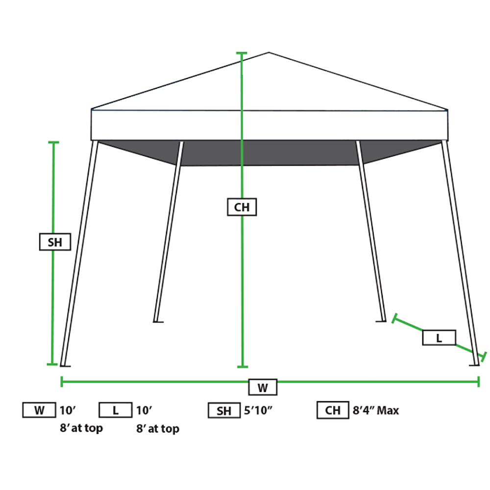 Make your next tailgate, campout, or backyard party more enjoyable with the King canopy Instant Slant Leg Canopy. Value King Slant Leg sets up in minutes with no tools required. Just take the fully assembled frame out of the bag, attach the cover, pull open and snap into position, extend legs and you are done. Breakdown is just as easy with steel frame and thumb buttons to avoid pinched fingers. Slant Leg design provides extra stability. 10-foot by 10-foot footprint and 8-foot by 8-foot cover. White 210D Polyester cover provides an 8-foot 4-inch maximum center height. Includes Carry Bag with extra-long straps allowing for easy transport. 10ft wide x 10ft long(bottom) 8ft wide x 8ft long(top)by 5ft 10in side height by 8ft 4in center peak height.