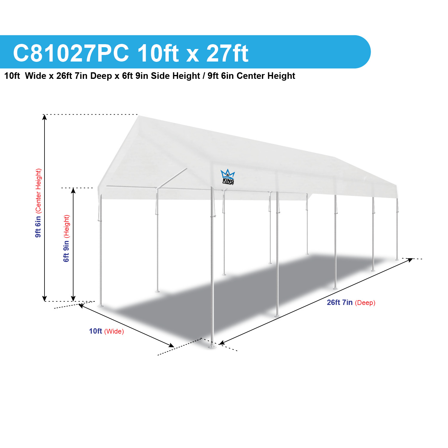 Multi-Purpose: It can be used for any purpose you want. Ideal uses are portable carport, boat shelter, storage shelter, party tent, ETC. Frame and Cover: Frame is made of 1 3/8in diameter powder-coated steel, 10-legs, 180G PE cover. This can help protect your vehicle from some outdoor conditions such as sun, rain, and wind. Dimensions: 10ft 8in wide x 27ft 1in long x 6ft 8in side height x 9ft 9in center peak height. Replacement Parts: King Canopy has replacement parts on hand ready to ship. Warranty: All our canopy components feature a 1-year limited warranty and are warranted to be free from defects in material and workmanship during this time frame. Damages from improper anchoring, strong winds, snow, ice, or rain are not considered defects. Nor does it apply to damage directly related to abuse or neglect whether accidental or deliberate. Since 1940, King Canopy has grown from a small family business to be a Leader in the Manufacturing of Shade and Shelter products all over the world. We are a dedicated team operating with traditional values and respect for the quality and integrity of each of our products. Our mission is to manufacture great products that will provide the highest level of protection from the elements. We Cover the World with Quality, Commitment, and Innovation!