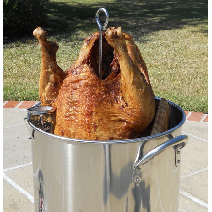 - Includes lid, turkey rack, a lifting hook, and a deep fry thermometer