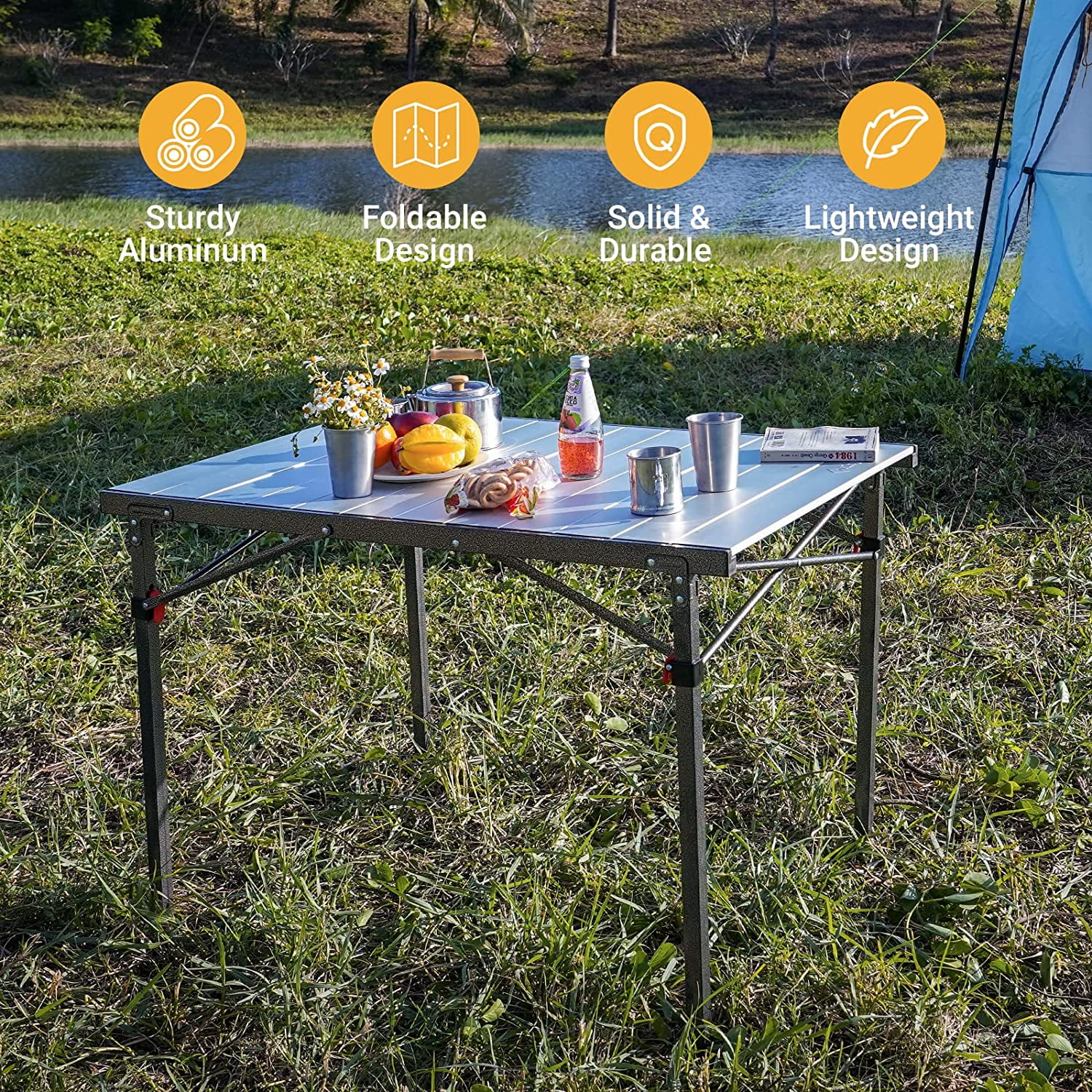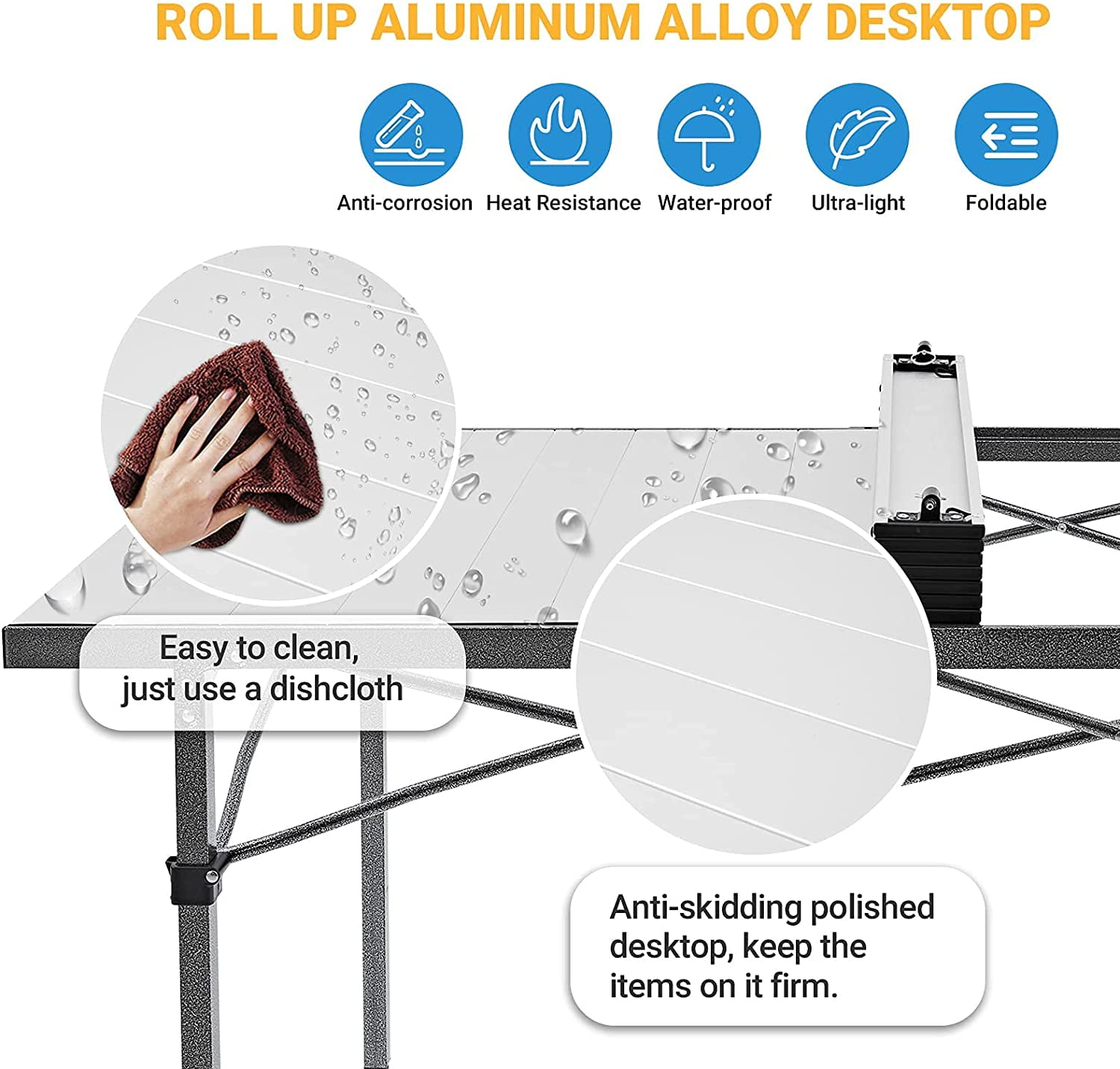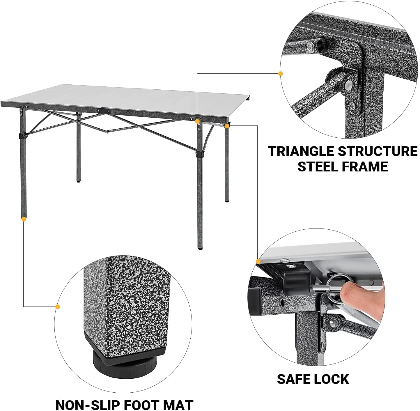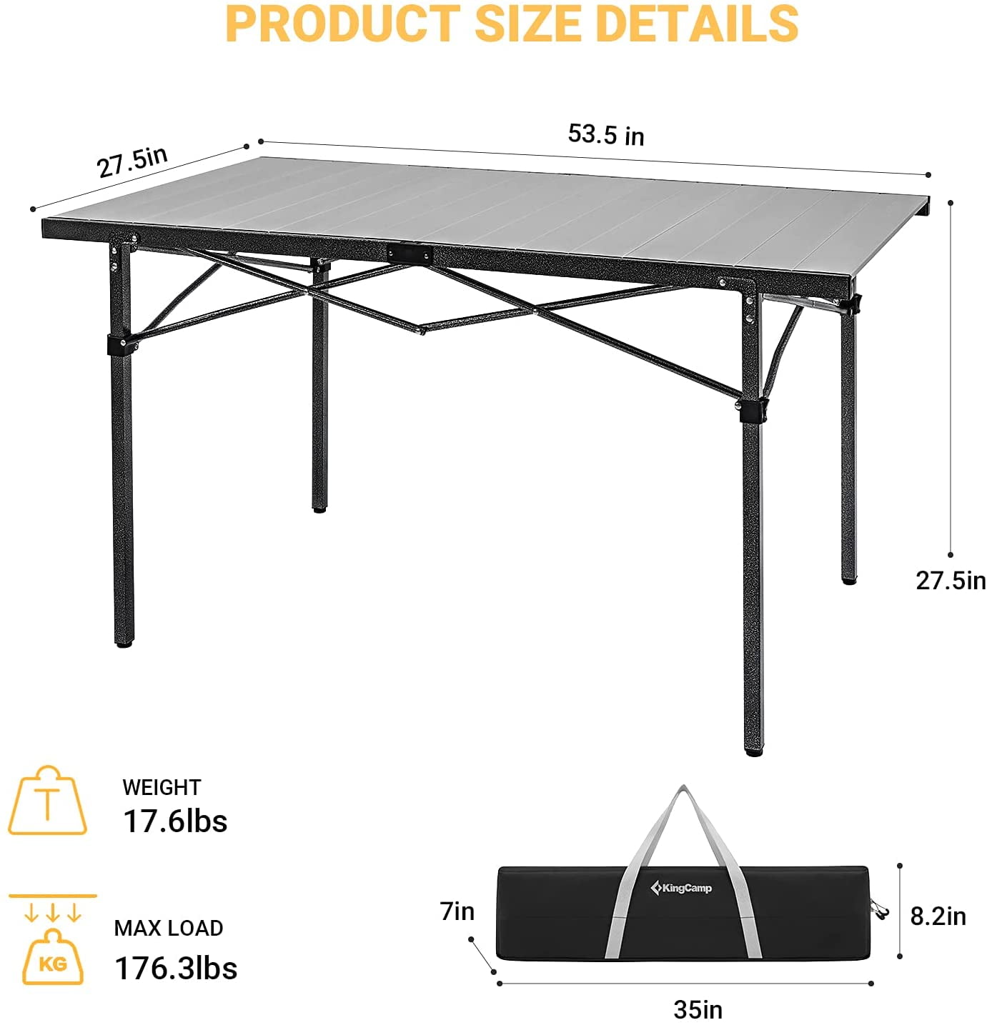 【Multi-functional design】This camping aluminum table is practical for various outdoor activities like camping, picnic, and BBQ. It is lightweight and easy to carry with dimensions size 136x70x70cm (53.5X27.5X27.5in) , unfolded size 89x21x18cm (35X8.2X7in) when folded,weight 8kg(17.6lbs). 【Stable structure】The wide seamless design of the tabletop prevents small items from falling and adds a touch of sophistication, making the folding table convenient to use. The steel pipe has a special sandblasting spray process and a safety lock buckle structure, along with a double safety locking mechanism and stable support. The unique shape of the steel pipe provides strength, and the half-open three-dimensional design of the tabletop increases support and durability. The stable triangular hinge structure provides high support and stability, support to 176.3lbs. 【Durable material】The aluminum alloy tabletop is lightweight, anodized, and corrosion-resistant, waterproof, making the camping table easy to clean and durable. The combination of aluminum alloy and steel pipe design with a lowered center of gravity provides overall stability. 【Humanized design】The table legs have non-slip foot pads suitable for different scenarios, making them convenient and durable. The foldable tabletop reduces storage volume and is easy to carry. The external bag has a separate compartment design to store the stand and tabletop separately for easy use. 【Wide application】This camping aluminum table is suitable for various outdoor activities such as camping, picnic, and BBQ, as well as home, office, and commercial use.