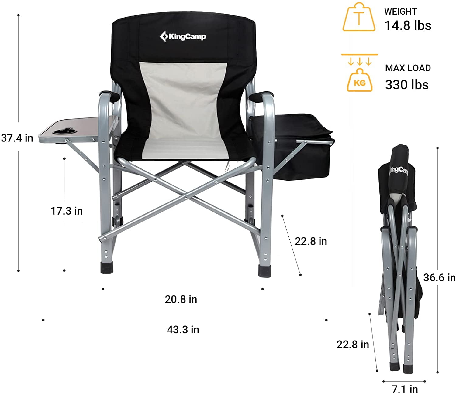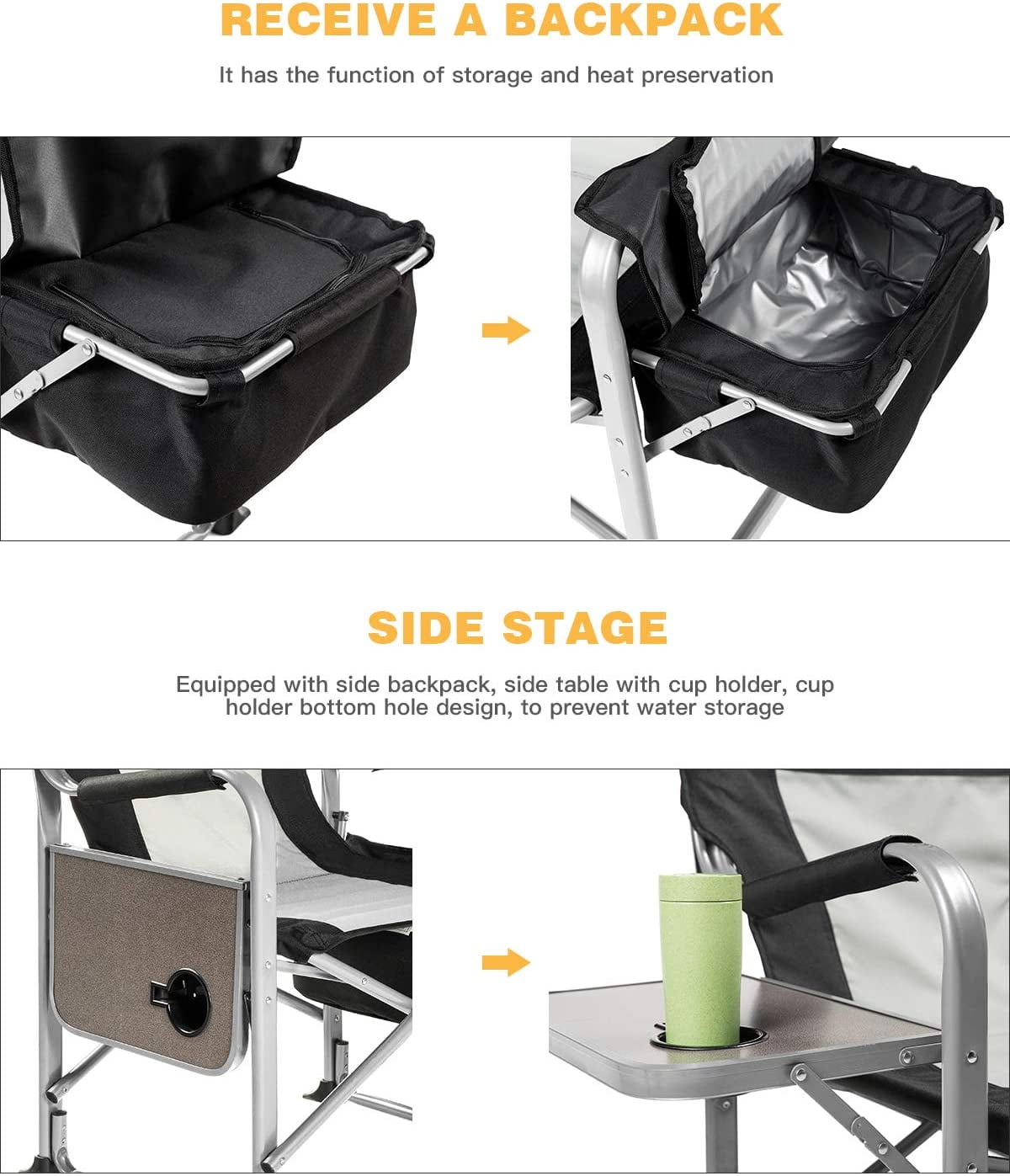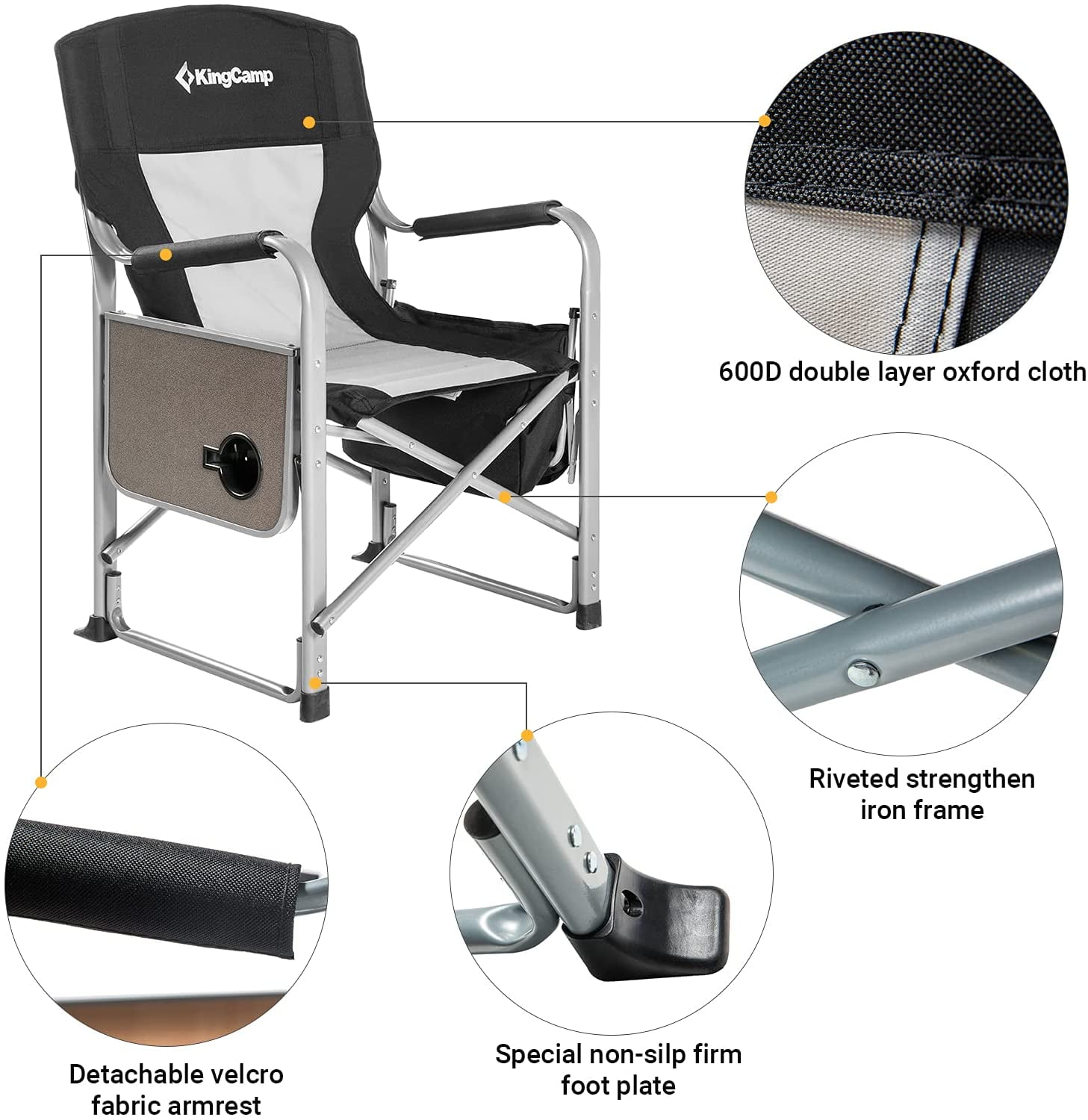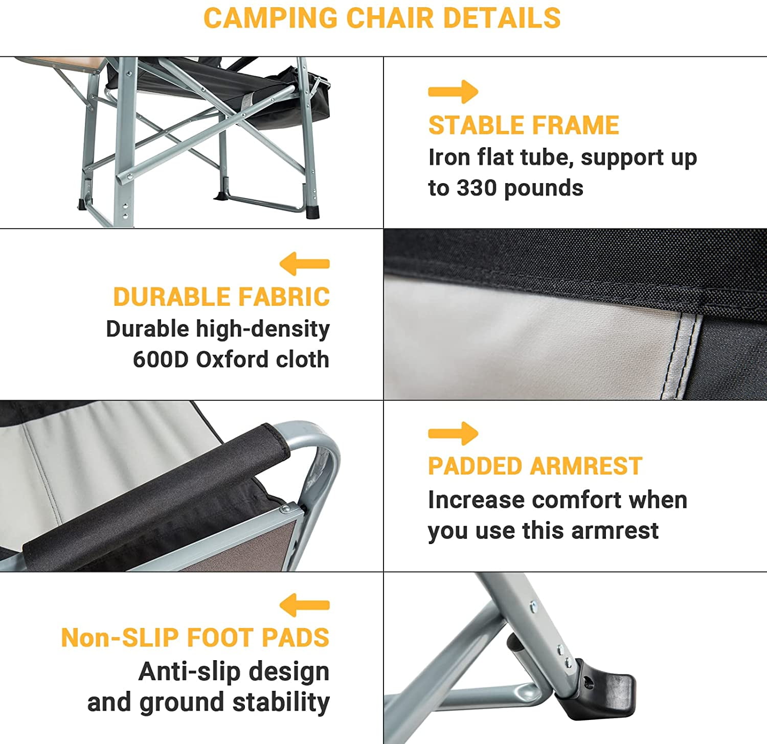 【Heavy-Duty & Durability】 Engineered with a high-strength steel frame featuring a reinforced flat-tube structure, this diector camping chair offers exceptional durability and stability. The U-shaped support legs and cross-triangle stability design of the heavy duty camping chair enhance the load-bearing capacity, ensuring a sturdy seating experience. The anti-slip foot caps ensure stability on different surfaces, while the durable Oxford fabric seat withstands wear and tear. Designed to support up to 330 lbs, the outdoor chair is deal forall types of people during outdoor activities.【Unmatched Comfort】 Experience comfort with soft double-layer padded backrest and seat, the addition of a padded cotton cover on the hard armrests further enhances comfort, the integrated side table with a cup holder provides convenient storage for your essentials, the cooler bag is on your left side to keep food or beverage in a temperature, enhancing your outdoor experience, making the camp chair ideal for extended outdoor relaxation.【Foldable & Portable】The full-folding frame design reduces the size, making the folding camping chair incredibly portable. The lightweight construction and compact folded dimensions of our director chair ensure easy transport and storage, fitting seamlessly into your car trunk or storage space.【Various Outdoor Activities】This director chair for camping is perfect for a variety of outdoor activities, including camping, fishing, picnics, and attending sports events.【Customer Service】The camping chair with a 12-month warranty, If any part of the director chair is lost or damaged, please contact us promptly, our team will try our best to help you. 【Unmatched Comfort】 Experience comfort with soft double-layer padded backrest and seat, the addition of a padded cotton cover on the hard armrests further enhances comfort, the integrated side table with a cup holder provides convenient storage for your essentials, the cooler bag is on your left side to keep food or beverage in a temperature, enhancing your outdoor experience, making the camp chair ideal for extended outdoor relaxation. 【Foldable & Portable】The full-folding frame design reduces the size, making the folding camping chair incredibly portable. The lightweight construction and compact folded dimensions of our director chair ensure easy transport and storage, fitting seamlessly into your car trunk or storage space. 【Various Outdoor Activities】This director chair for camping is perfect for a variety of outdoor activities, including camping, fishing, picnics, and attending sports events. 【Customer Service】The camping chair with a 12-month warranty, If any part of the director chair is lost or damaged, please contact us promptly, our team will try our best to help you.