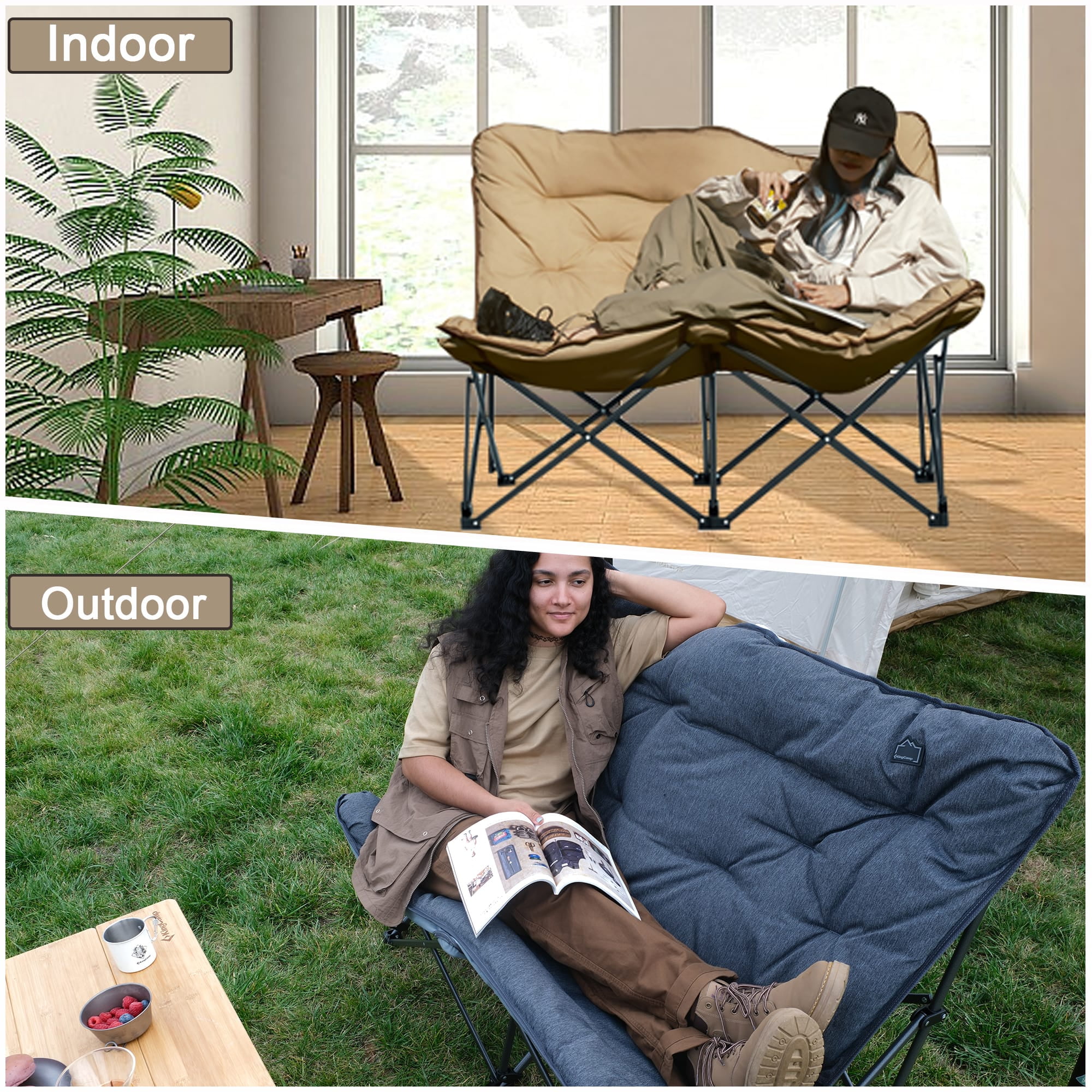 【Sturdy and Stable Folding Chairs】The special triangular stability structure not only provides a strong and stable support, but also makes the camping chairs easy to fold. Our butterfly lawn chairs can support up to 600lbs for two adults, and weigh only 18.7lbs, ensuring a safe user experience. 【Ergonomic Design】Our loveseat chair with ergonomic design, thickened cotton filling cushion + 36.2in high backrest + larger size: 52*31.9*37inch offer additional comfort, allowing you to sit cross-legged or sideways, promoting relaxation while enjoying your camping experience. This sofa chair is perfect for outdoors and indoors. 【Easy to Set Up】You can set up this butterfly chair in seconds, no tools needed. Just need to pop the outdoor chair open and attach the seat fabric. The chair and bracket can be separated, easy to carry. When you don’t use the camping chair, just fold it in the corner. And the detachable seat can be thrown directly into the washing machine for cleaning. Cleaning camping chairs is no longer a difficult task! 【Indoor or Outdoor】This portable folding chairs is perfect for family camping. The loveseat chair can be used not only as a camping chair, but also as a lazy sofa chair for indoor and bedroom. Our camping chair is perfect for camping, fishing, sporting events, lawns, gardens, yards, outdoor activities, and sunbathing outdoors or reading indoors. 【Satisfactory Service】KingCamp provides the best experience for all customers. The camping chairs with a 12-month warranty, If any part of the chair is lost or damaged, please contact us promptly, our team will try our best to help you.