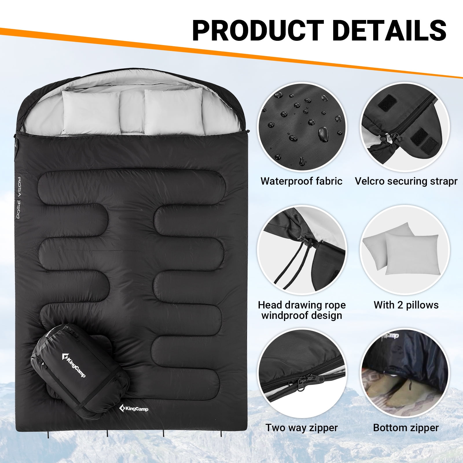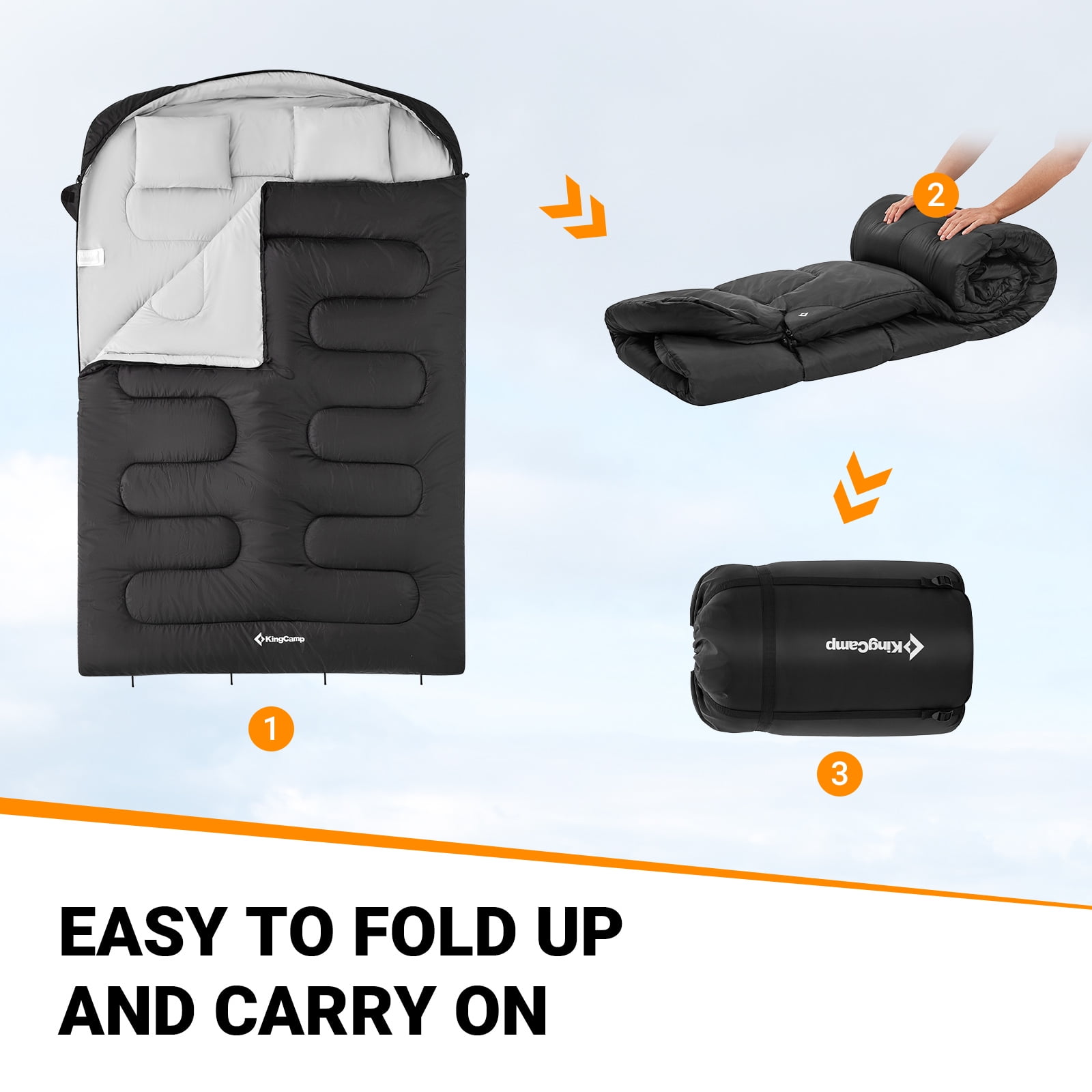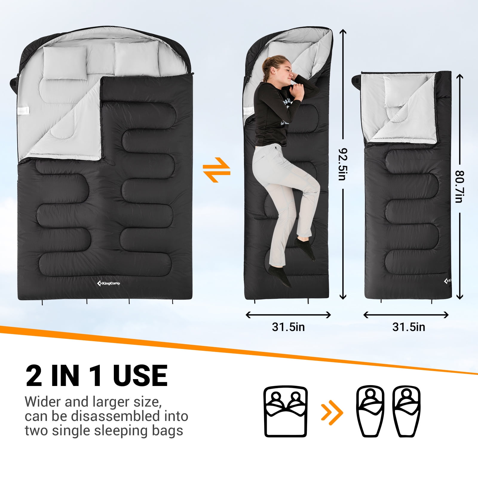 【2-in-1 Double Sleeping Bag】This spacious black sleeping bag can be separated into two single sleeping bags, giving you the flexibility to customize your sleeping arrangement. With an extra-large size 92.51L*62.99W, you’ll have plenty of room to move around comfortably. And for added comfort, the sleeping bag comes with two pillows filled with warm and soft spring-like polyester. 【Durable& Cozy】Our KingCamp camping sleeping bag for adult is made of 100% polyester fiber and featuring a water-resistant design 【Unique Designed】 This KingCamp sleeping bag features a windproof zipper flap to keep chilly drafts at bay. The square-shaped design provides ample space for your legs and feet to move around, ensuring maximum comfort. The water-repellent fabric is soft and cozy 【Convenient Designed】The sleeping bag comes with two convenient straps on the bottom for easy hanging storage when not in use. With a two-way separating zipper on one side, getting in and out is a breeze. CUSTOMER GUARANTEE:This sleeping bag comes with 12-monthes warranty, and a 100% satisfaction guarantee. If you have any questions, please contact us directly.