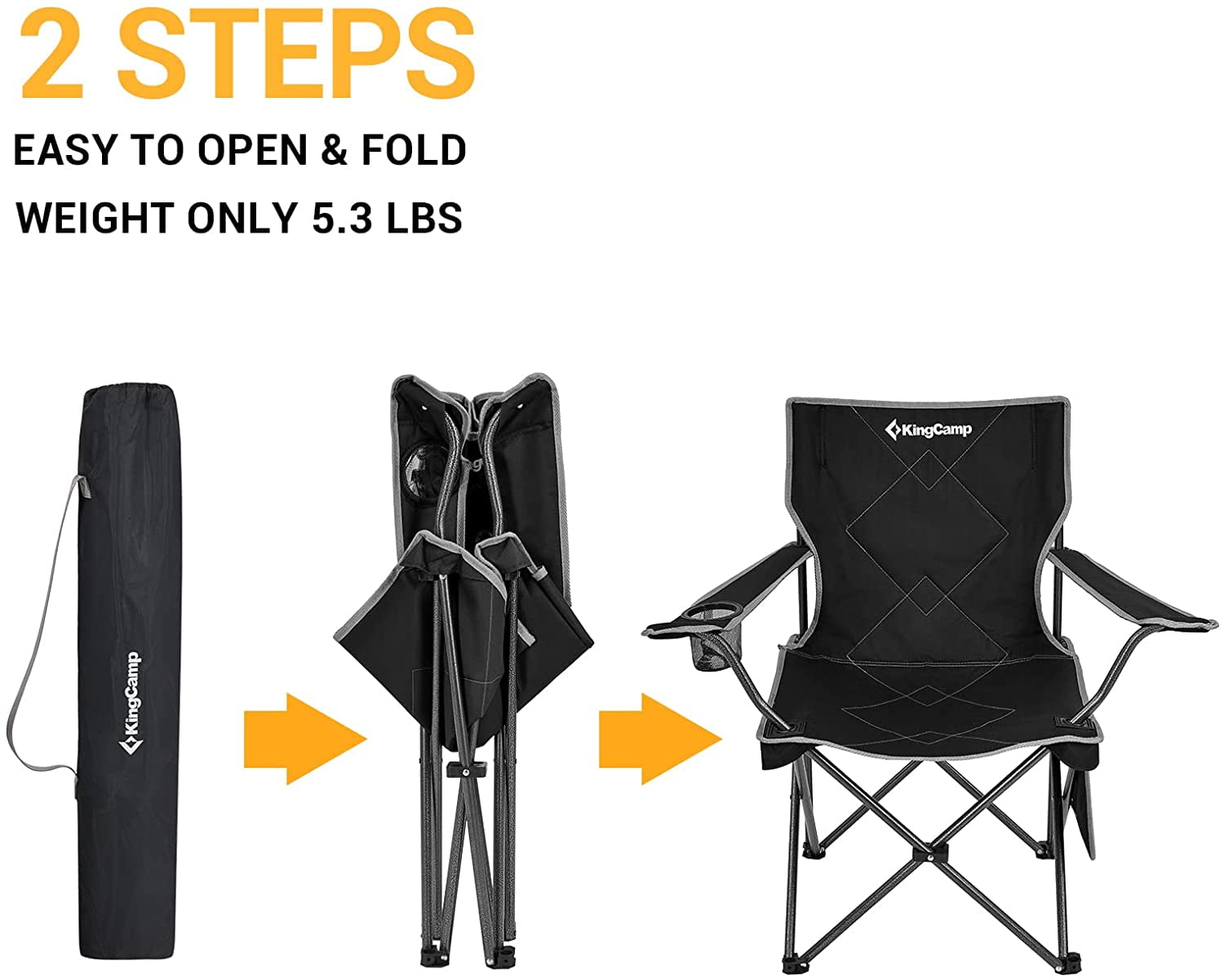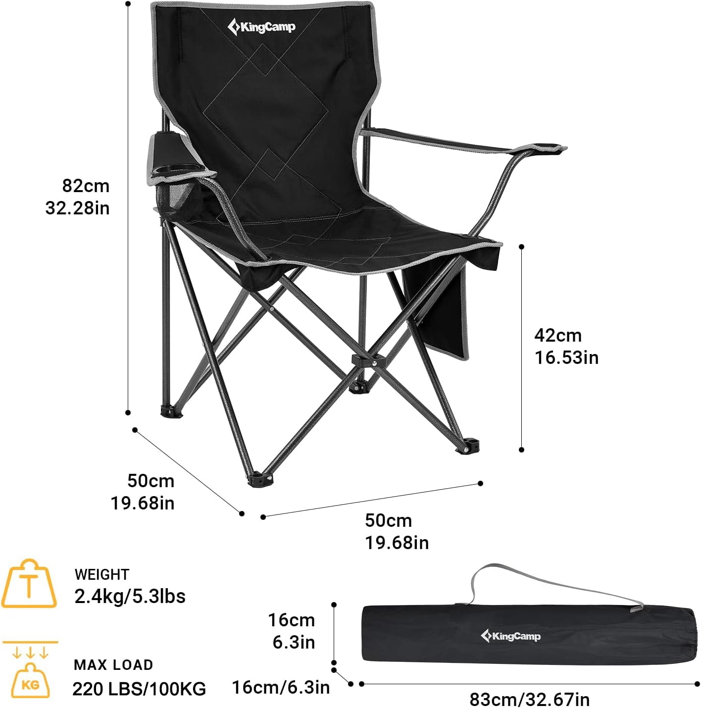 【Super Comfortable】The KingCamp camping chair measures 19.68″x19.68″x32.3″, perfectly fitting most individuals. The upgraded double-layer backrest and armrests of our outdoor chairs offer ultimate softness and comfort. The pre-curved support structure of the ergonomic high back provides perfect support for your back. Whether for extended periods of sitting or outside activities, this outdoor chair is your ideal choice. 【Durable and Stable】Our folding chair features a steel tube frame and tear-resistant Oxford fabric, ensuring long-lasting durability. The triangular support structure enhances stability of the lawn chair is easily supporting up to 220 pounds for adults. Equipped with anti-slip foot covers, the camp chairs adapt to various ground conditions, allowing you to use outdoors with confidence. 【Extra Storage Space】The armrests of folding chairs for outside are designed with cup holders for carrying water bottles or beverages. Side storage bags allow you to store small items such as personal belongings, providing convenience outdoors. 【Lightweight and Portable】The foldable camping chair measuring just 6.3″x6.3″x32.6″ and weighing only 5.3 pounds, can be easily folded into a compact size and comes with a storage bag, making convenient to carry with you wherever you go. 【Versatile Usage Scenarios】Whether camping, hiking, traveling, fishing, or watching sports events, this portable bag chair provides comfortable support for all your outdoor activities.