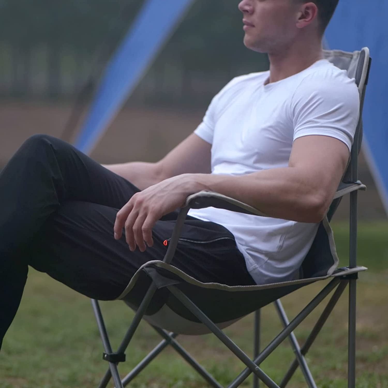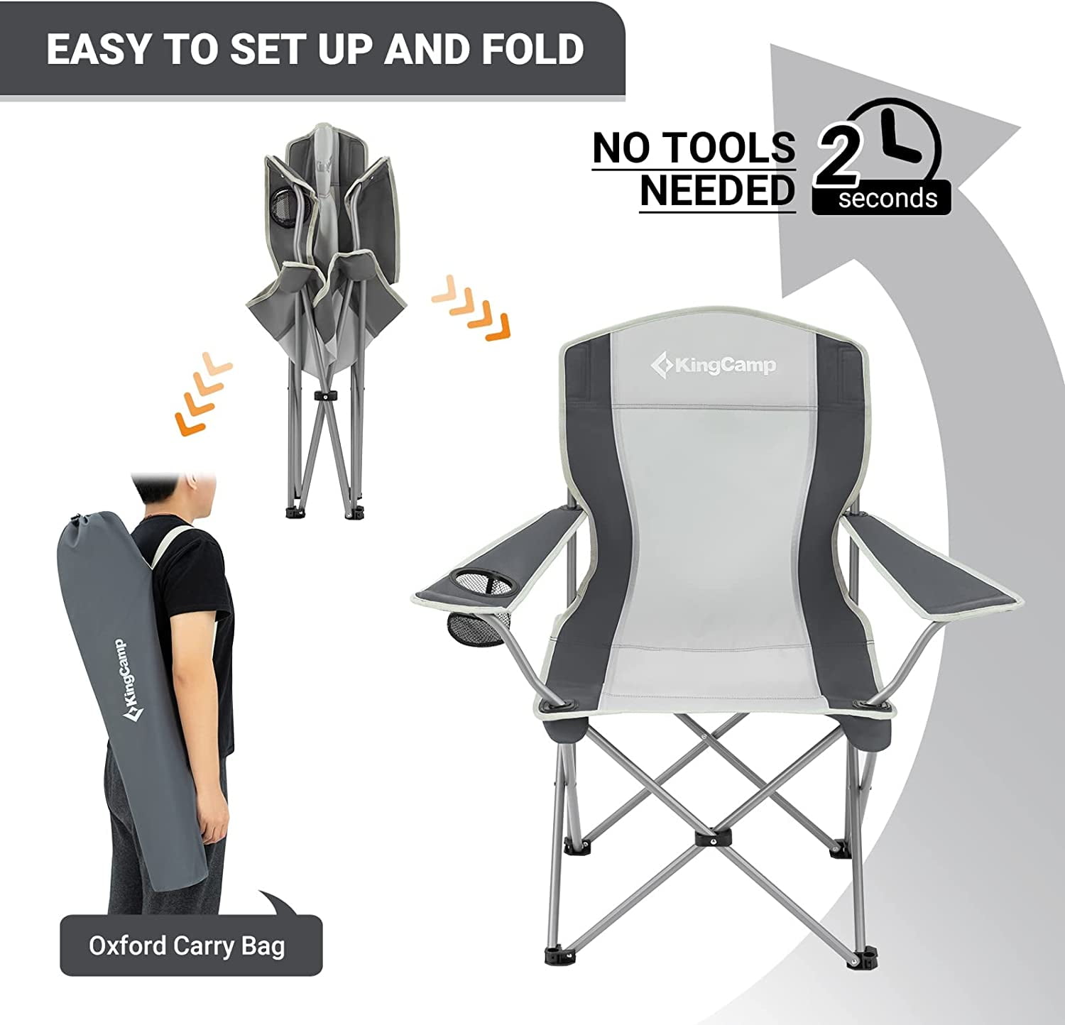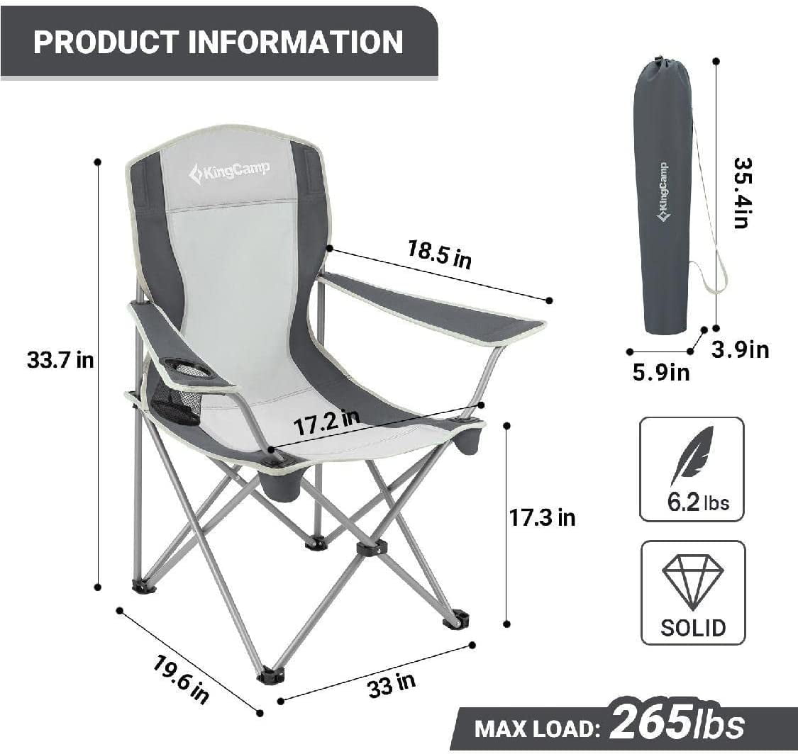 【Lightweight and Easy Storage】This black/grey folding camping chair is easy to set up and fold in seconds. It collapses down to just 5.9″ x 35.4″ and weighs only 5.7 lbs that can be stored almost anywhere. 【Comfortable Design】With adjustable armrests and soft polyester back, this lightweight camping chair ensures your ultimate comfort, and lengthen back to keep your neck comfortable. The cup holder keeps your drinks close. 【Durable and Stable】600D oxford fabric and powder coating steel frame make the folding quad chair extra durable and stable, it can support up to 120 kg / 265 lbs. 【Multi-pupose】The KingCamp camping chairs are great for all types of outdoor activities, from lounging at the beach to sitting by a late night campfire or tailgating, fishing.