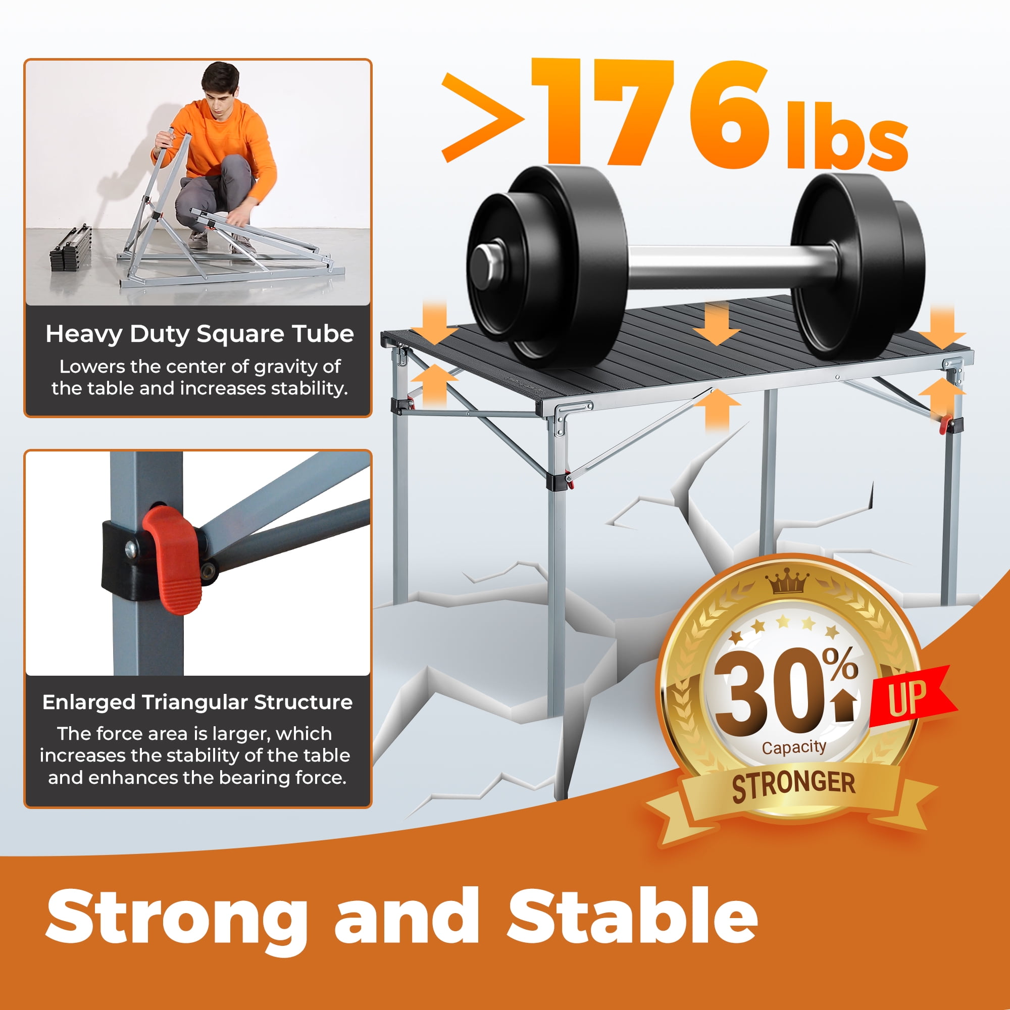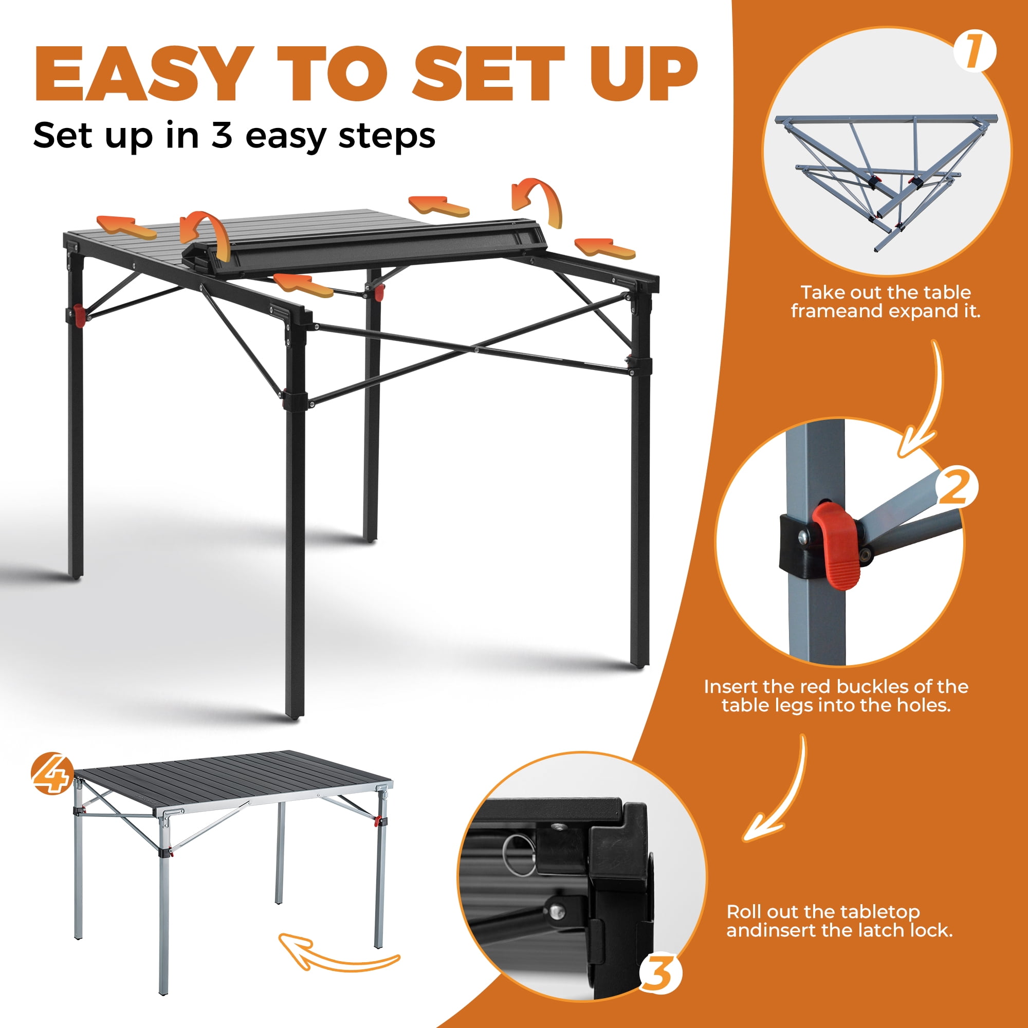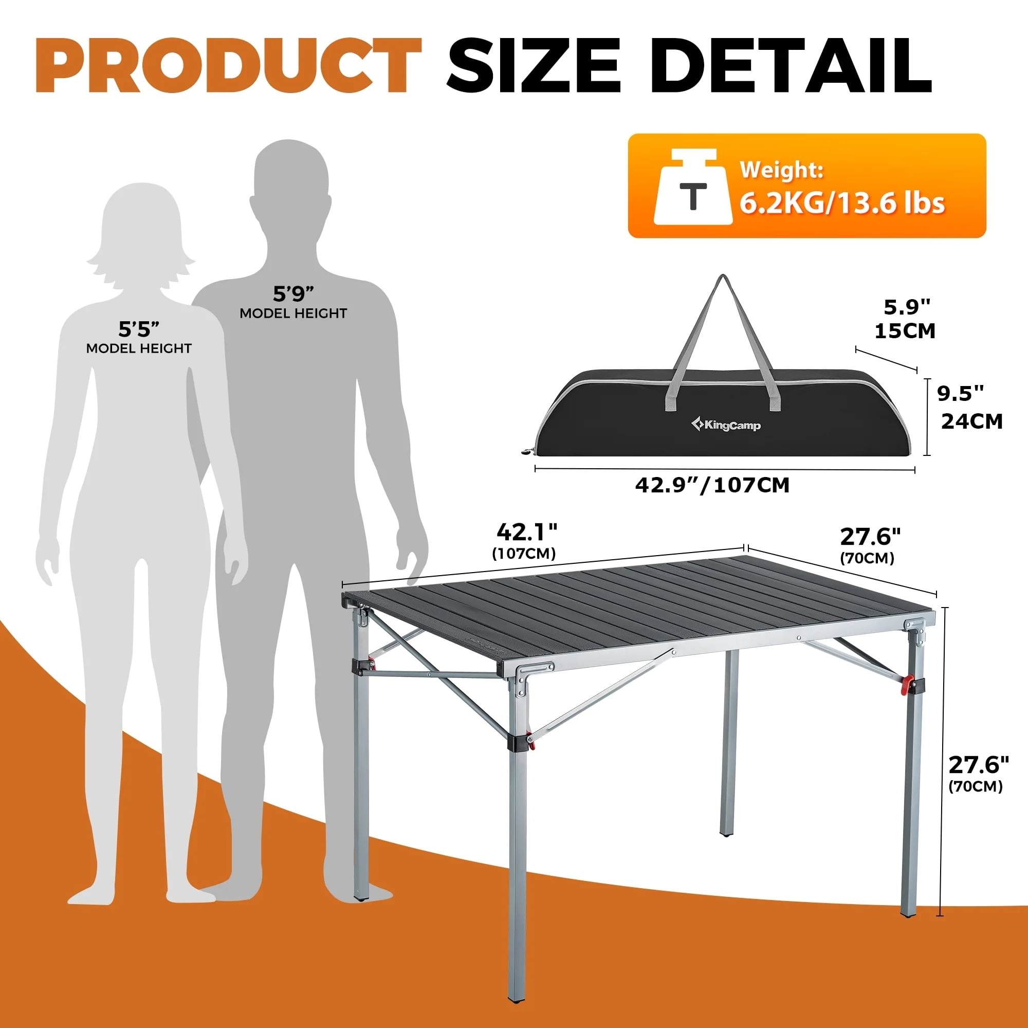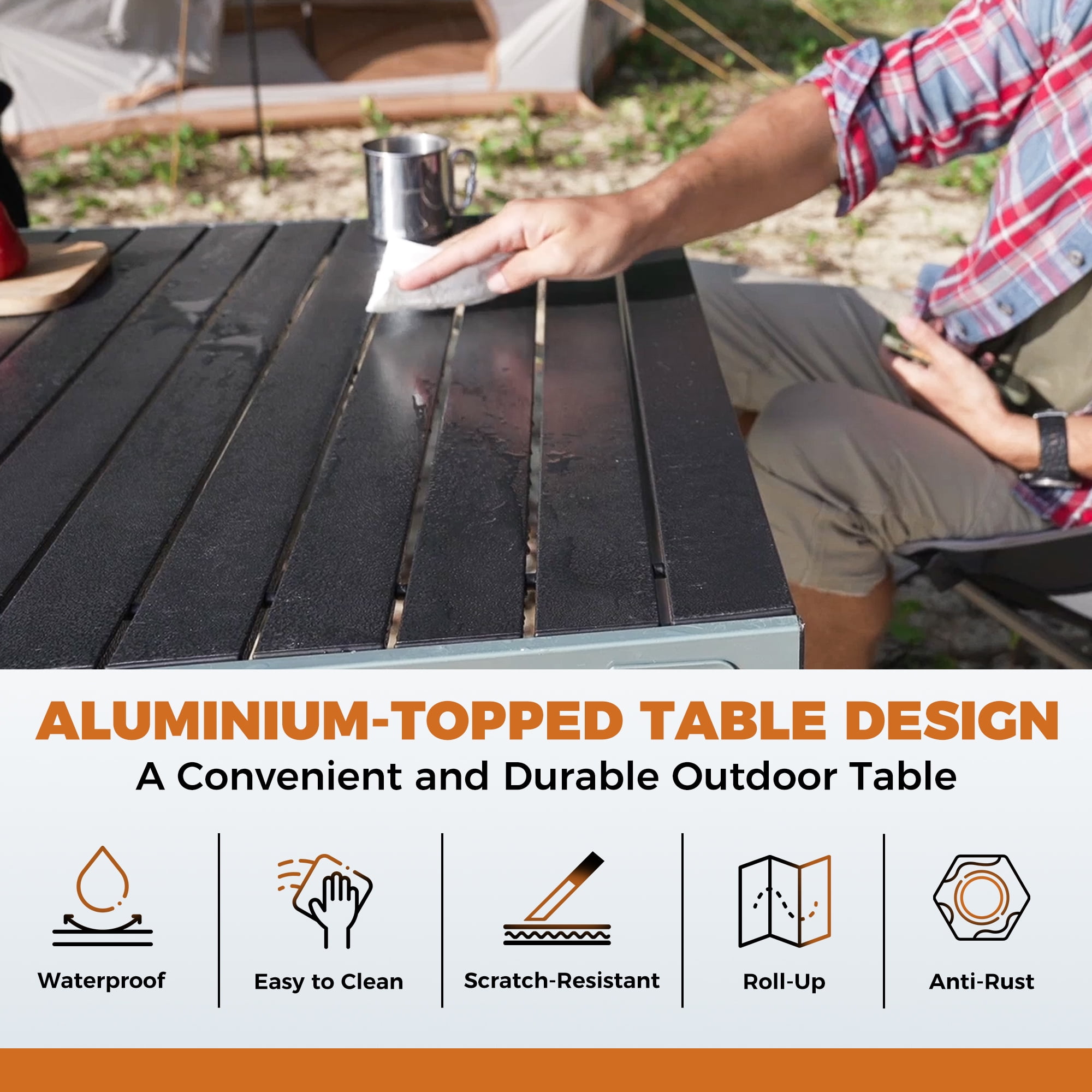 【Family Size Folding Camping Table】The aluminum camping table spacious desktop area (42.1 × 27.6 inches) is large enough for 4-6 people. 27.6 inches height and triangle structure stent design of KingCamp table can give you enough and comfortable space to put your legs. 【Portable Lightweight Camping Table】The foldable camp table that fold up lightweight only 14.6 lbs and after folded the size is 42.5 × 9.1 × 4.3 inches, which make the large table portable and light enough to be carried around your trip, fits most car trunks. The carry bag for fold up table will be easy to take with the handle. 【Durable Aluminum Camping Table】This outdoor camp table is made of thicker aluminum alloy and anodized treatment, which is rust free, corrosion-resistant, easy to clean. The outdoor grill table adopts metal material contact point and triangular steel structure design to ensure stable use. 【Multifunctional Folding Table】KingCamp portable camping table has multifunctional uses, both indoor and outdoor, including picnic table, beach table and camping kitchen table, which are used for camping, beach, tourism, sports events,RV outside and fishing. 【Easy To Assemble Roll Up Camping Table】 With the split type design for the board and bracket, the portable folding picnic table top can be rolled up and the steel frame with safe lock can be folded, so it is easy and safe to install or fold at anytime to help you save much time.