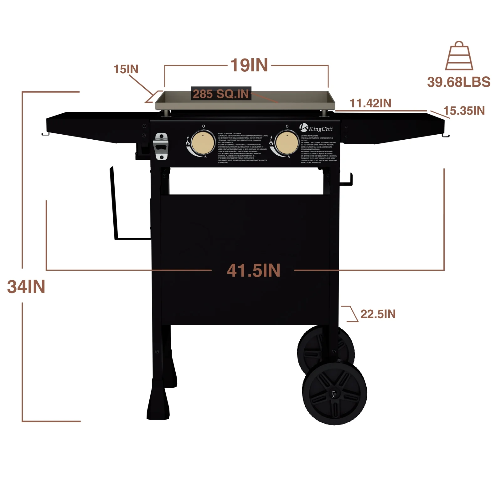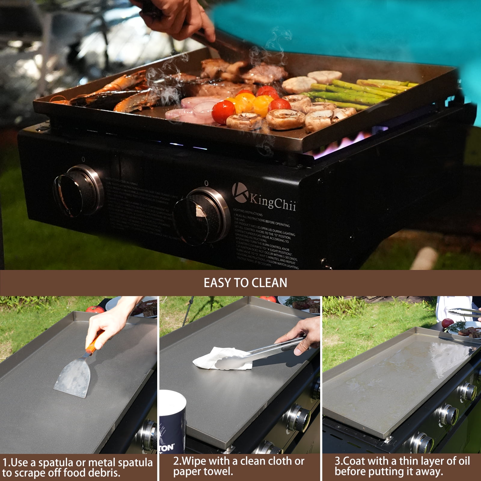 KEY FEATURES: 【Large Cooking Area】 The Kingchii propane griddle, with its 19” surface, offers 285 square inches of space, accommodating up to 14 burgers or 10 pancakes, making it ideal for both large and small gatherings. 【Multifunctional Cooking】 This griddle allows for a wide range of dishes across all meals, from pancakes and grilled cheese to traditional barbecues, ensuring a diverse menu for any time of the day. 【Consistent Heat Distribution】 With three independently controlled burners delivering a total of 19,800 BTUs, this griddle excels in maintaining consistent temperatures across its entire surface. This exceptional heat distribution capability ensures that you can prepare multiple dishes simultaneously at their optimal temperatures. Whether you’re searing steaks, sautéing vegetables, or grilling delicate seafood, the griddle’s superior even heating guarantees precise control over each cooking zone, allowing you to achieve perfect results every time. 【Easy to Clean】 Designed with a rear grease management system, it simplifies grease disposal, channeling food debris and grease into a rear cup for straightforward cleaning. 【Folding & Convenient Shelves】 Equipped with shelves on both sides, these hold your spices, condiments, plates, and tongs, while also serving as prep stations for seasoning burgers or chopping vegetables. Designed for convenience, they fold down easily for storage and transport. The handy towel bar provides quick and easy access to paper towels, and hooks on the side ensure your cooking utensils are always within reach. SPECIFICATIONS: Brand: KingChii Model: KC1995E2 Special Feature: Utensil Hook, Wheels, Side Shelf Frame Material: Metal Installation Type: Free Standing Fuel Type: Propane Color: Black PACKAGE INCLUDES: 1 x Griddle 1 x Accessory Kit 1 x Mamual