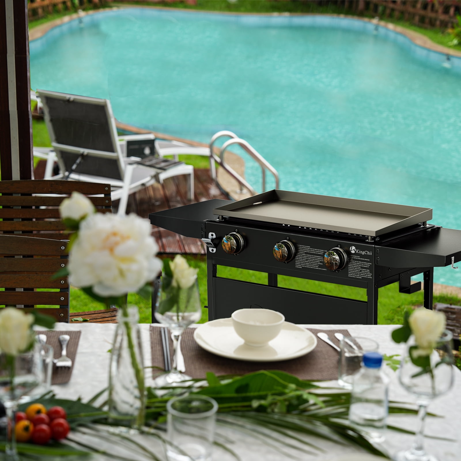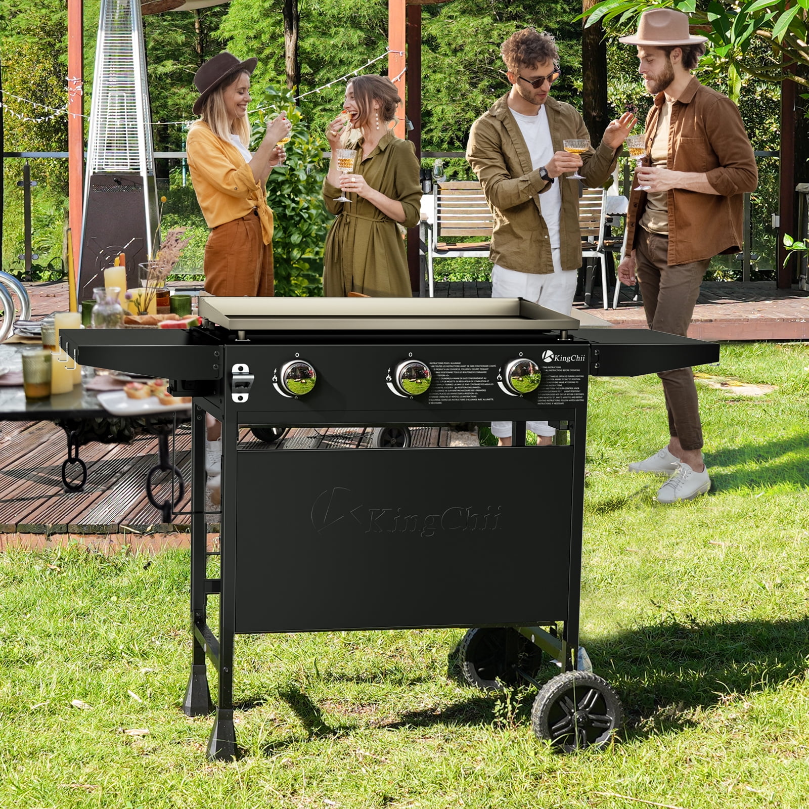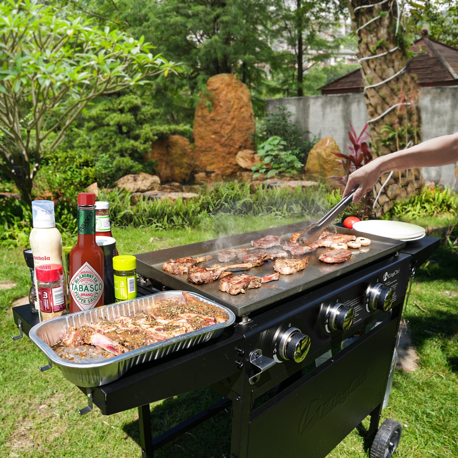 【Large Cooking Area】 The KingChii 28-inch propane griddle offers a spacious 420 square inches of cooking space, capable of grilling up to 25 burgers or 15 pancakes at once, making it perfect for family gatherings or large events. 【Multifunctional Cooking Platform】 From pancakes for breakfast to grilled cheese sandwiches for lunch and traditional barbecue for dinner, this griddle covers all your cooking needs, allowing you to prepare a variety of meals throughout the day. 【Consistent and Powerful Heat Control】 With three independently controlled burners delivering a total of 29,700 BTUs, the griddle ensures even heat distribution across the entire surface. Whether you’re searing steaks at high heat or gently grilling seafood at a lower temperature, you can precisely manage each cooking zone for perfect results every time. 【Easy to Clean】 The rear grease management system simplifies cleanup by channeling food debris and grease into the rear cup, making maintenance quick and hassle-free. 【Convenient Folding Side Shelves】 Two side shelves provide ample space for storing seasonings, plates, and tools, and can double as prep stations for handling ingredients. The foldable design makes it easy to store and transport, offering added flexibility and convenience. 【Practical Extra Features】 The griddle is equipped with a towel bar, bottle opener, and hooks for enhanced usability. Whether grabbing a paper towel or hanging your cooking tools, these thoughtful additions make your outdoor cooking experience even more efficient and enjoyable. SPECIFICATIONS: Brand: KingChii Model: KC1995C3 Special Feature: Utensil Hook, Wheels, Side Shelf Frame Material: Metal Installation Type: Free Standing Fuel Type: Propane Color: Black PACKAGE INCLUDES: 1 x Griddle 1 x Accessory Kit 1 x Mamual