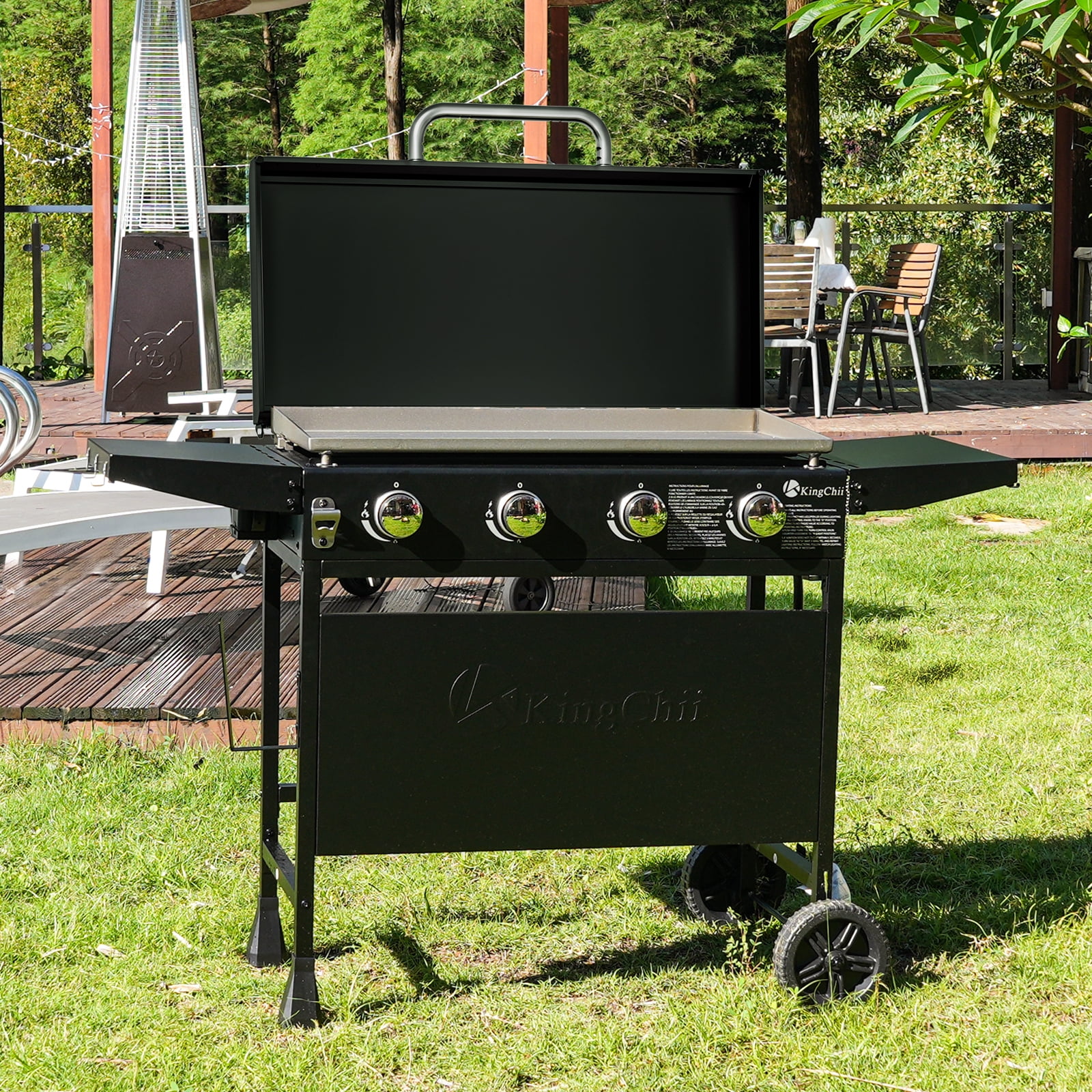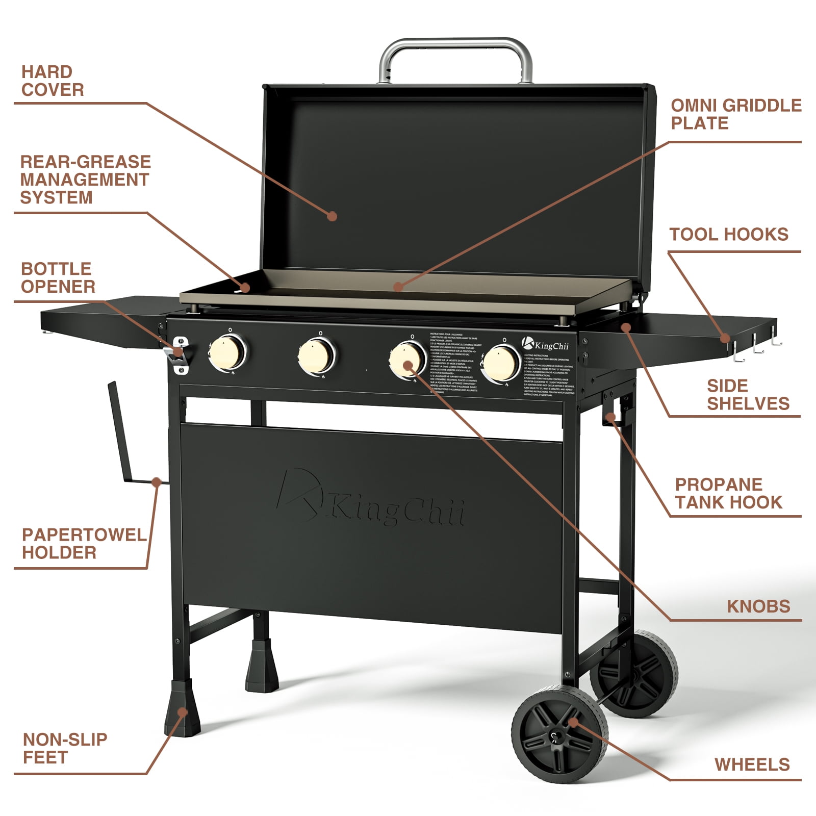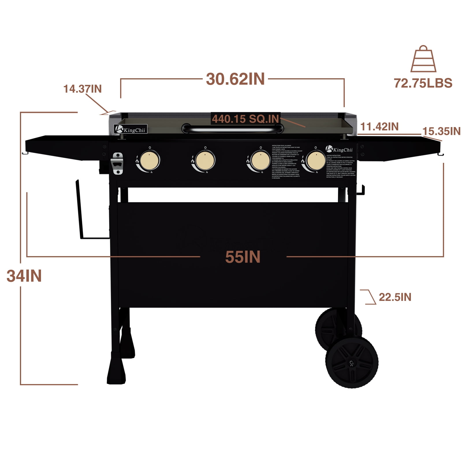 【Large Cooking Area】 The KingChii 32-inch propane griddle offers a spacious 480 square inches of cooking space, capable of grilling up to 30 burgers or 21 pancakes at once, making it perfect for family gatherings or large events. 【Multifunctional Cooking Platform】 From pancakes for breakfast to grilled cheese sandwiches for lunch and traditional barbecue for dinner, this griddle covers all your cooking needs, allowing you to prepare a variety of meals throughout the day. 【Consistent and Powerful Heat Control】 With three independently controlled burners delivering a total of 33,000 BTUs, the griddle ensures even heat distribution across the entire surface. Whether you’re searing steaks at high heat or gently grilling seafood at a lower temperature, you can precisely manage each cooking zone for perfect results every time. 【Easy to Clean】 The rear grease management system simplifies cleanup by channeling food debris and grease into the rear cup, making maintenance quick and hassle-free. 【Convenient Folding Side Shelves】 Two side shelves provide ample space for storing seasonings, plates, and tools, and can double as prep stations for handling ingredients. The foldable design makes it easy to store and transport, offering added flexibility and convenience. 【Practical Extra Features】 The griddle is equipped with a towel bar, bottle opener, and hooks for enhanced usability. Whether grabbing a paper towel or hanging your cooking tools, these thoughtful additions make your outdoor cooking experience even more efficient and enjoyable. SPECIFICATIONS: Brand: KingChii Model: KC1995B4 Special Feature: Utensil Hook, Wheels, Side Shelf Frame Material: Metal Installation Type: Free Standing Fuel Type: Propane Color: Black PACKAGE INCLUDES: 1 x Griddle 1 x Accessory Kit 1 x Mamual