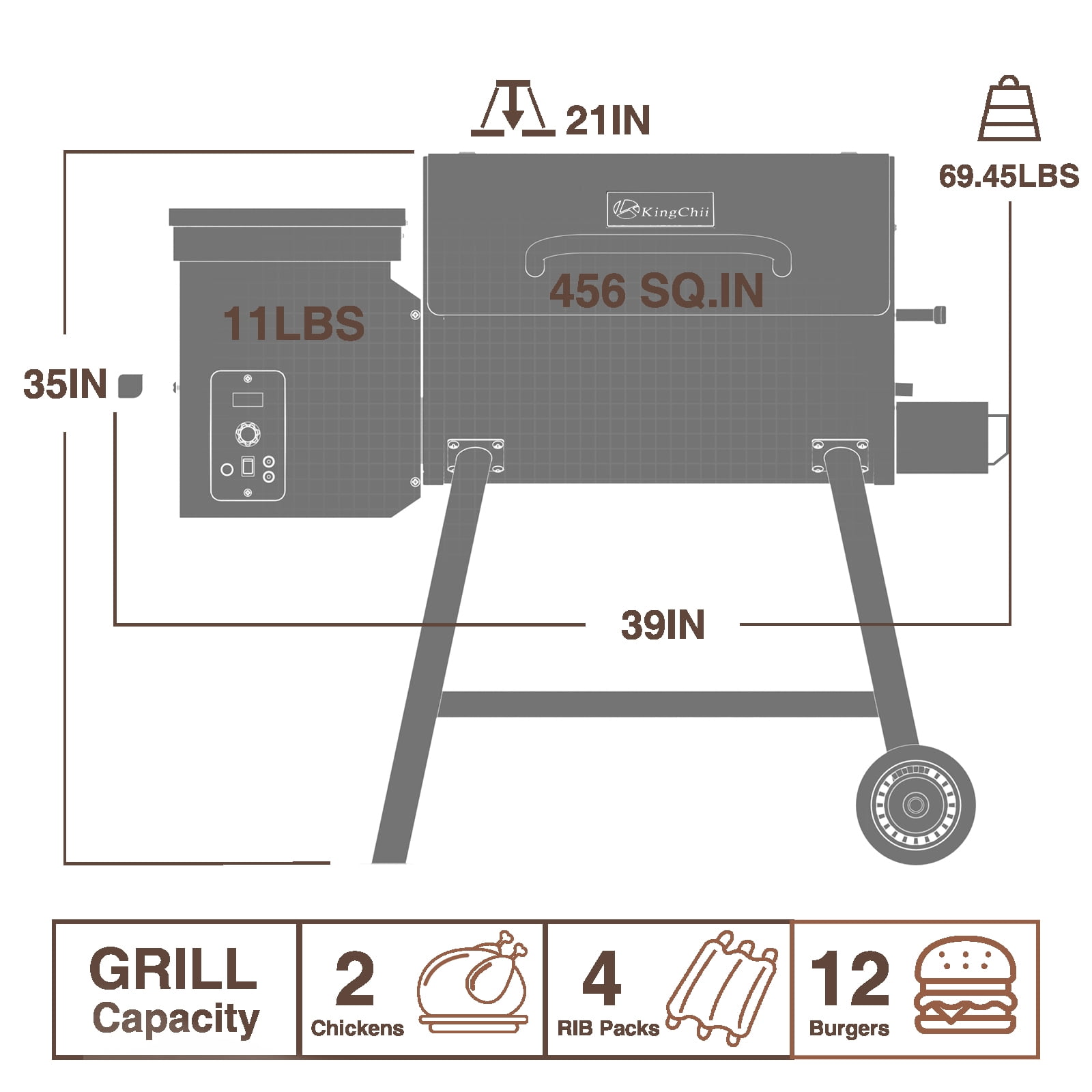 Suitable for grill, smoke, braise, roast, bake, or BBQ. You can do anything about barbecue here. Pellet grills are easier to obtain wood-smoked flavor than gas or charcoal grills. You will prefer grilled meat with wood flavor that is really tasty and delicious. Electronic AUTO-Start Ignition, avoid the hassle of building a fire manually for traditional BBQ. D2 feeding technology- Through the motor-driven propeller to feed the wood pellets into the combustion chamber, while the semiconductor temperature control technology to control the feeding efficiency and control the temperature.Exhaust smoke at the back and down to Avoid getting smoked while enjoying barbecue. Exhaust smoke at the back and down to Avoid getting smoked while enjoying barbecue. Precise density control metal powder spraying process, superior texture, uniform density, effectively prevent the oven body under continuous heat baking paint flaking phenomenon. Special designed waste oil collector to assist you with safe and easy clean. With two casters, very easy to move. Hopper pull-up design allows you to increase the capacity of the hopper wood pellets to suit your cooking needs. Holds up to 11 pounds of wood pellet fuel.456 sq in of grilling space that can accommodate 12 burgers, 4 racks of ribs or 2 whole chickens. When using KingChii pellet grill smoker for the first time, allow 30-50 minutes for the temperature to stabilize. After stabilization, there may be a fluctuation of up to +/-30°F, which is normal. Brand: KingChii Model Name: HWPG 456C-WR Power Source: Electric Fuel Type:Wood Material: Stainless Steel Color: Bronze Pruduct Weight:69.45 pounds Item Dimensions (L x W x H): 36.7 x 18.3 x 35.4 inches 1 x Wood Pellet Smoker & Grill 1 x Accessory Kit During this initial period, it’s crucial to follow the correct shutdown procedure to ensure proper operation. Here are the steps: 1. Do not immediately turn off the grill switch or set it to OFF. 2. First, move the dial to the “Shut Down Cycle” position, and allow the remaining pellets to burn out completely. 3. Once the fan stops operating, set the switch to the OFF position, and then unplug the grill from the socket.