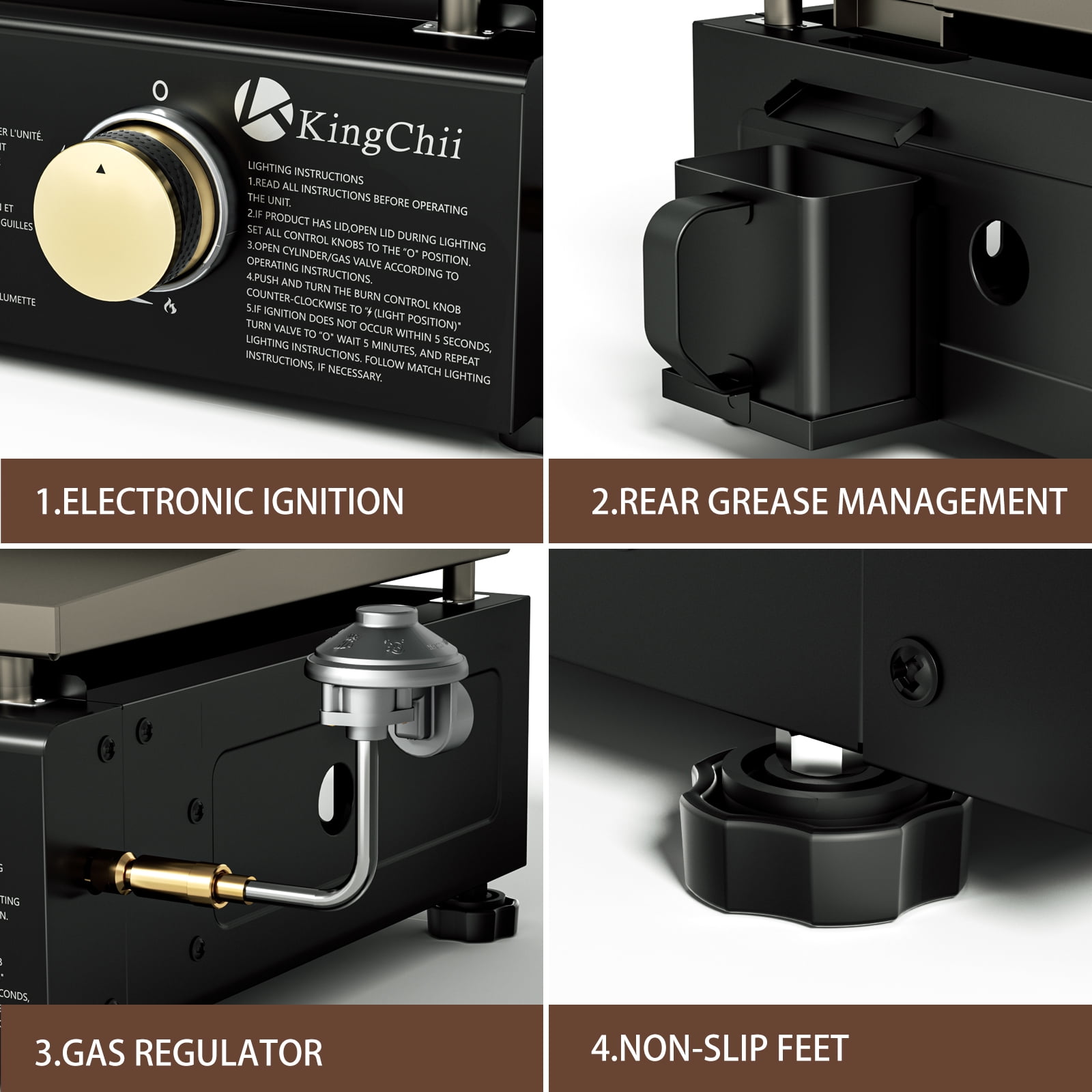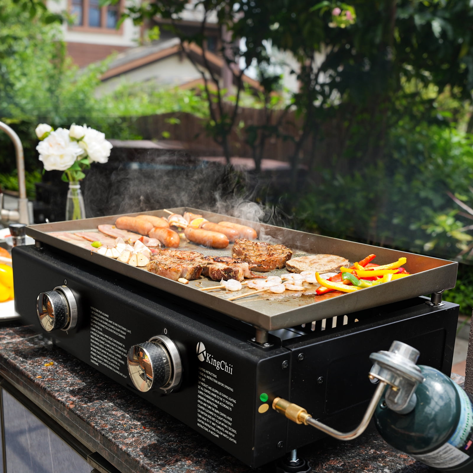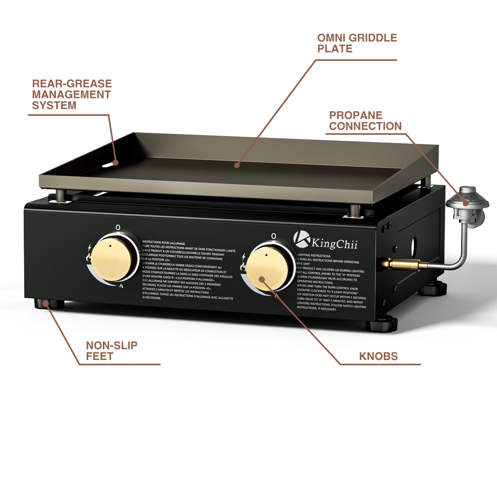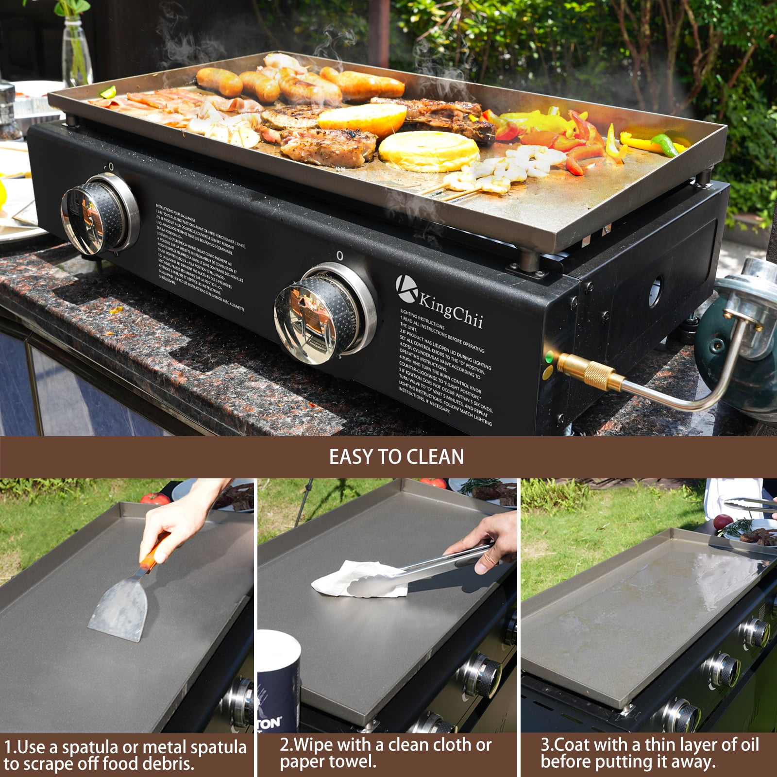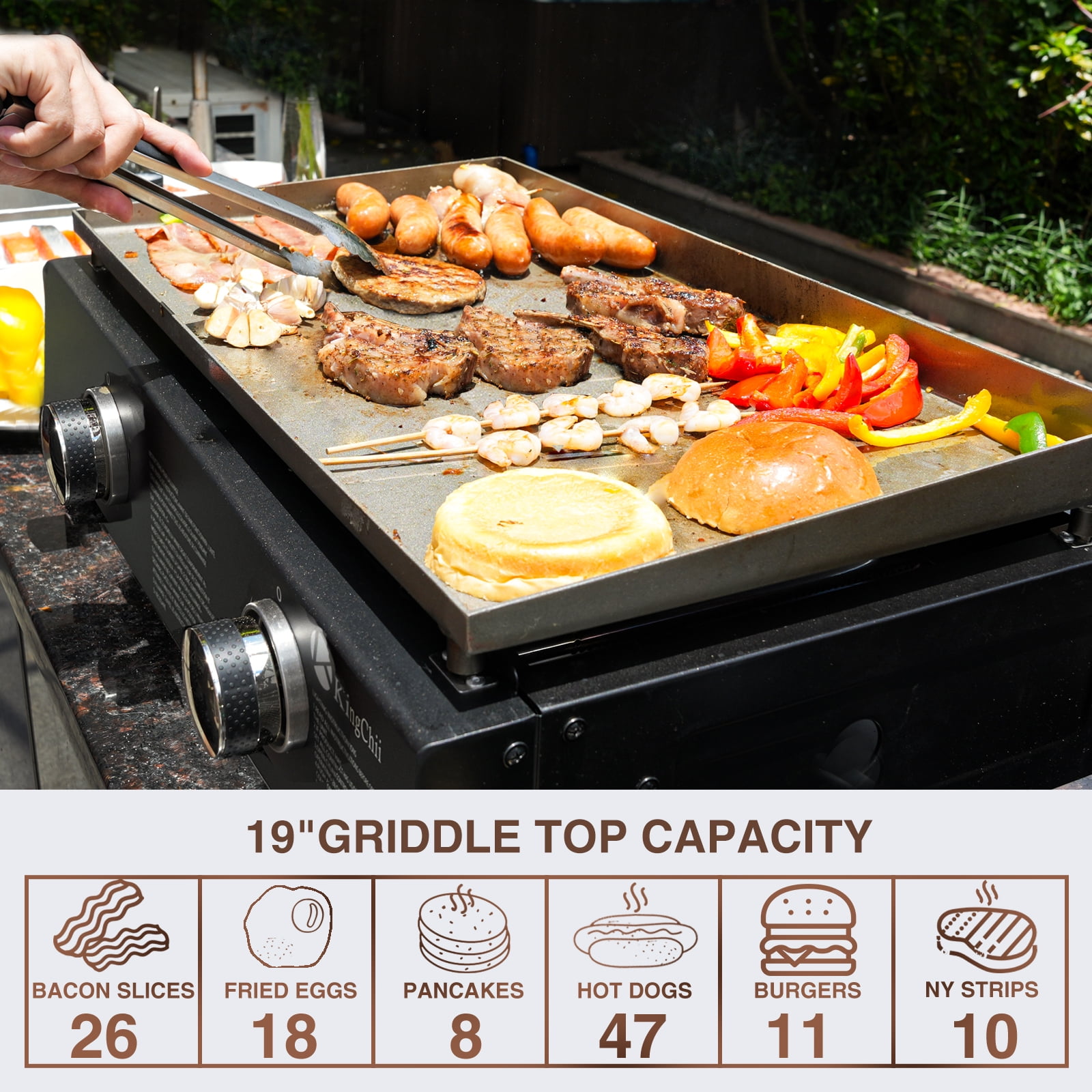 KEY FEATURES: 【Portable Convenience】 Compact and lightweight, the Kingchii Propane Griddle is perfect for outdoor enthusiasts. Ideal for beach outings, picnics, camping trips, and tailgate parties, it ensures gourmet meals on the go. Its portable design allows easy storage in car or truck trunks, ready for use anytime, anywhere. 【Large Cooking Area】 Despite its compact frame, the griddle boasts a generous 19” top, offering 285 square inches of cooking space, allowing you to cook up to 14 burgers simultaneously, making it ideal for feeding a crowd. 【Multifunctional Cooking】 Equipped with a broad griddle top, it’s adept at preparing a diverse range of foods, from morning favorites like bacon and pancakes to lunch and dinner staples such as veggies and burgers, making every meal a possibility. 【Consistent Heat Distribution】 With three independently controlled burners delivering a total of 19,800 BTUs, this griddle excels in maintaining consistent temperatures across its entire surface. This exceptional heat distribution capability ensures that you can prepare multiple dishes simultaneously at their optimal temperatures. Whether you’re searing steaks, sautéing vegetables, or grilling delicate seafood, the griddle’s superior even heating guarantees precise control over each cooking zone, allowing you to achieve perfect results every time. 【Easy to Clean】 Features an efficient system for grease disposal, making post-cooking cleanup straightforward. Also comes with a built-in hood for protection, stable non-slip feet, and simple push-and-turn ignition. SPECIFICATIONS: Brand: KingChii Model: KC1995D2 Fuel Type: Propane Gas Color: Black PACKAGE INCLUDES: 1 x Griddle 1 x Accessory Kit 1 x Mamual