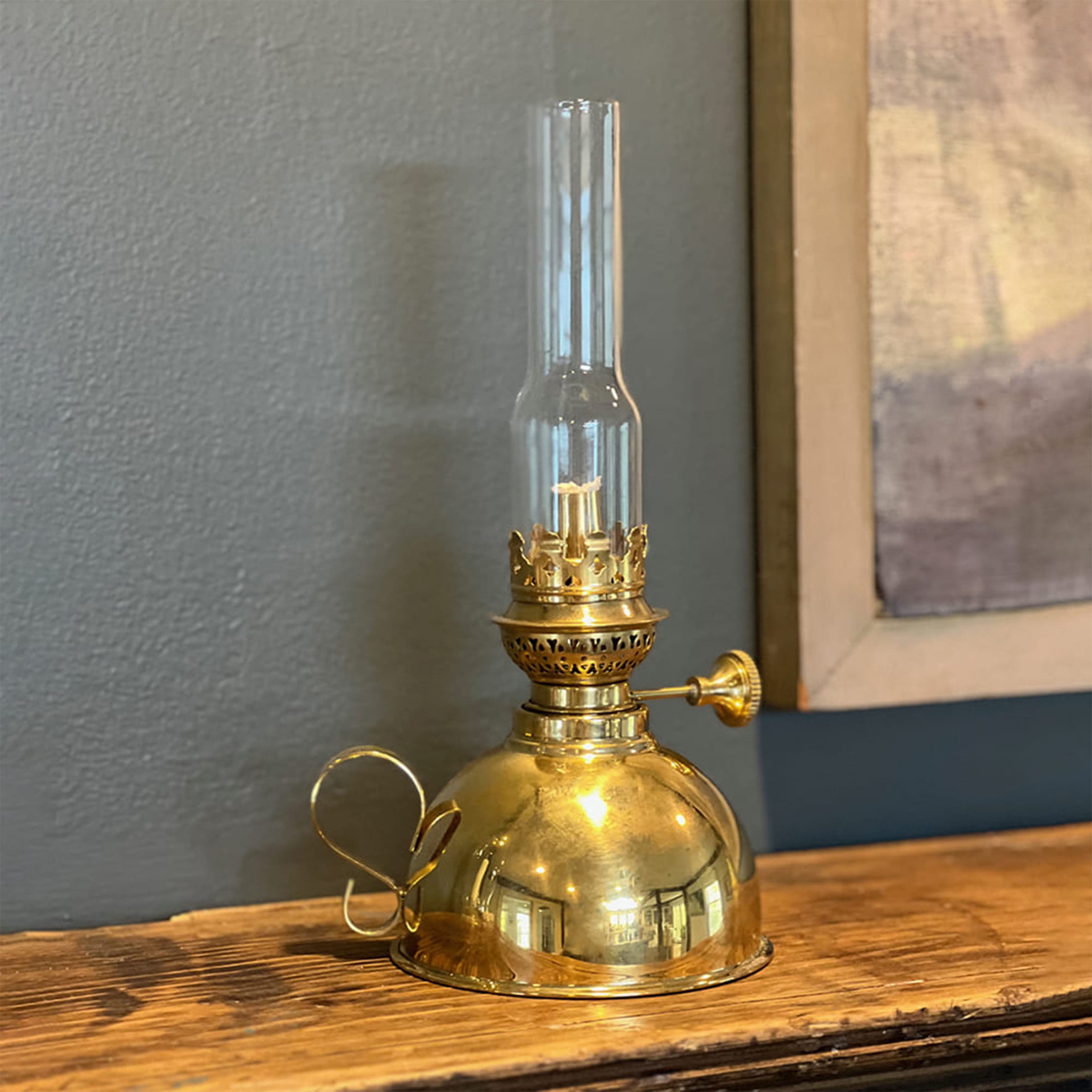 OIL LANTERN – This hurricane lantern is fueled by lamp oil or kerosene to provide light without electricity, whether you want to enjoy ambient light or need emergency lighting during a power outage. EXTRA-BRIGHT LIGHT – This kerosene lantern features a tall tapered chimney, specially designed wick, and unique elevation mechanism for a much larger and brighter flame. ANTIQUE CHARM – This brass and glass oil lamp has a modern design with all the charm of a 19th century vintage kerosene lamp, combining practical lighting with a unique piece of home decor. EASY TO FILL – To refill the indoor oil lamp, firmly hold the burner with one hand while turning the base clockwise to remove the burner, fill the base font with fuel, then reattach the burner. MATERIALS – Brass and Glass. DIMENSIONS – (L) 4” x (W) 4” x (H) 9”. COLOR – Antique Brass.