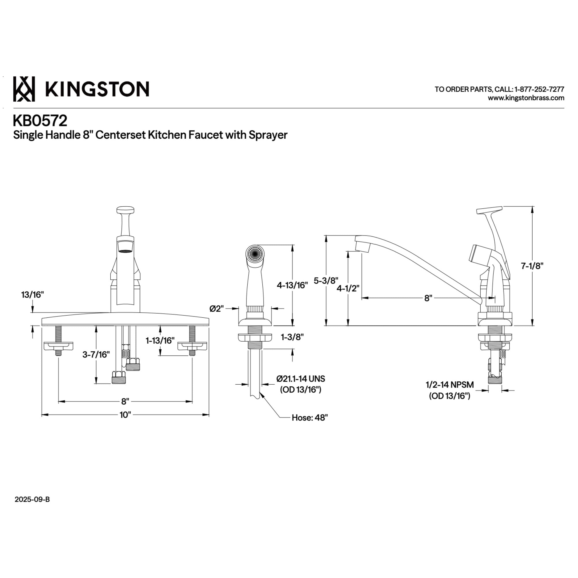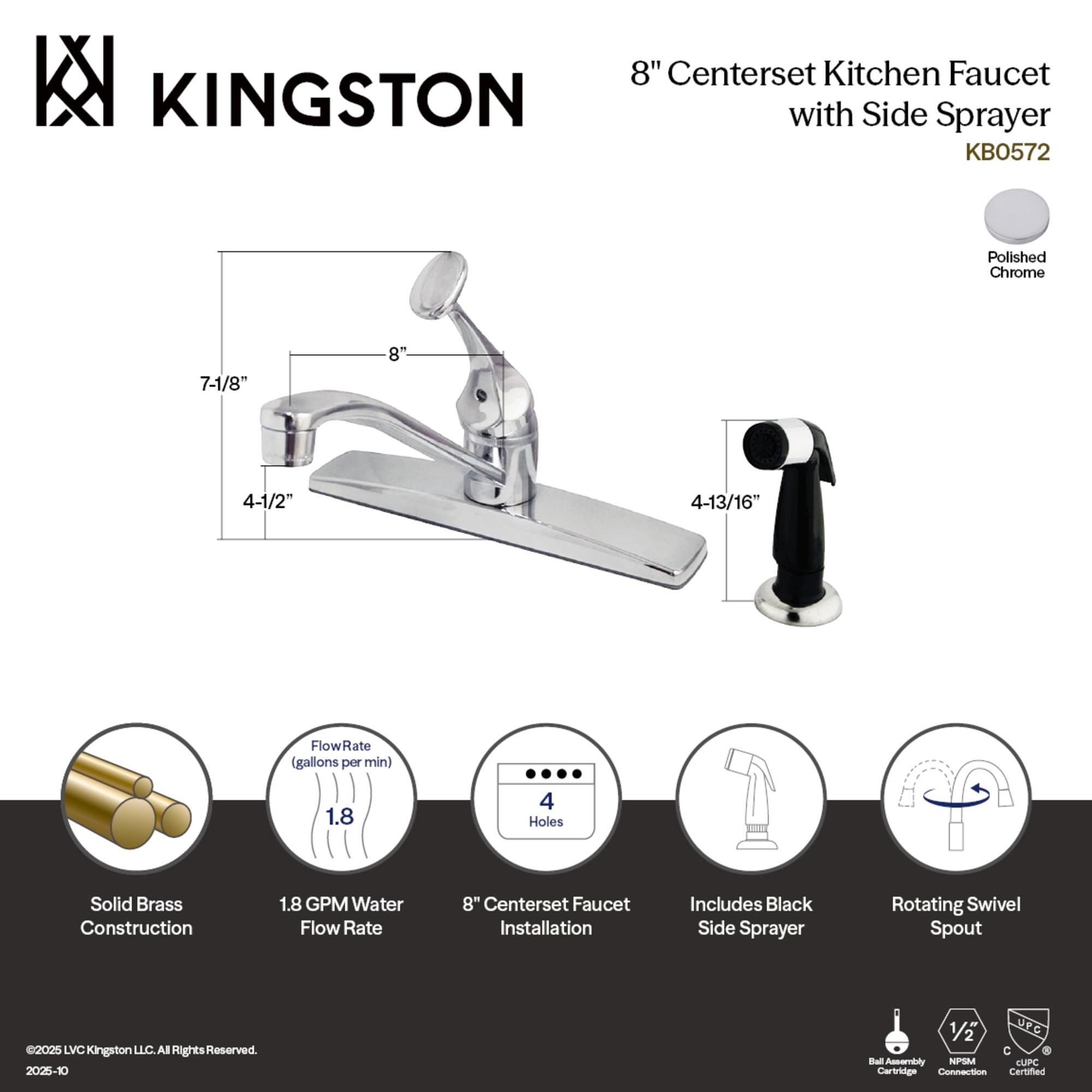 Kingston KB0572 Columbia One-Handle 4-Hole 8″ Centerset Kitchen Faucet with Side Sprayer in Polished Chrome