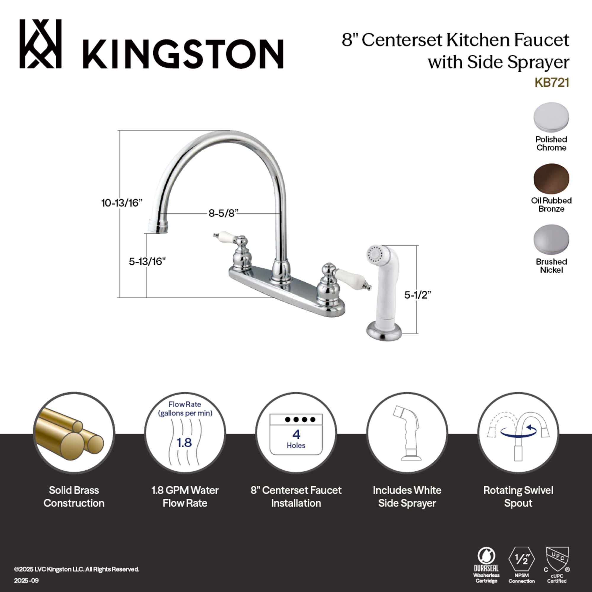 Kingston KB721 Vintage Two-Handle 4-Hole 8″ Centerset Kitchen Faucet with Side Sprayer in Polished Chrome