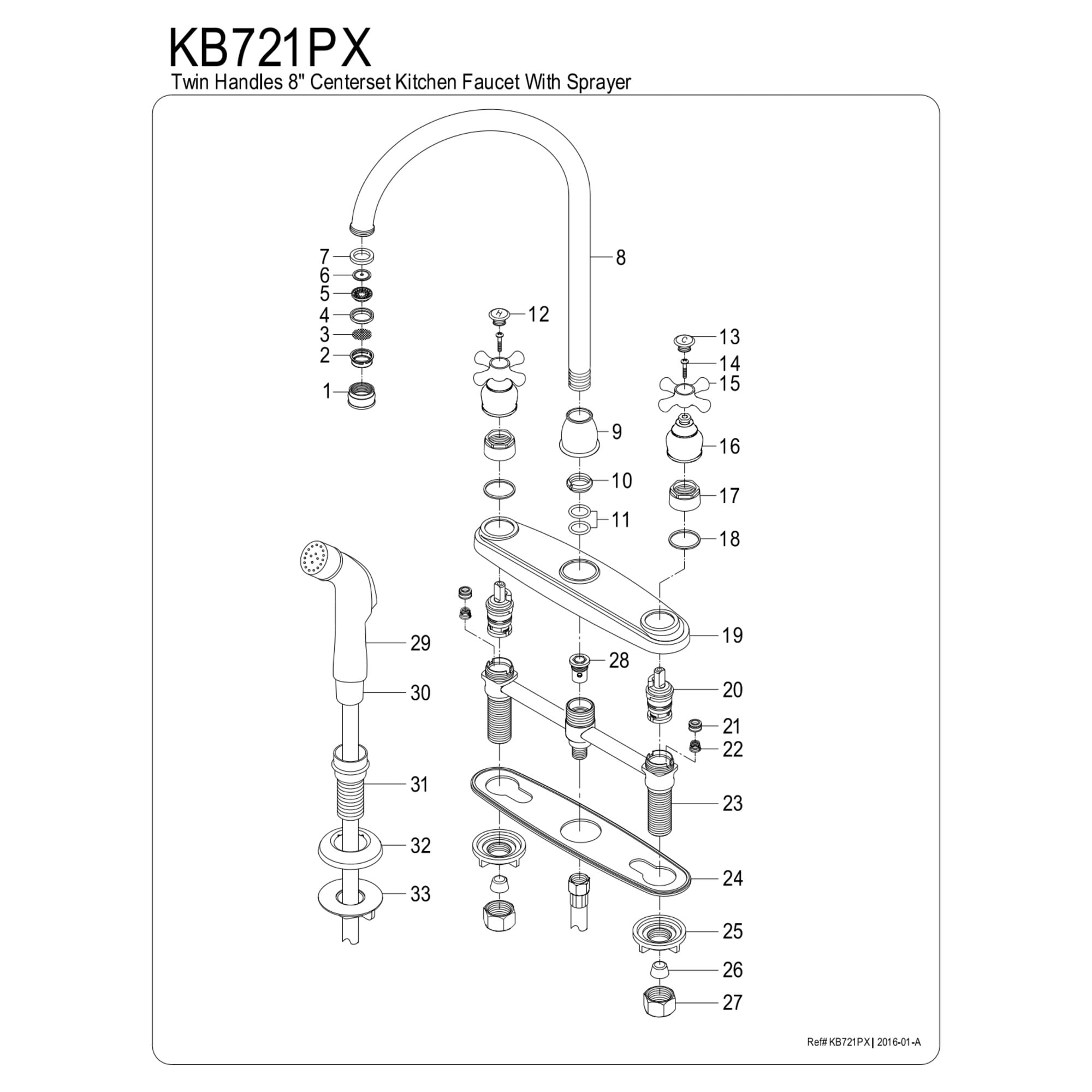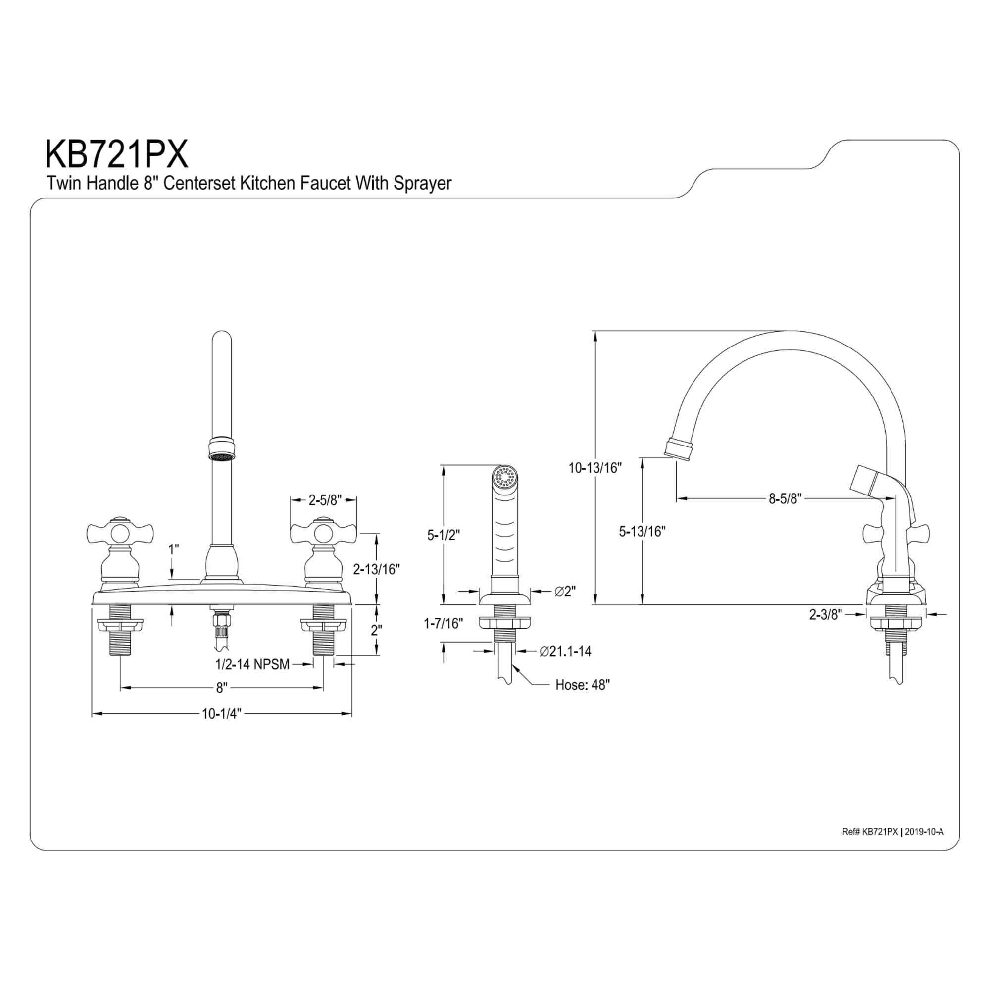 Duraseal Washerless Cartridge Deck Mount 8″ Centerset 4-Hole Installation Standard 1/2″ IPS Connection 5-13/16″ Spout Clearance 8-5/8″ Spout Reach 10-13/16″ Spout Height Twin Porcelain Cross Handles Includes Side Sprayer