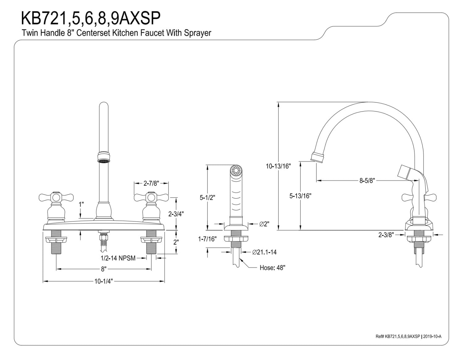 Solid brass construction for durability Deck mount 8″ centerset 4-hole installation Durable washerless cartridge 1/2-14 NPSM connection 1.8 GPM/6.8 LPM spout flow rate at 60 PSI 8-5/8″ spout reach 5-13/16″ spout clearance 10-13/16″ spout height Victorian-style gooseneck swivel spout Dual cross handles for easy rotation Includes side sprayer