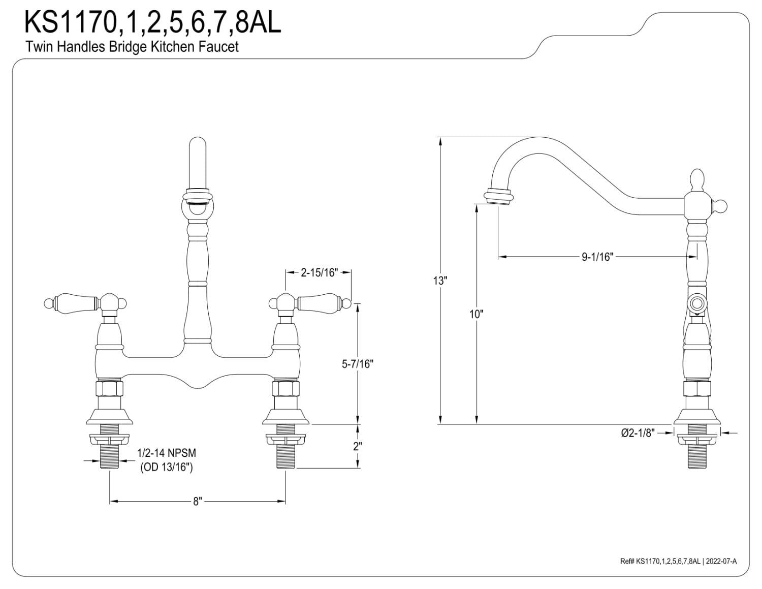 Solid Brass Construction Drip-Free Ceramic Disc Cartridge Spout Reach: 8-1/2″ Spout Clearance: 9-7/8″ 2-Hole 8″ Center Installation Victorian Style Swivel Spout