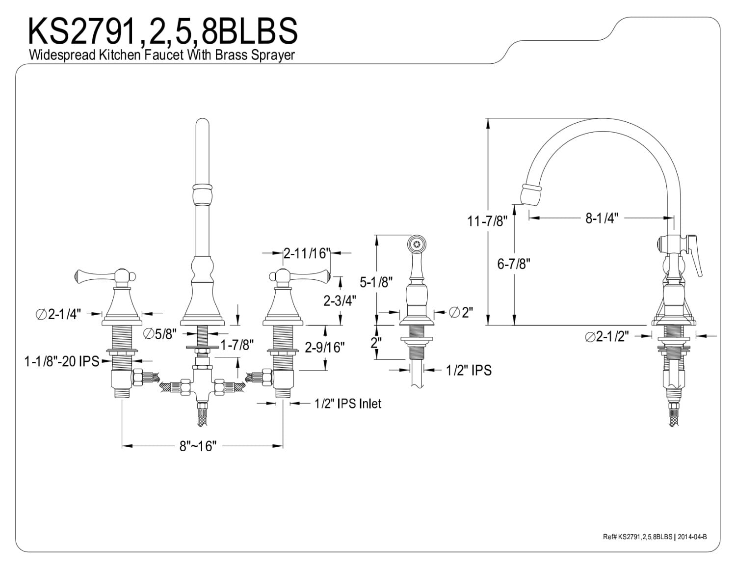 Solid brass construction for durability Deck mount 8″ to 16″ widespread 4-hole installation Drip-free ceramic disc cartridge Standard 1/2″ IPS connection 1.8 GPM/6.8 LPM spout flow rate at 60 PSI 8-1/4″ spout reach 6-7/8″ spout clearance 11-7/8″ spout height Gooseneck swivel spout Dual lever handles meet ADA guidelines Includes brass side sprayer