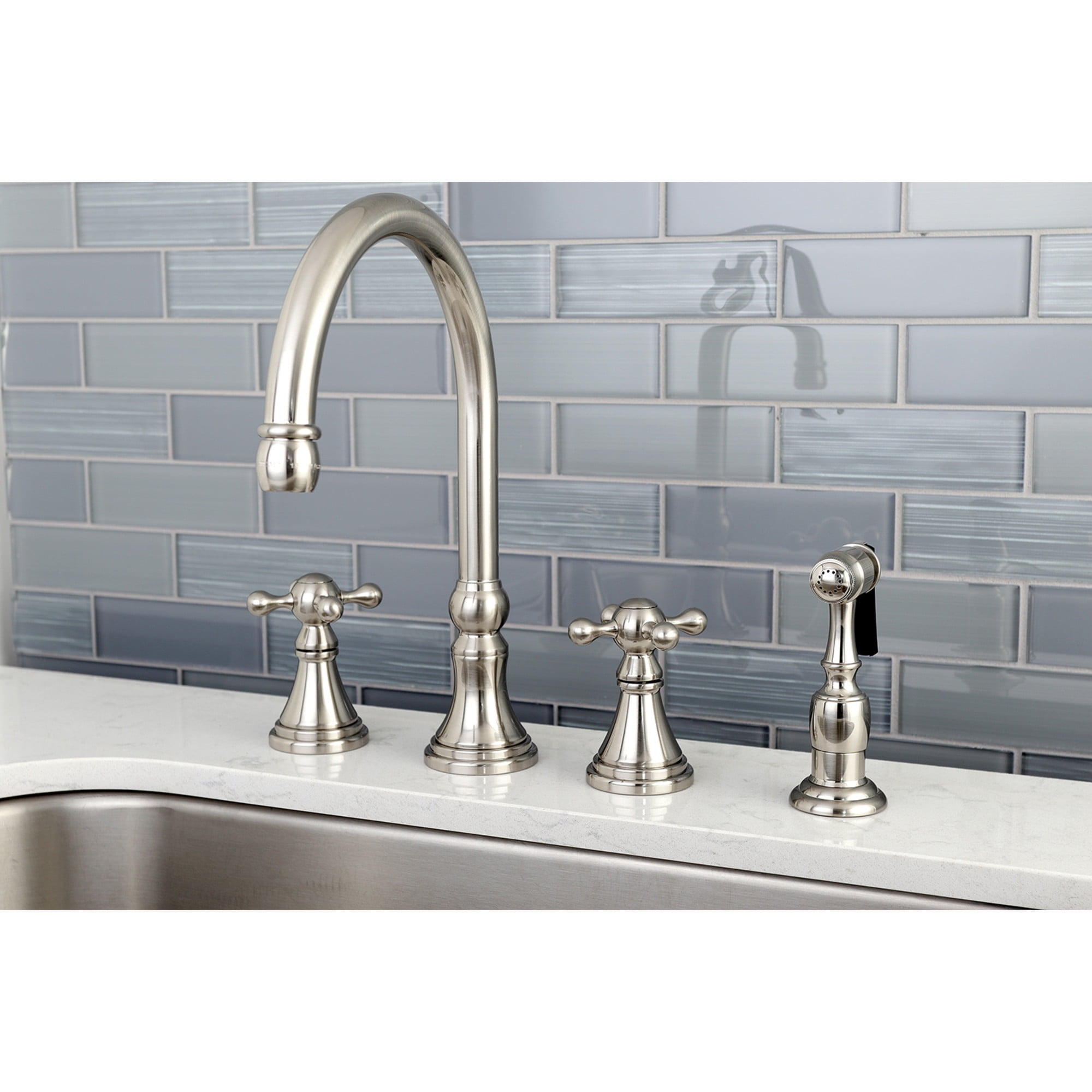 Kingston Brass KS2798KXBS Governor Double-Handle 4-Hole Widespread Kitchen Faucet with Brass Sprayer in Brushed Nickel