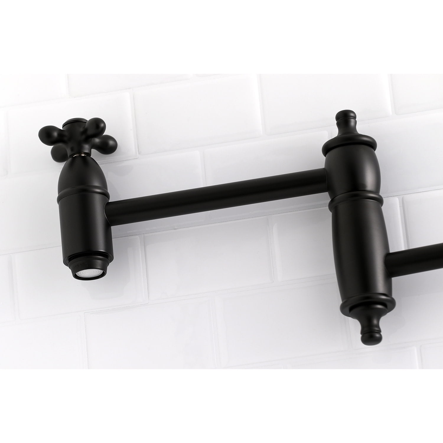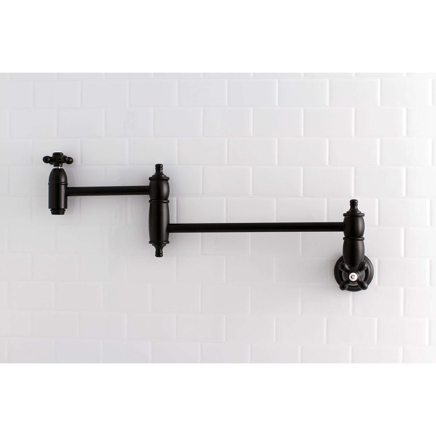 Kingston Brass KS3100AX Restoration Wall Mount Pot Filler Kitchen Faucet, Matte Black Solid brass construction Drip-free ceramic disc cartridge Wall mount single hole installation Convenient swing arm spout Swivel double jointed spout extends up to 20″ 7-15/16″ spout height 1/2″ IPS inlet connection 3.8 GPM/14.4 LPM spout flow rate at 60 PSI Cold water supply connection only Corrosion-resistant finish Designed for long-lasting durability Cross handles for easy rotation