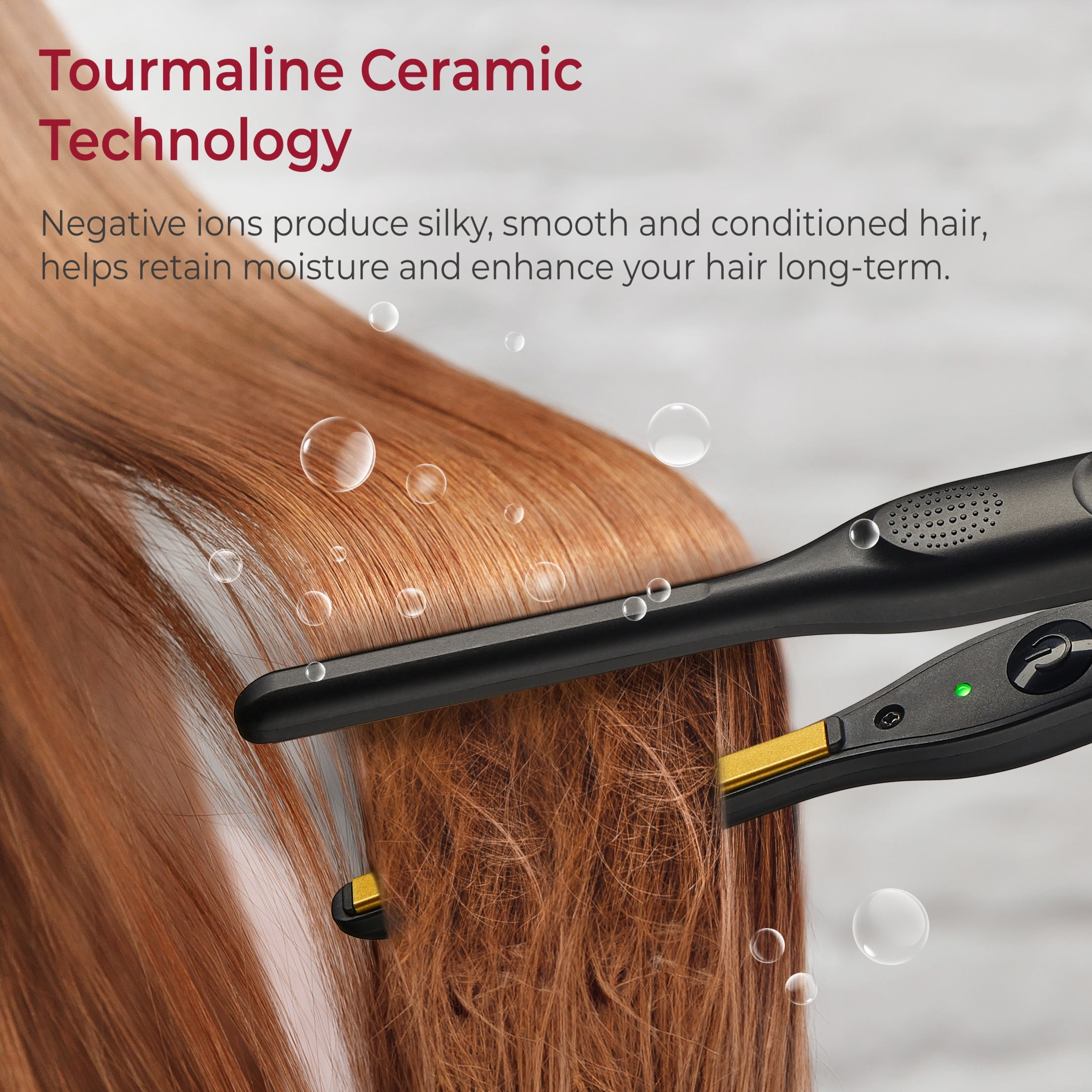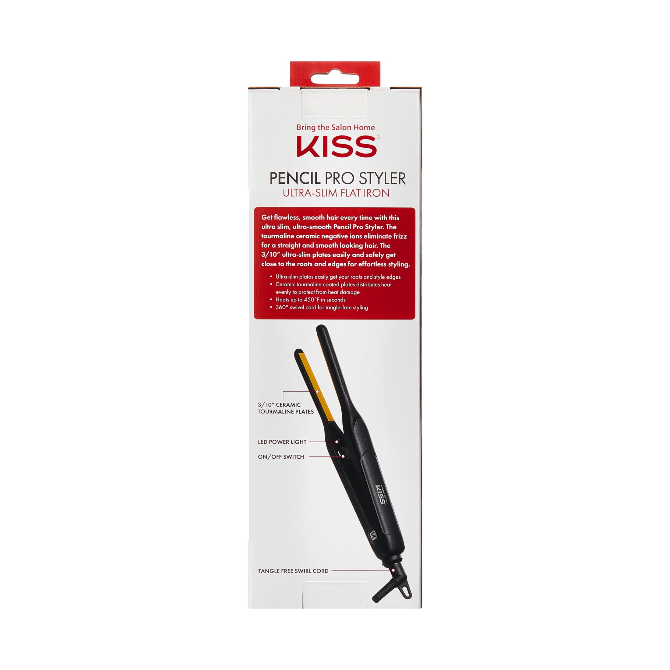 Ultra-slim design at 3.7” x 0.3” for precise styling Ceramic tourmaline plates produce negative ions to eliminate frizz Rapid 450°F heat-up time Even heat distribution prevents damaging hot spots On/Off LED power switch & tangle-free swivel cord for easy, comfortable maneuvering