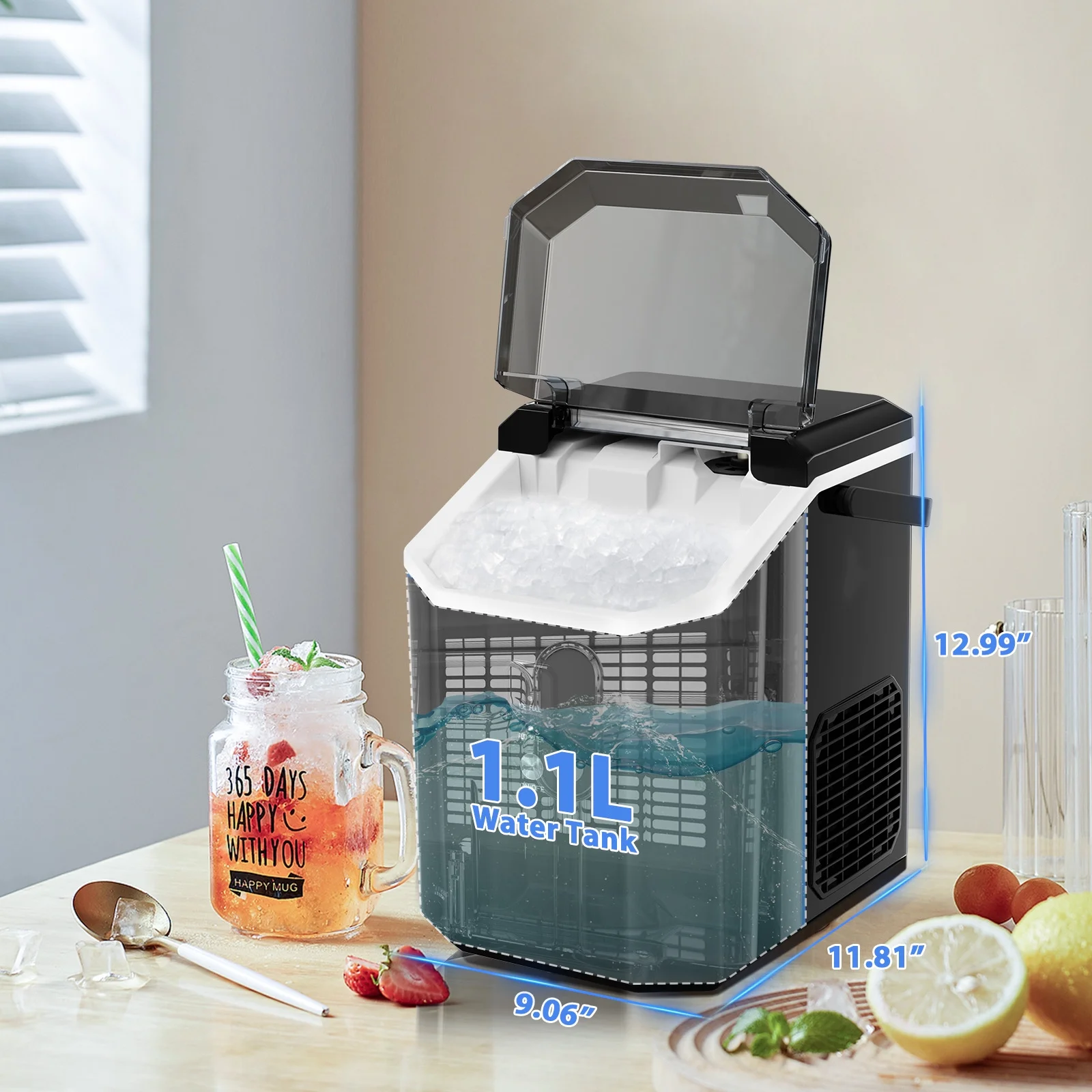 KISSAIR Nugget Ice Maker produces fast, flavorful nugget ice instead of hard cubes. With its compact size(11.81(D)*9.06(W)*12.99(H)) and modern design, It comes equipped with a basket and scoop, and even has a transparent window so you can monitor the ice-making process. It’s perfect for home or office use. Fill the reservoir with water and press the button. It cleans itself for easy maintenance. Produces 35 pounds of ice in 24 hours. Low-noise and perfect for cocktails, sodas, and other beverages.