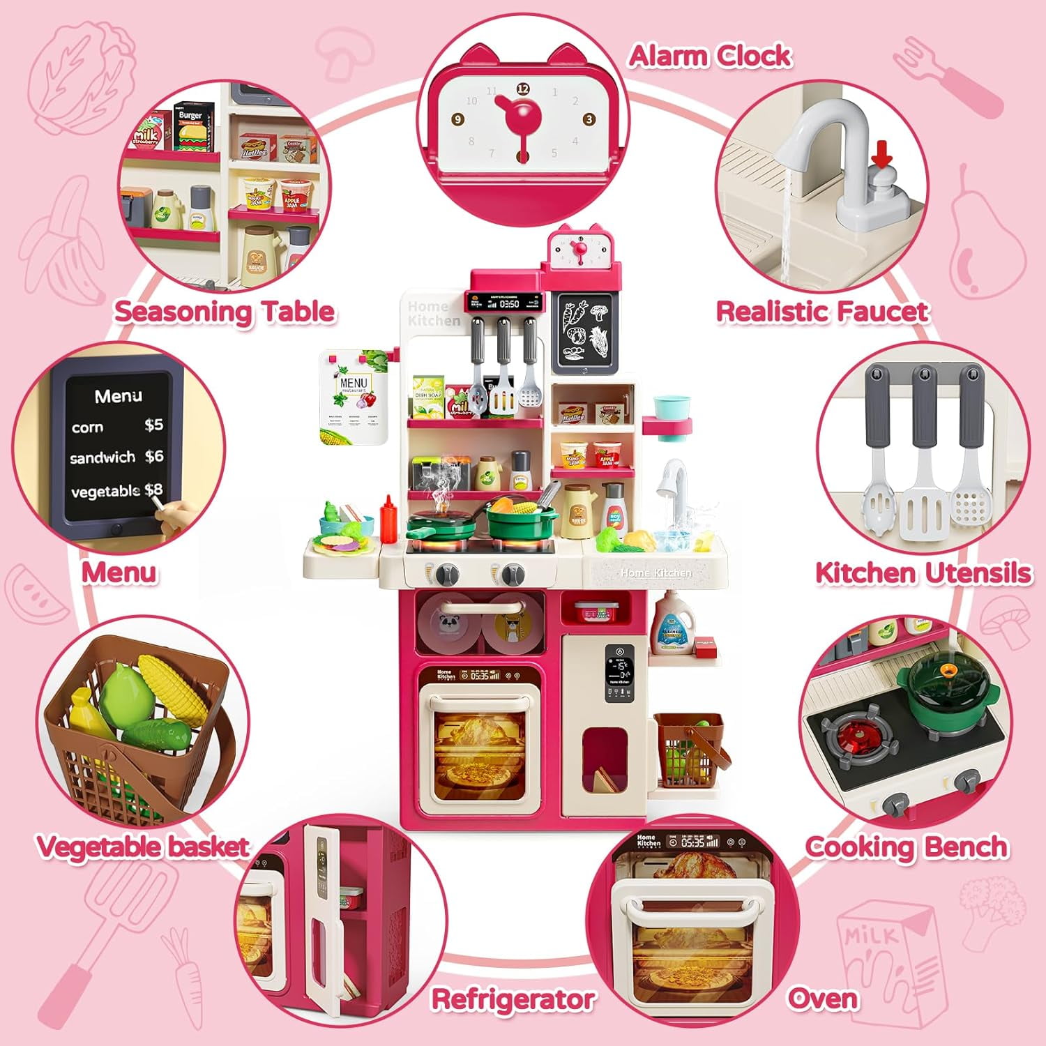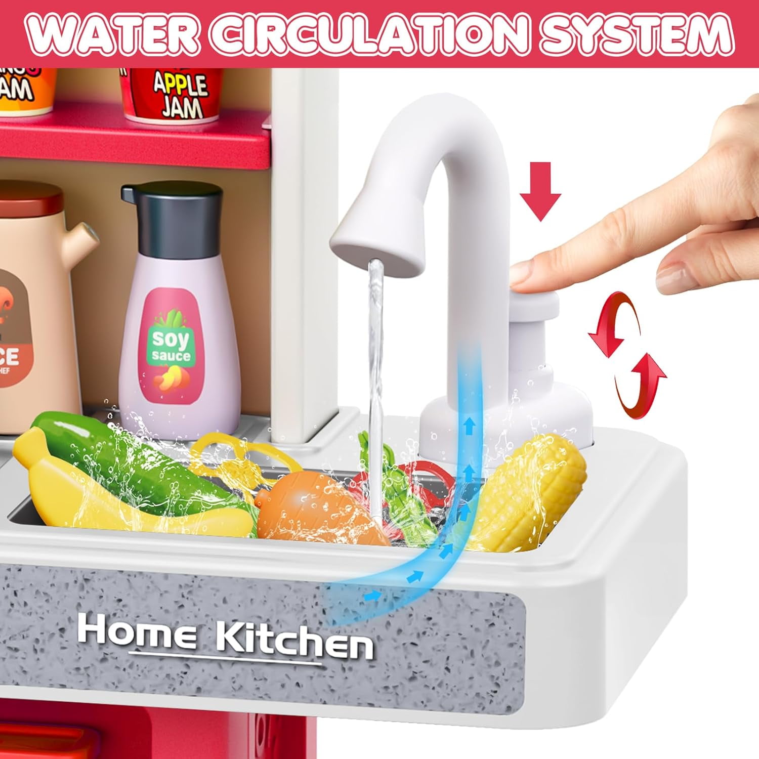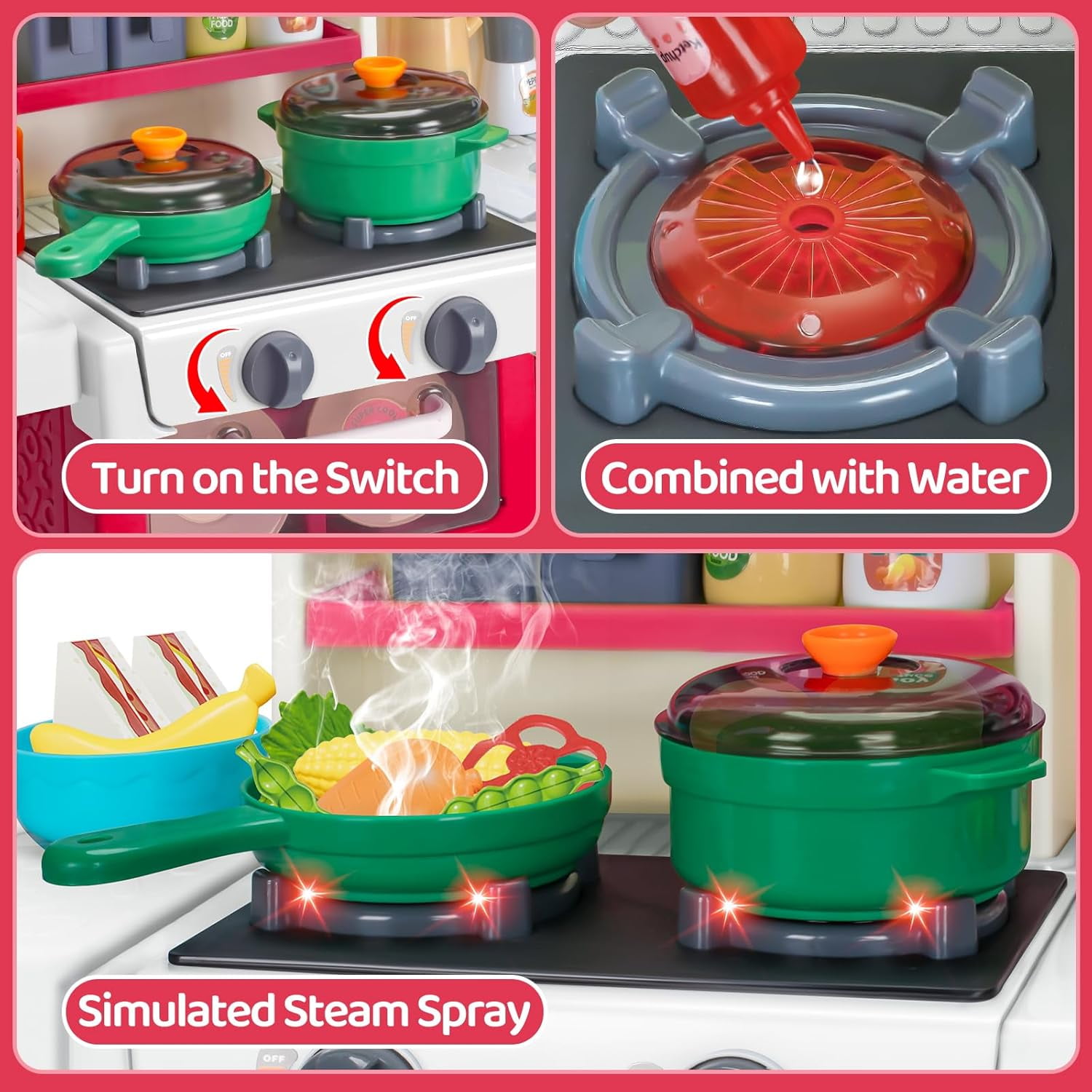 Kids Play Kitchen Set 63 Pices with Sound & Light, Cooking Stove with Steam, Play Sink, Play Food Toy and Accessories for Toddler Girls Boys +3 Red by Mundo Toys.