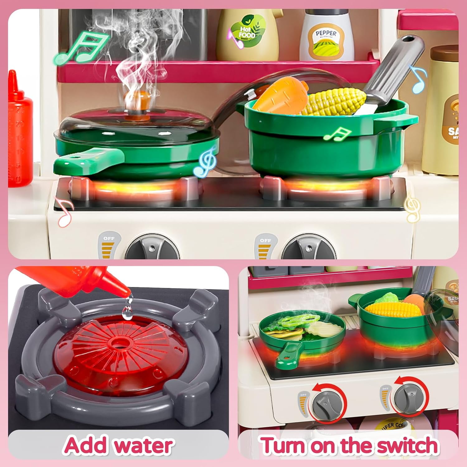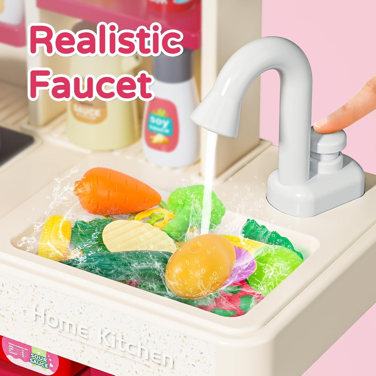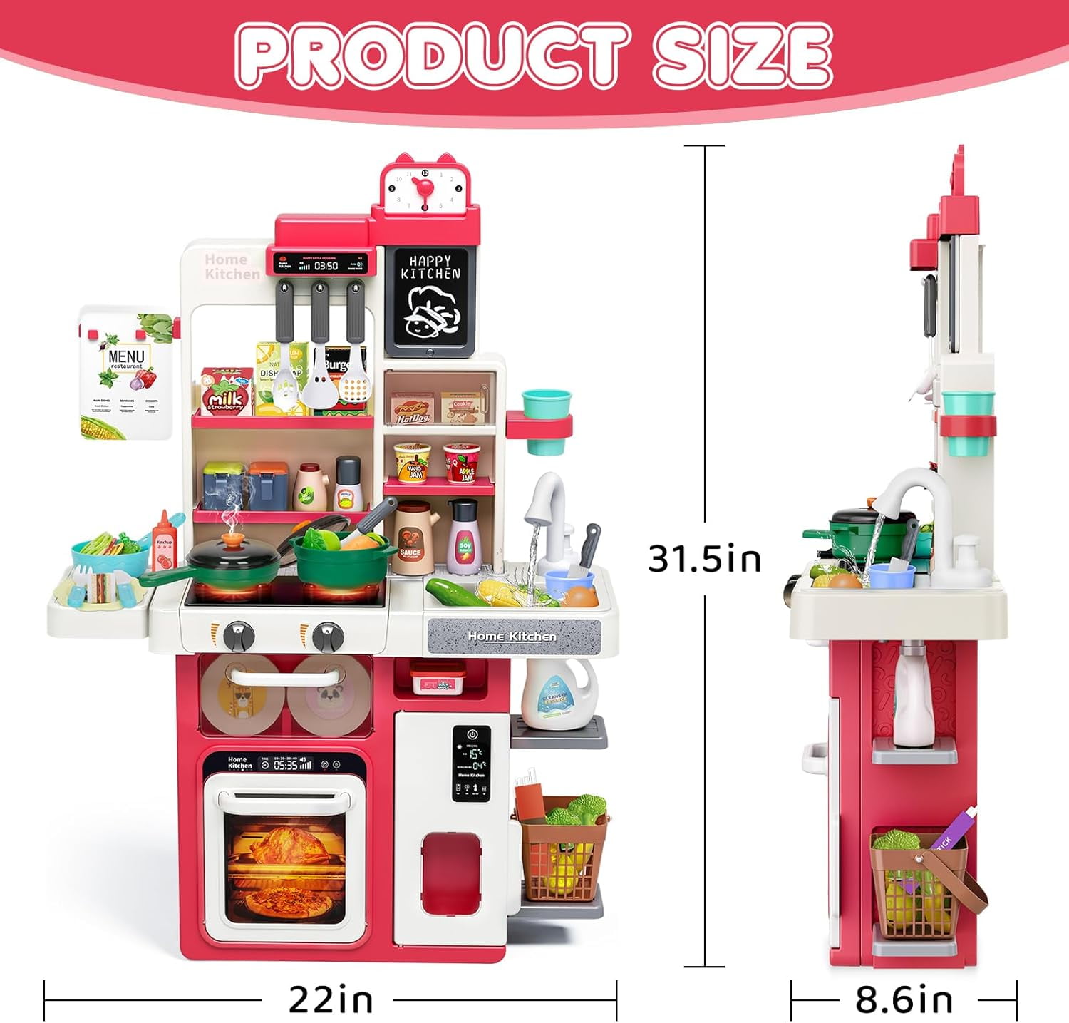 Dimensions: 72 cm H x 52 cm W x 24 cm D (28.34″ x 20.47″ x 9.44″) Realistic kitchen playset with light, sound, and spray steam effects for immersive play Working water faucet with circulating pump simulates real sink usage