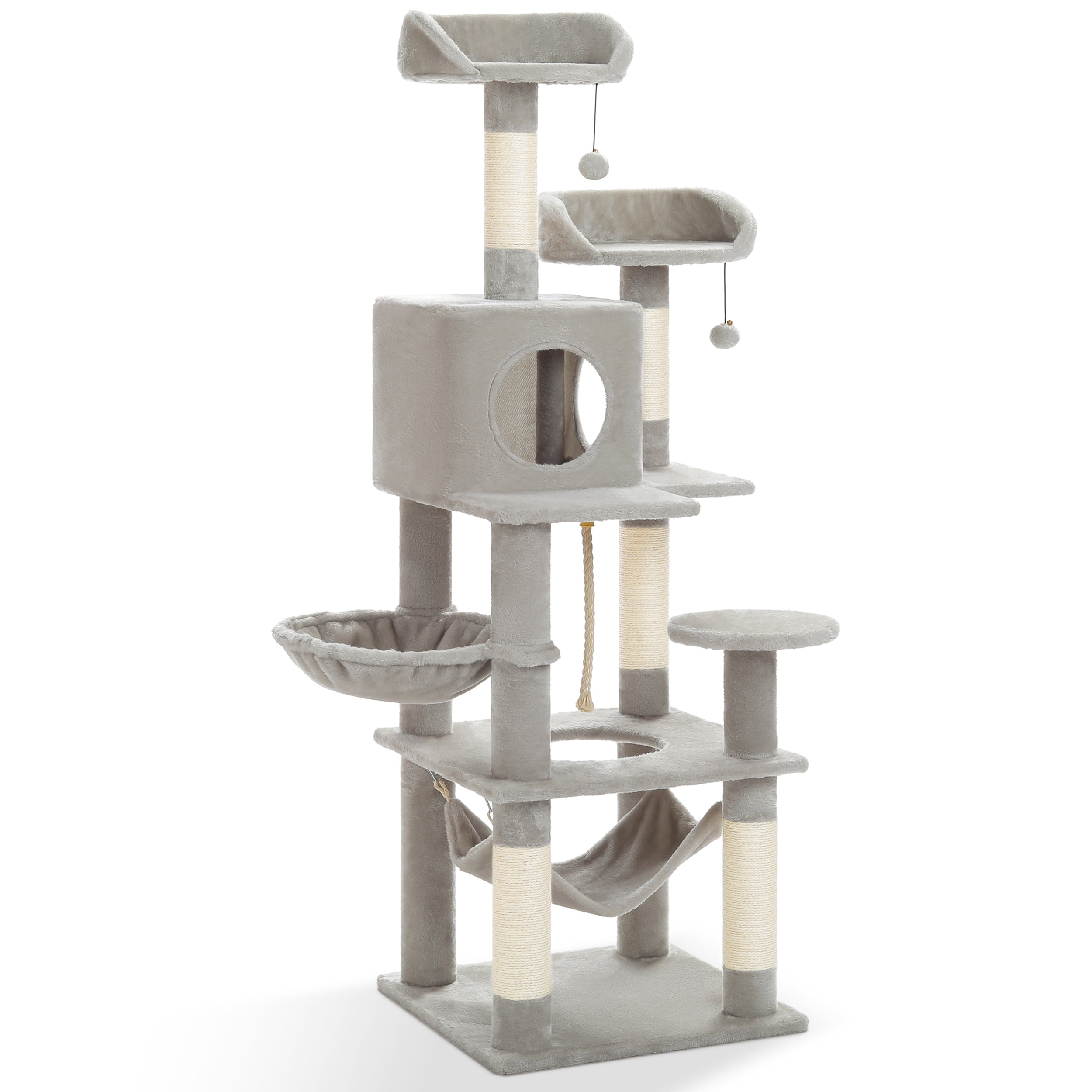 Kitty City Upholstered Multi-Level 54-inch Indoor Cat Tree with Scratching Posts,House, and Perches, Gray Features a thick wood base for extra stability and sturdiness Made with quality household-grade carpet for comfort and long-lasting use The perches are spacious and able to accommodate cats of all sizes The steps are placed for easy access to all levels This cat tree has tightly wrapped premium quality, thick, and natural sisal rope for hours of scratching Neutral tones make our cat trees and perches the perfect addition to your home Simple assembly with no tools required Fully assembled dimensions are 34″Wx28″Dx54″ H Handcrafted with durable, high-quality materials Shop the entire Kitty City collection online for a healthy, happy, and energized cat