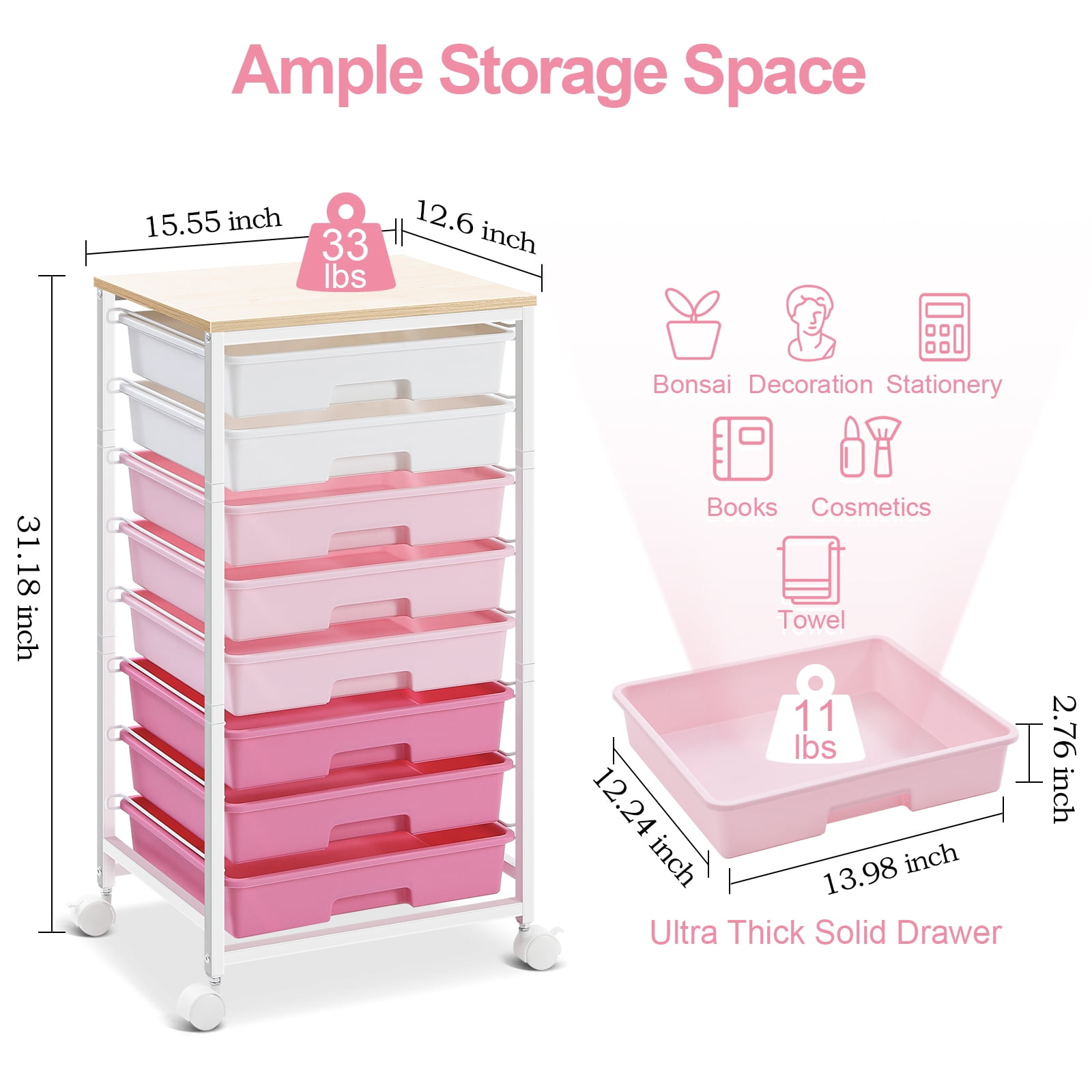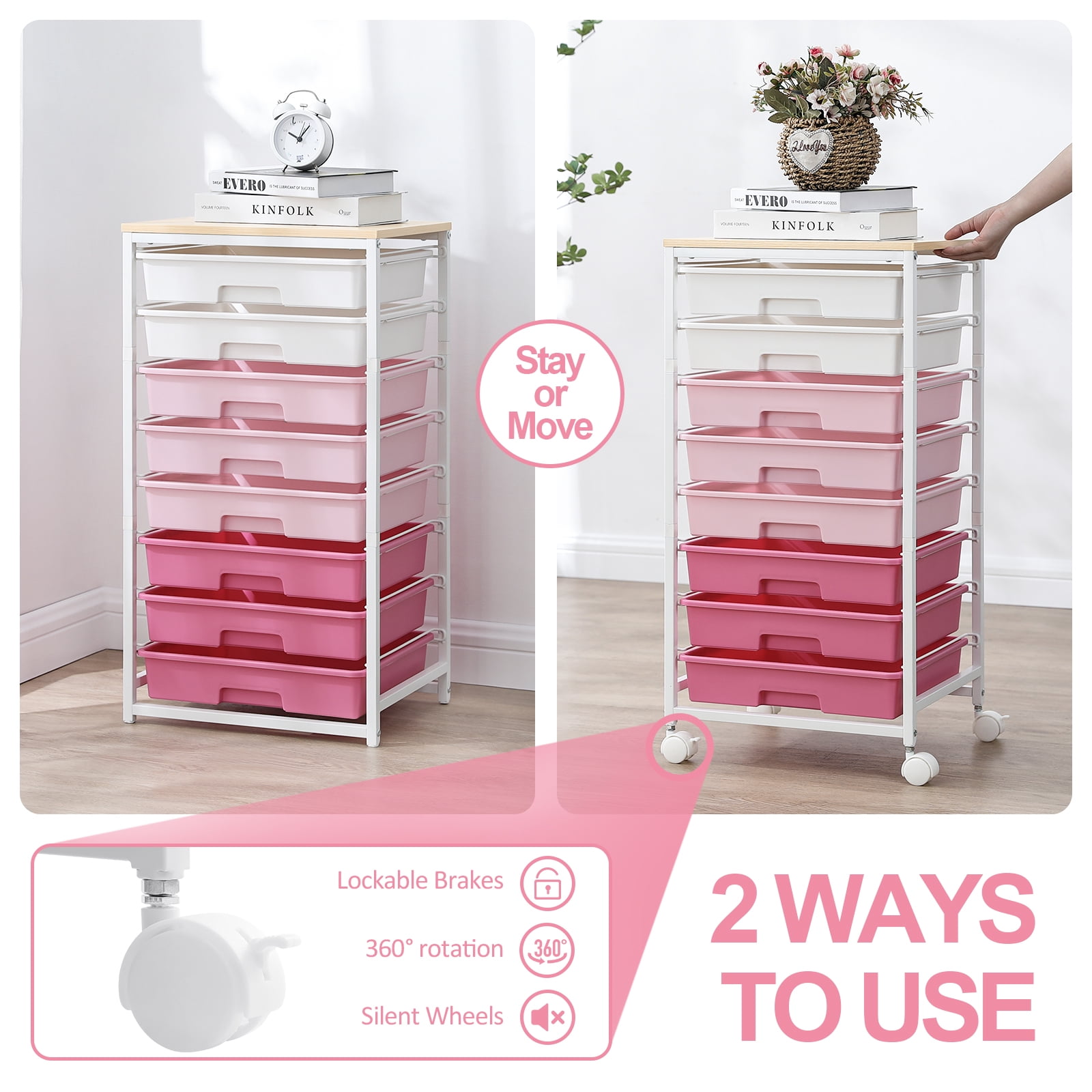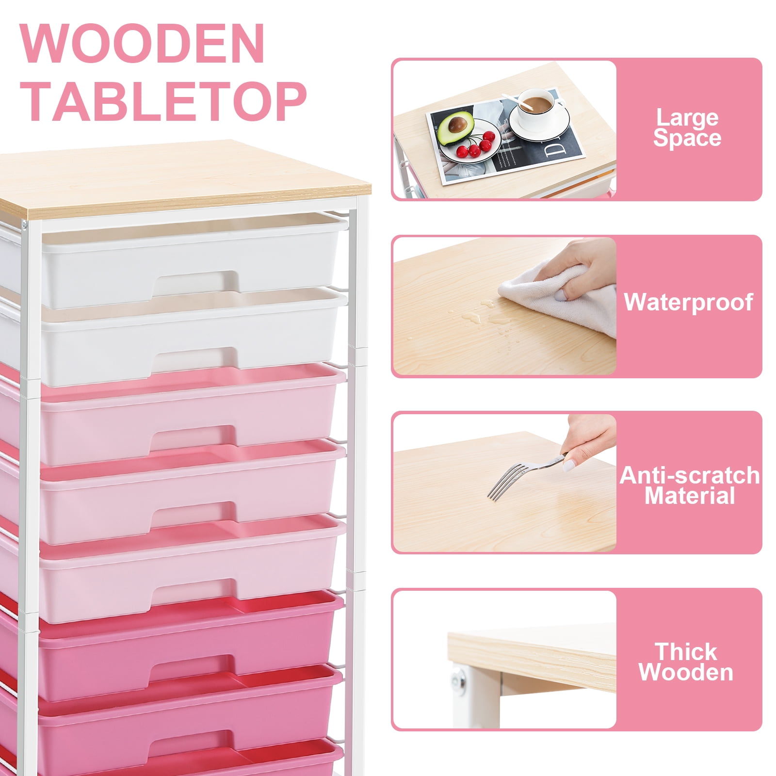 KK KINGRACK Storage Rolling Cart with 8 Drawers, Wooden Tabletop, Metal & Plastic, Pink