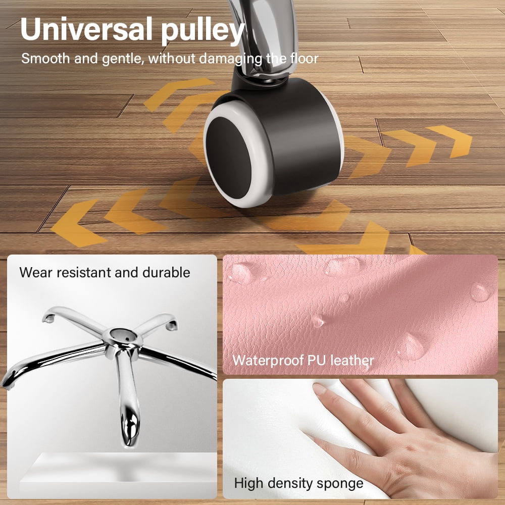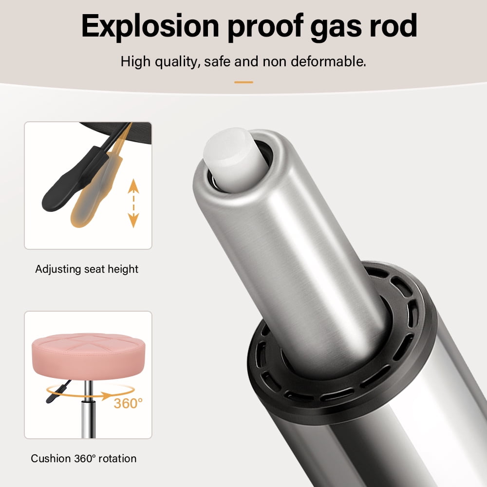 Specification: 1. Comfortable Office Chair: The seat cushion is padded with 10cm thick sponge and has a maximum weight capacity of 300 pounds. 2. Height Adjustment: The roller bench can adjust the seat height from 20 inches to 26 inches with a built-in air bar. 3. 360° Swivel: The base comes with 5 swivel wheels that make the chair easy to move, almost noiseless, and protect your floor from wear and tear. 4. Wide Application Scenarios: The stool is ideal for bars, hairdressers, offices, coffee shops and homes. 5. Easy to Assemble: There will be matching instructions and accessories in the package, and it can be assembled in 5 minutes. Specification: Color: pink Material: PU Leather & Metal Cushion size: diameter 35cm, thickness 10cm Cushion shape: round Adjustable seat height: 51-67cm Weight capacity: 300 lbs Package includes: 1 x Spinning Rolling Chair, 1 x Assembly Instructions