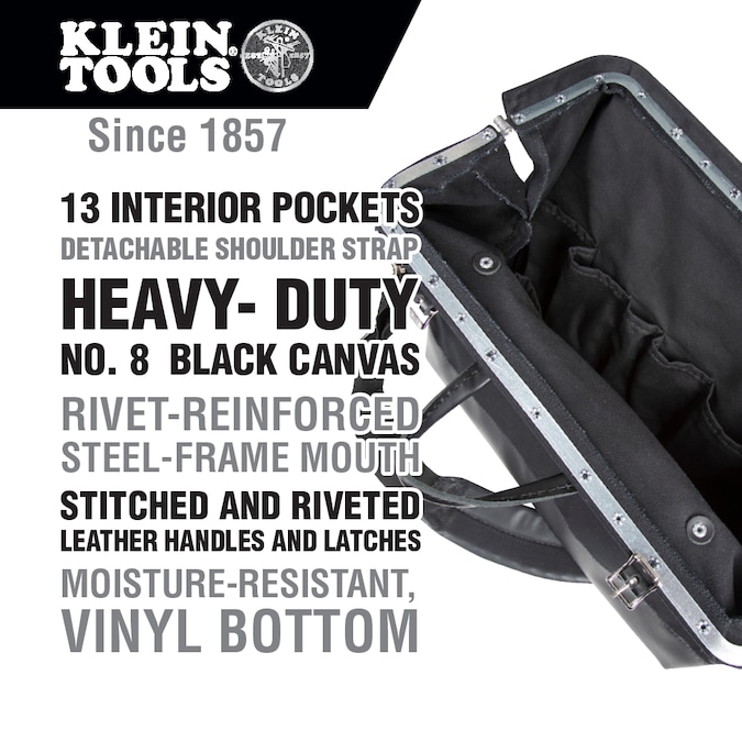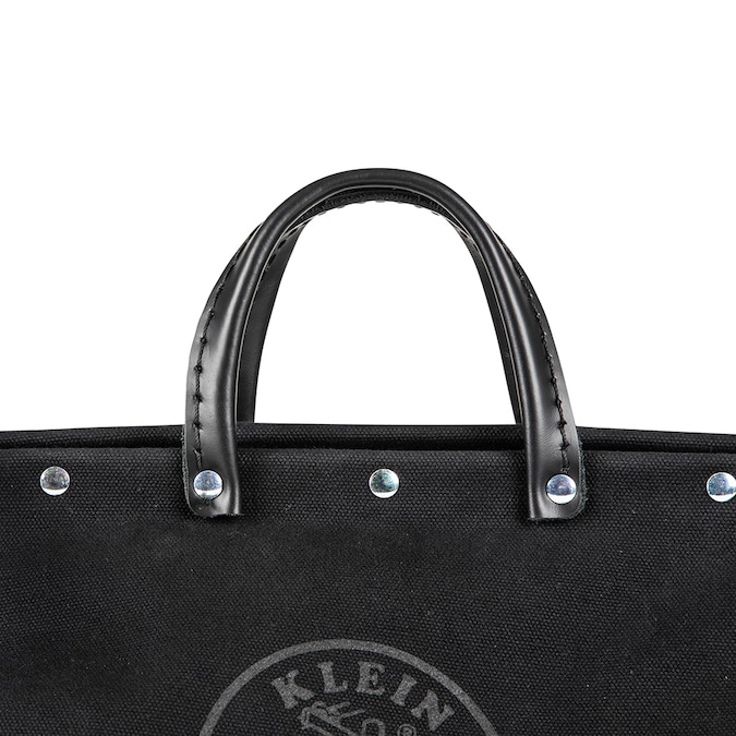The Klein Tools Deluxe Canvas Tool Bag is constructed in all black for a classic look. It’s made with heavy-duty No. 8 black canvas with the iconic lineman logo in black. It features two leather straps with buckles for a secure closure plus stitched and riveted leather handles for comfort and strength. Organize tools with 13 interior pockets. A detachable shoulder strap can be adjusted for a comfortable fit.