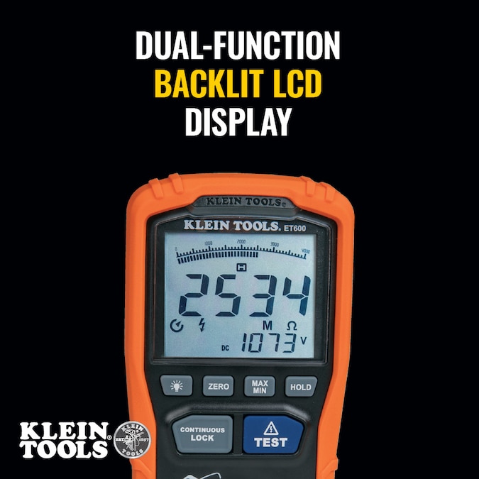The ET600 is a multi-function Megohmmeter capable of producing 125V, 250V, 500V, and 1000V test voltages for insulation resistance measurements up to 4000MΩ. Also tests AC/DC voltages up to 1000V with automatic ranging True RMS technology. Convenient lock function and built-in stand for hands free operation. Dual-function backlit display monitors process.