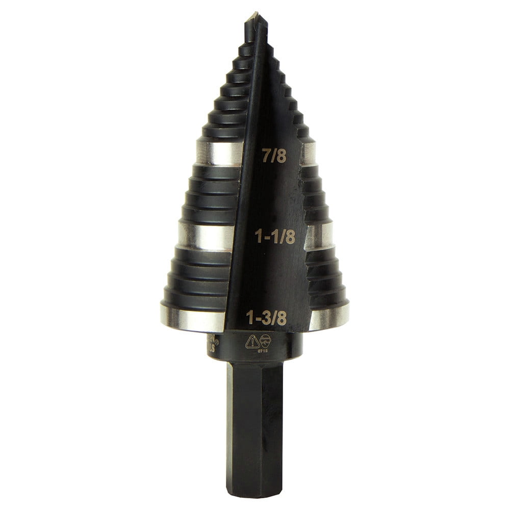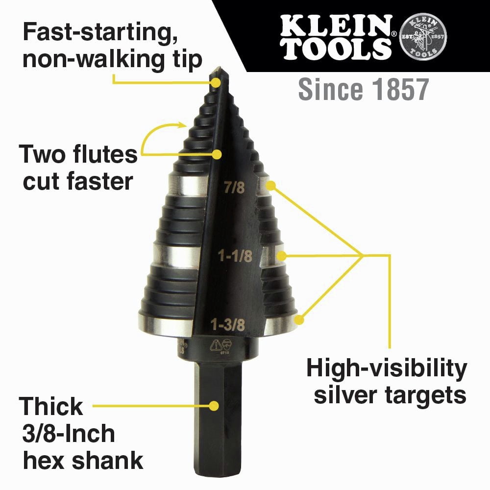 These Double-Fluted Step Drill Bits provide faster cutting and drilling than single flute bits. The easy-to-read step markings and targets save time when drilling holes. Thick 3/8-Inch hex shank provides a firm, positive grip and won’t spin out in the drill. For more than 160 years, Klein Tools has manufactured premium-quality, professional-grade hand tools that deliver the performance, durability and precision needed to get the job done right. Our family of engineers, workers and craftsman continue to put six generations of expertise into every tool we create by using only the highest quality materials, superior workmanship, and keeping manufacturing as close to home as we can. Klein isn’t just the name of our company, it’s also our family name. And since we’re an American company that’s family-owned and family-run, you know you can count on us to be here tomorrow. Klein Tools doesn’t just make great products, we make great products that stand up to the demands of the professionals who use them every day … Since 1857.