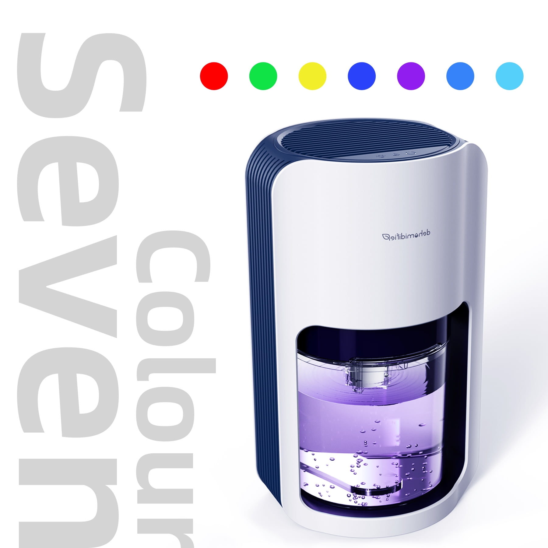Portable and Compact dehumidifier. Energy efficient with low power consumption; Top button design: one-button control switch; One key to set the ambient light: a variety of switchable light colors; Off-type water tank: 360° visible water tank, easy to push; easy to clean; Auto Shut Off: When the water is full, the machine will stop working and will emit a red flashing light to remind; Ultra-Quiet Peltier Technology (Thermo-electric cooling); 24 hours High-Efficiency Dehumidification: Remove up to 16.9 ounces (500ml) of water from the air at 86°F and 80% RH daily; Built-in NTC probe, Automatic defrost function; Recommended room area: 480 sq ft; Recommended ambient temperature: > 59°F