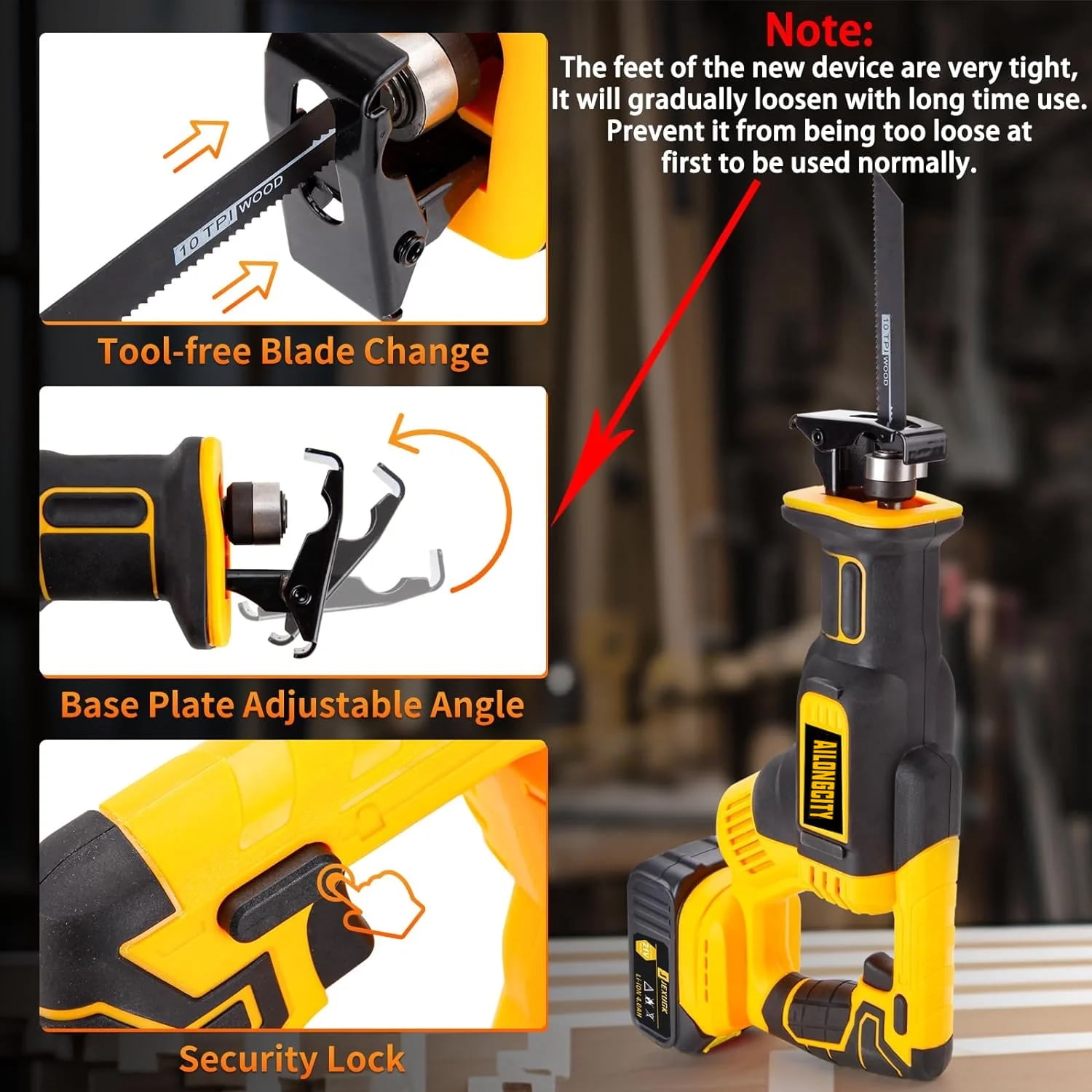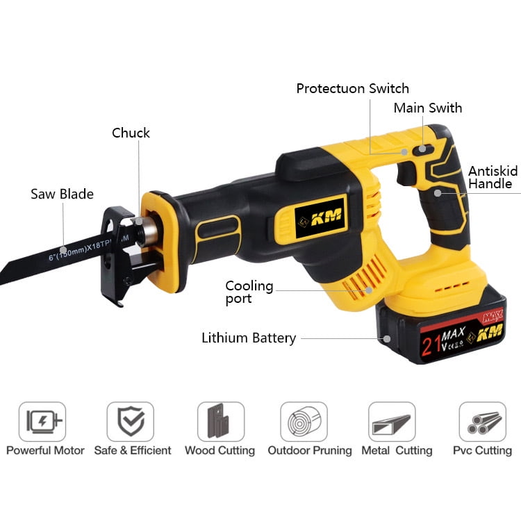 KMA 21 V Cordless Reciprocating Saw, 4.0 Ah, 3500 RPM _x000D__x000D_ _x000D_ Experience the power and versatility of the 21V Cordless Reciprocating Saw, designed to tackle a wide range of cutting tasks with ease _x000D_ Featuring a high-performance brushless motor, this saw delivers an impressive cutting speed of up to 3500 RPM, making it ideal for both heavy-duty renovations and delicate projects _x000D_ Its ergonomic design ensures comfort during extended use, allowing you to work efficiently without fatigue _x000D_ With the ability to cut through wood, metal, plastic, and more, this cordless reciprocating saw is your go-to tool for any job, whether you’re at home or on a construction site _x000D_ Enjoy the freedom of cordless operation and the convenience of tool-free blade changes, making your cutting tasks smoother and more efficient than ever _x000D_
