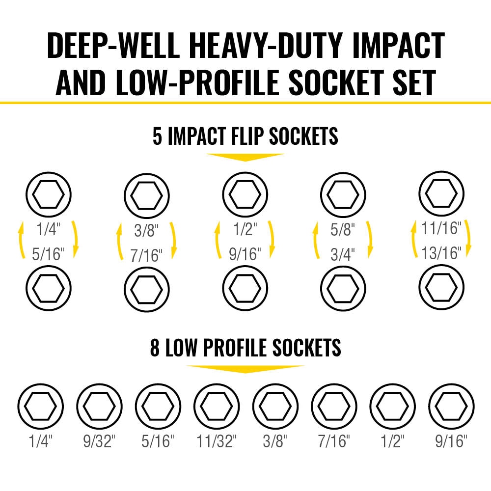 All components of the KNECT™ Impact Pass Through and Deep-Well Flip Socket Set are compatible with the 90-tooth pass through ratchet, offering minimal arc swing for tight-space ratcheting. Each impact flip socket features two coaxial sockets in one. Also comes in a compact, modular storage system with a clear lid that is compatible with MODbox™ and stackable with other cases of similar design.