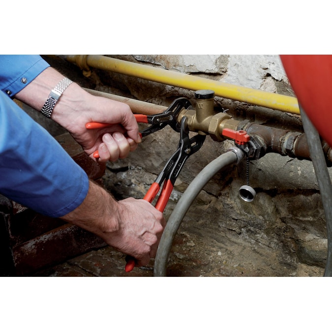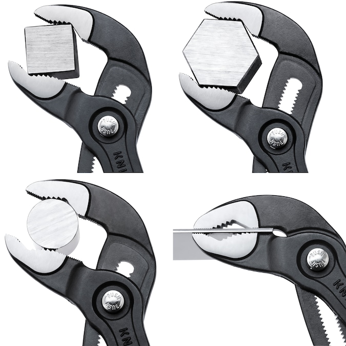 No more time-consuming test-adjusting to achieve the correct size. With the KNIPEX Cobra water pump pliers, you can simply position the upper jaw to the workpiece, push the button, and close the lower jaw. And you’ll also be able to say goodbye to blood blisters you get with other gripping pliers. With safety its first priority, KNIPEX has designed a built-in pinch guard that prevents blood blisters on your hand. The unique self-locking adjustment and induction hardened gripping teeth means that once it’s set, it stays. There’s no slipping and no need to waste strength squeezing the pliers — ensuring operator safety and more efficient work. Cobra’s unique jaw configuration can grip any shape object — flat, round, hex, or square. It also eliminates nut burring to avoid stripping pipes, nuts, or bolts. Additionally, the Cobra’s newly redesigned adjustment provides 30 percent more gripping capacity than previous models. A simple push of the patented push button adjustment maintains jaw size setting and gives you the correct size opening every time. Just position the upper jaw to the workpiece, push the button, adjust the opening, and close the lower jaw. And it’s easily done with just one hand for trouble-free operation in confined spaces. Cobra water pump pliers are constructed from chrome vanadium electric steel, an innovative high alloy, oil tempered steel that ensures longevity. And their thin head design helps you get into spaces other pliers can’t, so there’s no need to change tools when working in tight confines.