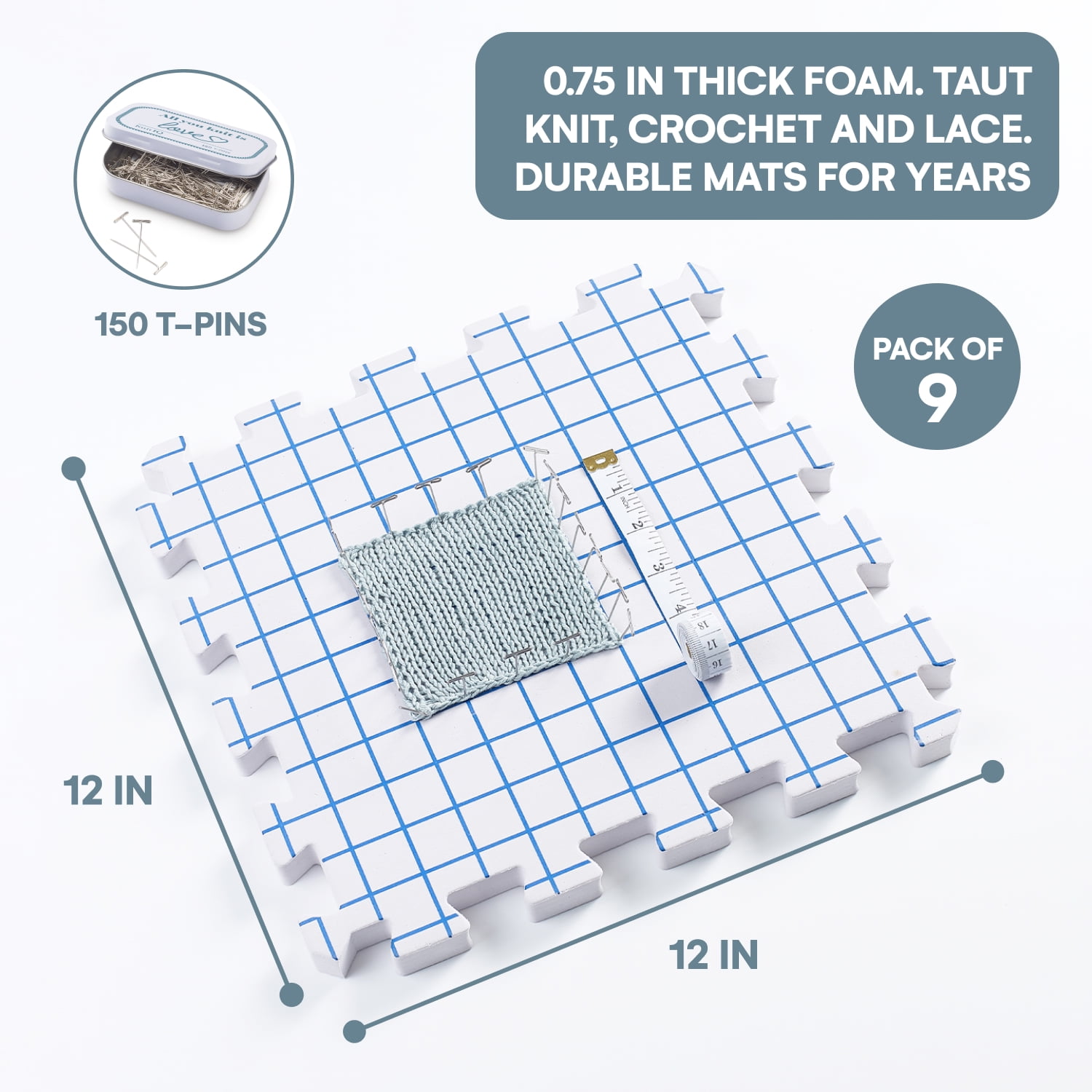 ASSEMBLE INTO DIFFERENT SHAPES AND SIZES. With a configurable design, the interlocking knitting blocking mats are easy to assemble in every direction and stay firmly in place. They allow you to create any layout for your project GRID LINES FOR PRECISE BLOCKING. Designed as a blocking board for crochet projects, these mats have grid lines to allow you to interlink the tiles perfectly and align the sides of your project along a straight line for an accurate, professional finish MADE FROM THICK, DENSE FOAM. The durable, lightweight foam is 0.75″ thick, allowing you to push down pins deeply and get a steady hold. The pins keep your knitting, crochet, needlepoint and lace work taut. The quality material on these knitting blocking squares offers lasting use QUALITY ROOMY BAG TO STORE BLOCKING BOARDS OR YARN. This lightweight but hard-wearing canvas bag provides plenty of room for your lace-blocking mats. You can also use it as a storage solution for your yarn, hooks, notions and various supplies. An exterior zippered pocket accommodates your T-pins. Its good quality protects your skeins and balls from dust and dirt for a long time INCLUDES 150 RUSTPROOF T-PINS IN ARTISAN TIN. These KnitIQ blocking mats come in a canvas storage bag with a durable artisan tin containing 150 stainless steel T-pins to complete your blocking tools. With sharp points and stainless steel, rustproof construction, the pins let you steam block your wet projects to perfection without causing damage to the yarn fibers