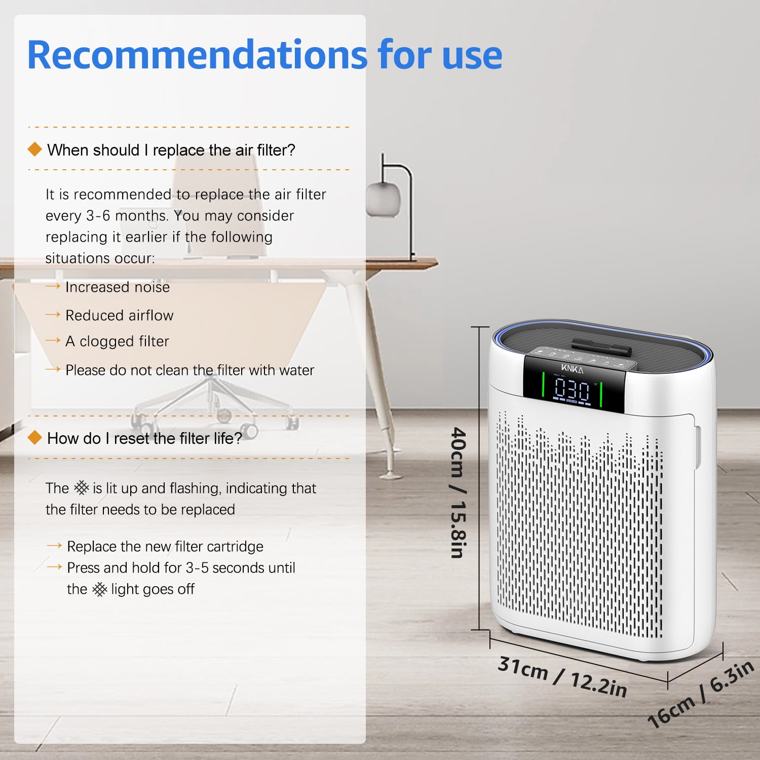 Breathe Clean, Live Fresh! KNKA air purifiers for home – Your Ultimate Air Purification Solution! Experiencing itchy eyes, stuffy nose, or difficulty breathing? These are all effects of air pollution! The KNKA HEPA air purifier removes 99.97% of mold, dust, pollen, and odors from the air, effectively reducing air pollution, improving air quality, and alleviating allergy and asthma symptoms. Additionally, this air purifiers for bedroom effectively captures pet dander and hair, making it an excellent choice for homes with pets. KNKA hepa air purifiers for home comes with an air quality detector that not only shows real-time PM2.5 levels in numbers but also uses different colored lights to indicate indoor air quality. The silent air purifier for dorm is user-friendly and easy to operate. In addition to touch controls, you can also smartly control it through the Smart WiFi APP, adjusting functions like operating time, speed, and scheduling. Of course, the KNKA large room air purifier also includes aromatherapy features. Each customer can customize their air scent by adding their favorite essential oils, which is extremely beneficial for achieving deep sleep at night! Breathe easy and choose the KNKA air purifier now! ►Product Specifications: CADR: 247 CFM (420 m³/h) Coverage Area: up to 2,500 sq. ft Filter System: Pre-fliter + True HEPA filter + activated carbon Air Quality Detection: PM2.5 display + air quality indicator light 5 Purification Modes: Auto mode, sleep mode, and 3 fan speeds Essential Oil Diffuser: Yes Timer: Yes Child Lock: Yes Filter Replacement Reminder: Yes Operation Modes: Manual/APP/Voice Noise Level: <15dB in sleep mode Product Certifications: CARB/DOE/FCC/CA65/CE/RoHS and complies with ETL standards. ►Package Includes: 1 * Air Purifier, 1 * Original HEPA Filter, 1 * Power Cord, 1 * User Manual ► Search “15174962285” or Click Here ✈ for More Replacement Filter