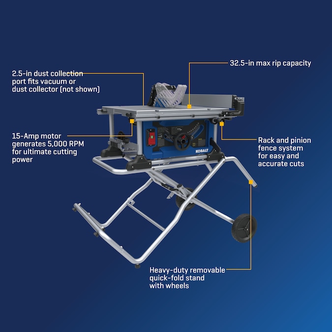 This 10 inch table saw is ideal for completing jobsite and workshop task generating 5,000 RPM for the ultimate cutting power. 32.5-In max rip capacity accommodates large pieces while the rack and pinion fence system delivers easy and accurate cuts. The heavy duty quick-folding stand with 8 in wheels helps with transporting and storing the table in your workshop.