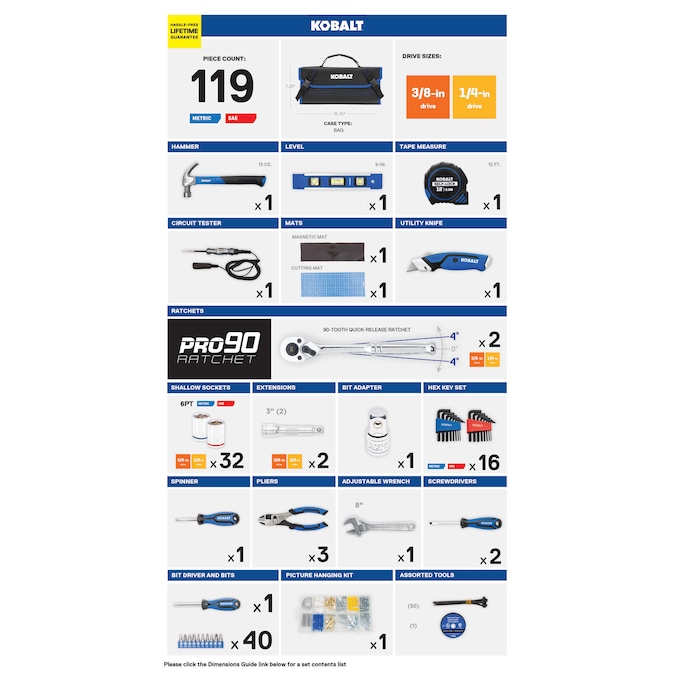 A bit more robust than our 73-piece general purpose tool set, this 119-piece household tool kit consists of 1/4-in and 3/8-in drive sockets and drive tools and accessories, giving you an advantage while making more advanced repairs at home or work.