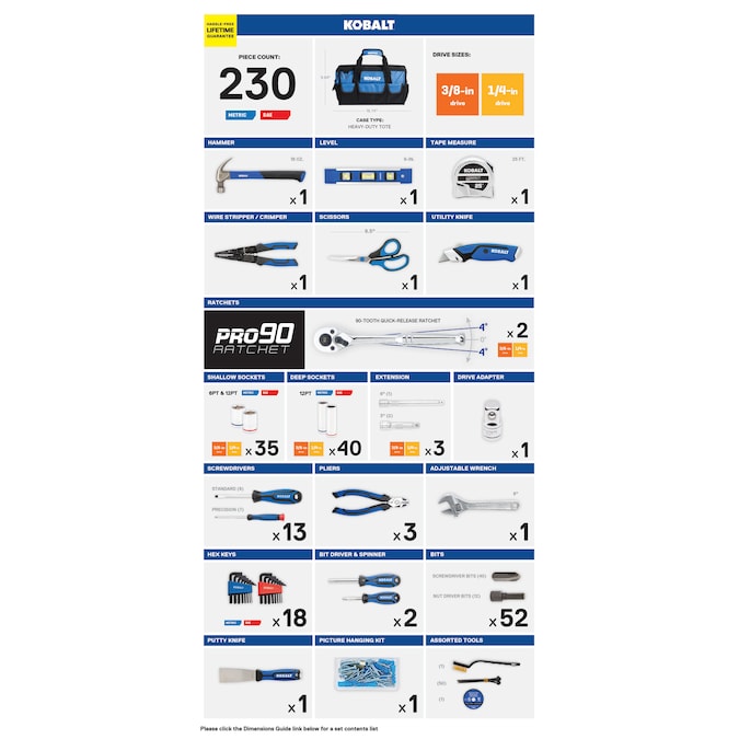 This convenient general purpose 230-piece metric and SAE home owner’s tool set includes 35 shallow sockets, 40 deep sockets, 2 quick-release ratchets, spinner handle, 3 extensions and a drive adapter. Also included are a tape measure, level, utility knife, scissors, putty knife, 13 screwdrivers, 18 hex keys, 3 pliers, an 8-in adjustable wrench, wire stripper, hammer, 41 assorted bits and driver handle, 50 cable ties and a soft-sided tool tote to complete any household or DIY project.