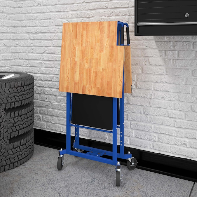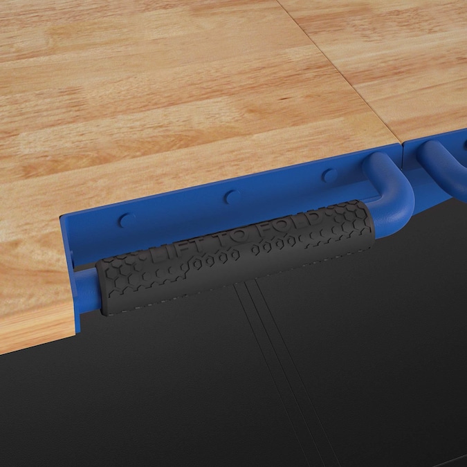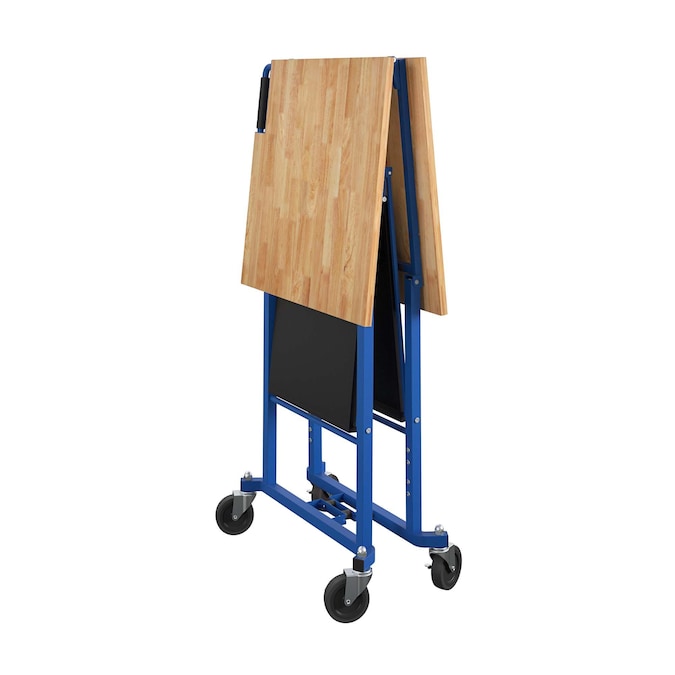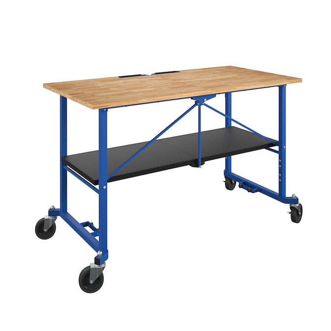 Take this folding portable workbench anywhere the work is. When your work is done, simply fold and store away. Made with industrial-strength steel, this utility table has a weight capacity of 400 pounds on the hard wood top shelf and 300 pounds on the bottom shelf. The four locking casters allow you to keep the workbench in place while you work. It folds in seconds, saving you time and storage space. With a large working surface and a place to store your tools, this versatile workbench is ready to handle any DIY project.