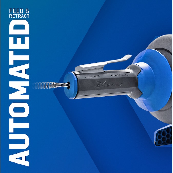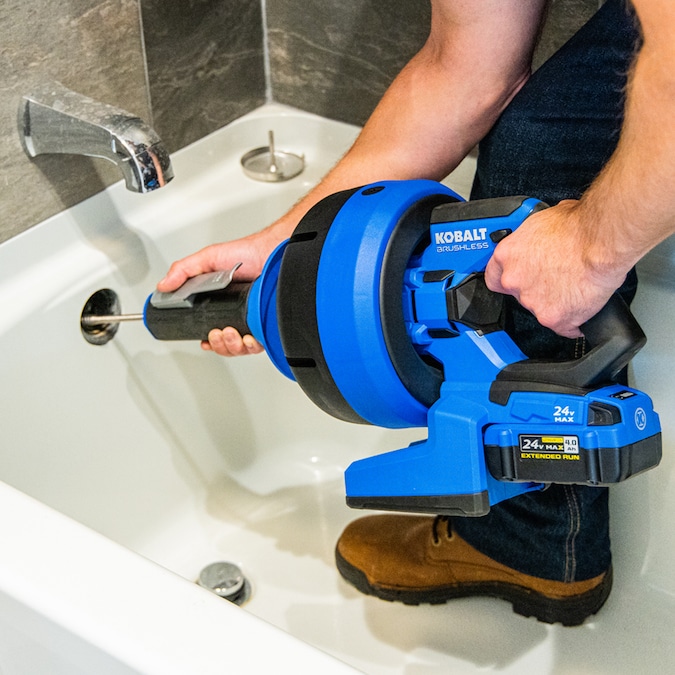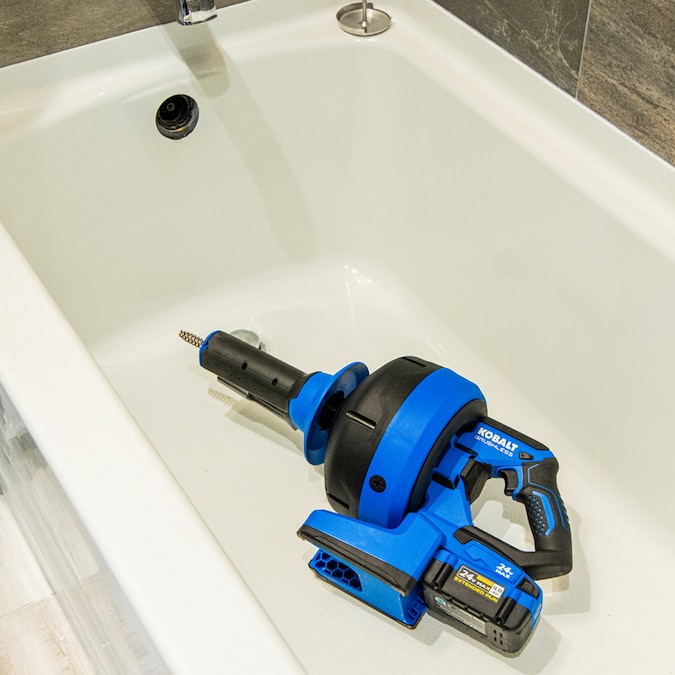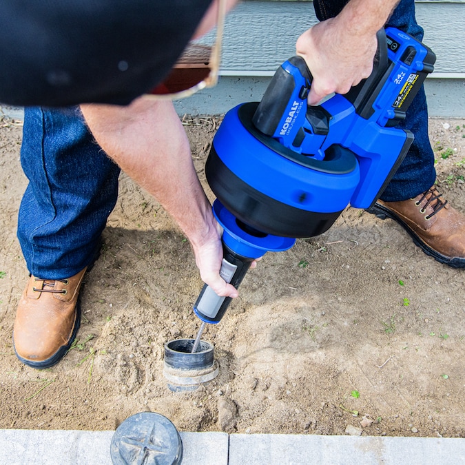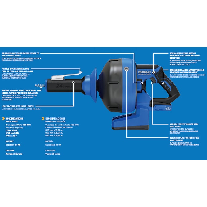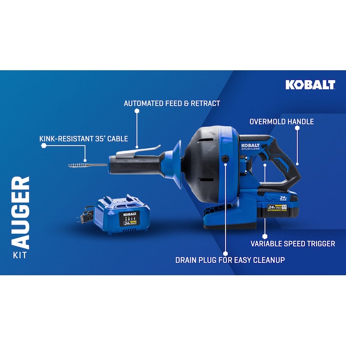 Tackle drain cleaning needs with this innovative new cordless handheld Drain Auger from Kobalt, powered by the 24v Max battery platform. This tool has the durability to power to tackle the most common drain cleaning applications for both jobsite and residential use. The powerful brushless motor provides the torque to power through tough clogs. Auto Feed quickly pushes the auger cable into the pipe and retracts the cable into the drum by simply pressing the paddle. The cable can be locked at one position so that the cable does not feed while while the blockage is being cleared. A variable speed trigger puts the user in control of the Auto Feed speed. The 5/16-inch diameter cable works well for drain cleaning of pipes with diameter between 1-1/4-inch to 3-inch while the 35-foot long cable is suitable for most single story residential homes. The cable is made from kink-resistant high strength spring steel and coated with Nickel for easy cleaning and to prevent rusting. The drum is equipped with one removable plug to provide the user with an option for easy cleaning and mess containment. The drum is capable of fitting up to a 5/16-inch diameter by 50-feet and a 3/8-inch by 35-feet long auger cable (sold separately). This tool is backed by a 5-year warranty and compatible with 75+ other tools in the Kobalt 24v Max platform. This kit includes a 4.0Ah Extended Run battery for optimal performance and all day use. The battery can quickly recharged in 90 minutes with the included charger.