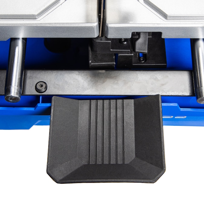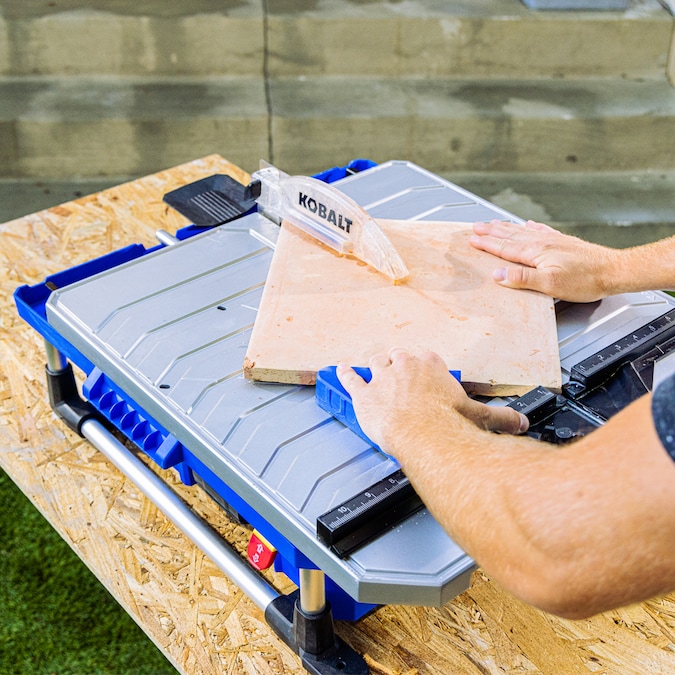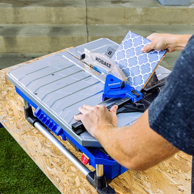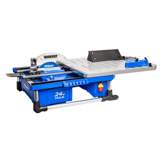 Enjoy the freedom of no cords with this innovative full sliding table tile saw powered by a Kobalt 24v battery. Setup is fast and easy, just insert a battery and pour water into the reservoir located under the table and you are ready to work. Eliminating the need to connect to a water source and AC power allows you to set the tool up right where the tile is being installed, reducing time lost walking outside the home to make the next cut. The innovative water feed system minimizes dust and mud splash of traditional tile saws. This tool is equipped with a brushless motor to deliver the power of a corded tile saw providing the ability to cut granite, porcelain, ceramic, concrete, and other stone materials. The Kobalt 24v tile saw features a full sliding table for maximum control and precision to make straight and smooth cuts. No more fighting with half-sliding tables that binds with the tile. This product includes a removable fence that can be locked into 22.5 degree and 45 degree miter locations or it can be fully removed for continuous rip capacity. A miter gauge attachment is included for custom angle cuts and a bevel attachment with 3 preset locations for 45 degree beveled cuts or chamfering the edges of a tile. At just 28 lbs bare tool weight, transporting to the job site is easy and the durable metal roll cage protects the tool. Blade wrenches, miter gauge, bevel attachment all store under the sliding table for added convenience. A 4.0Ah Extended Run battery and charger are included in this kit. Backed by a 5 year limited tool warranty and 3 year limited batter warranty.