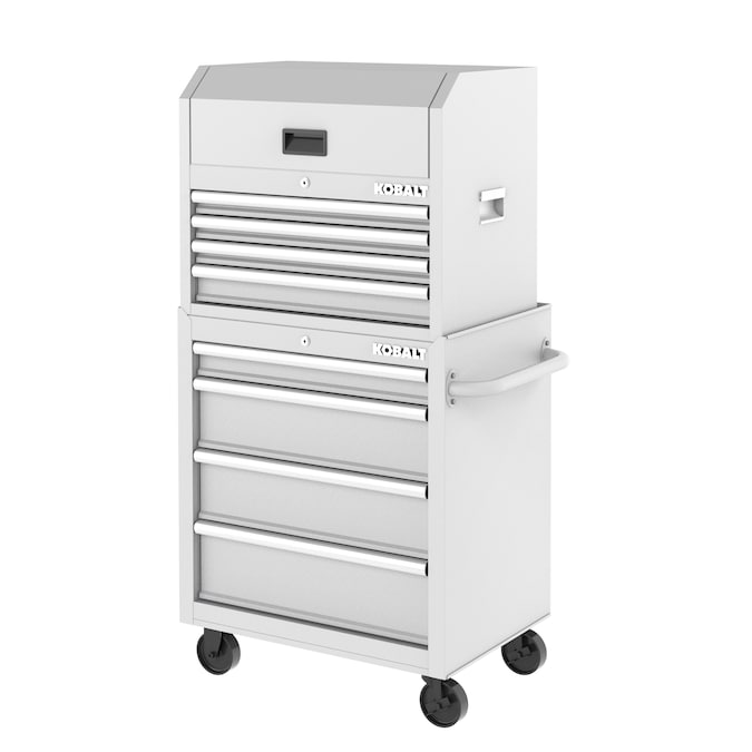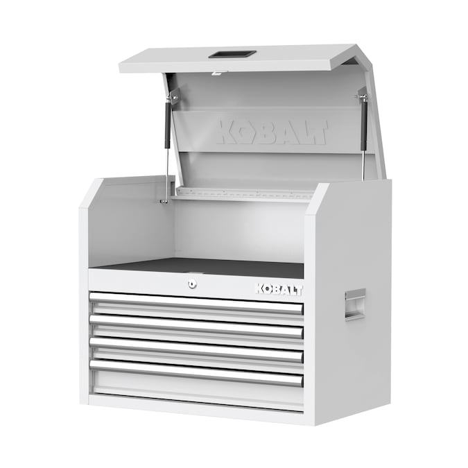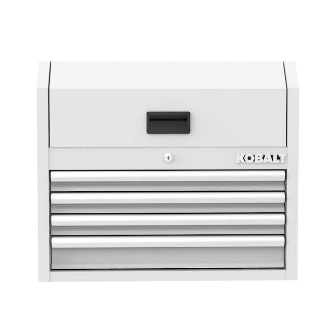 The Kobalt 26-In 4-Drawer White Chest is great for storing and organizing all your tools and hardware. The unit is made from high grade all welded steel construction with a tough, rust-resistant powder coat finish. 4 Drawers are all full-extension and glide effortlessly on ball-bearing slides that can support up to 50 lbs. you can charge your electronics and power tools even when the chest is locked via the integrated power strip with 4-outlets and 2-USB ports. The chest has lock system for added security. Pair this chest with the Kobalt 26-In 4-Drawer White Cabinet (item: 5215656, sold separately) to create the ultimate tool storage solution.