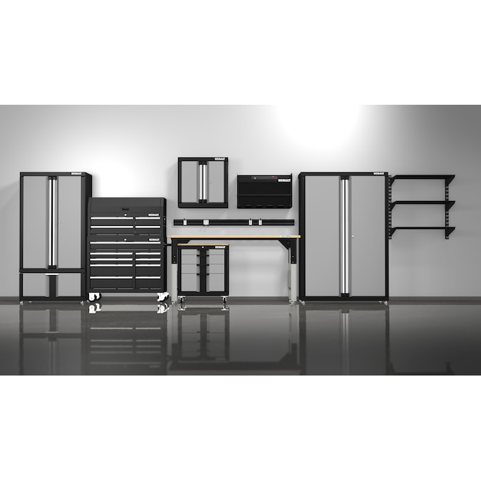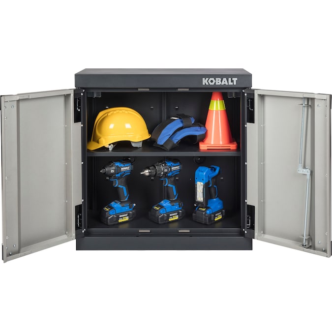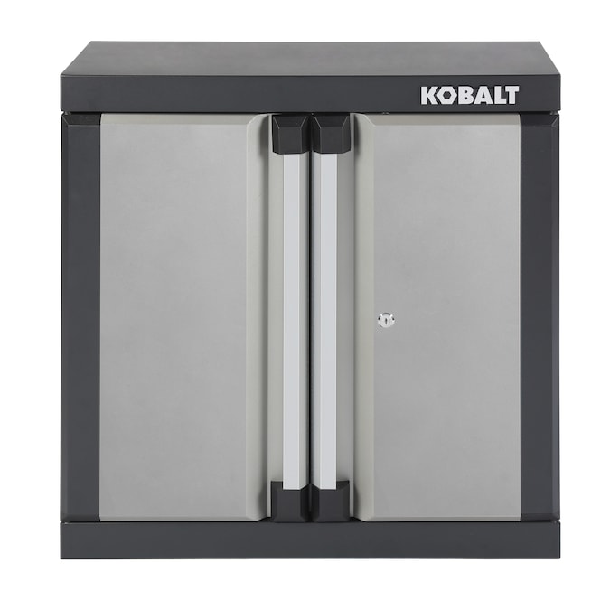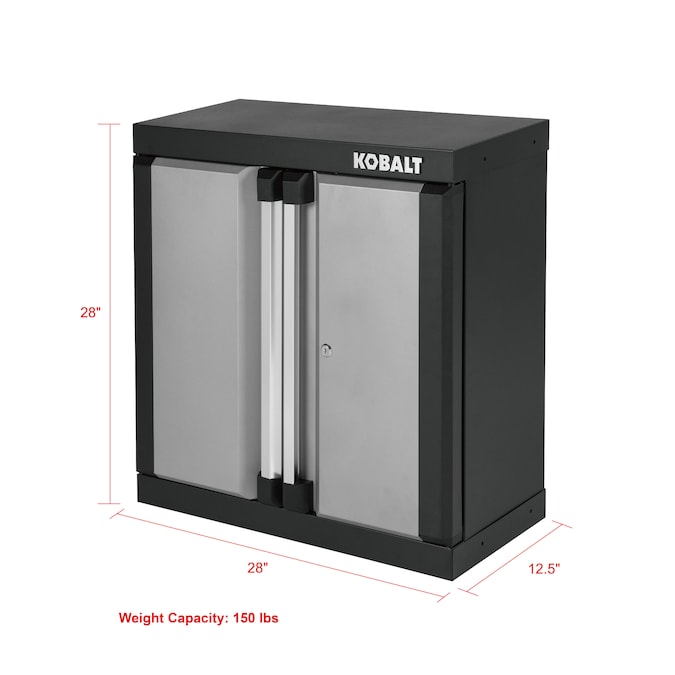 With heavy-duty construction and a powder-coated finish, this cabinet offers a durable storage solution for your garage. The 2-door wall-mounted cabinet is engineered for quick assembly and includes 2 shelves…one fixed and one adjustable. The doors are lockable for peace-of-mind security. Mounting hardware is included. This unit can also be mounted on the K-rail, which allows flexibility in your storage solution. Complete your garage suite with other pieces like the work table, floor cabinet, or K-rail hooks (each sold separately). Dimensions are 28-inches H, 28-inches W, and 12.5-inches D.